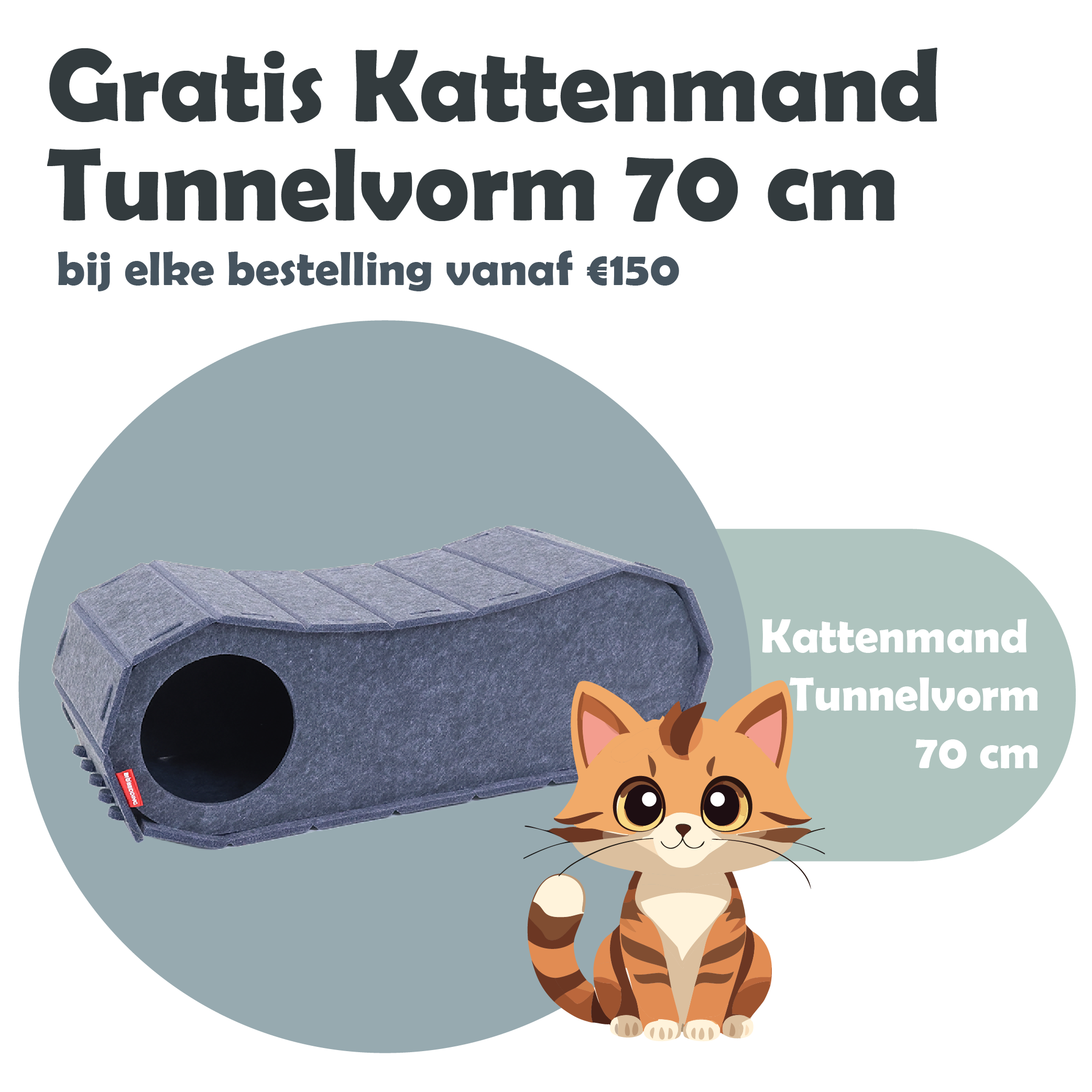 Bij elke bestelling vanaf €150 ontvang je automatisch een gratis Kattenmand Tunnelvorm 70 cm. Deze ruime en speelse tunnelmand is gemaakt van stevig vilt en biedt katten een comfortabele plek om te liggen, te spelen en zich te verstoppen. Het cadeau wordt vanzelf aan je bestelling toegevoegd zodra het totaalbedrag boven de €150 uitkomt.