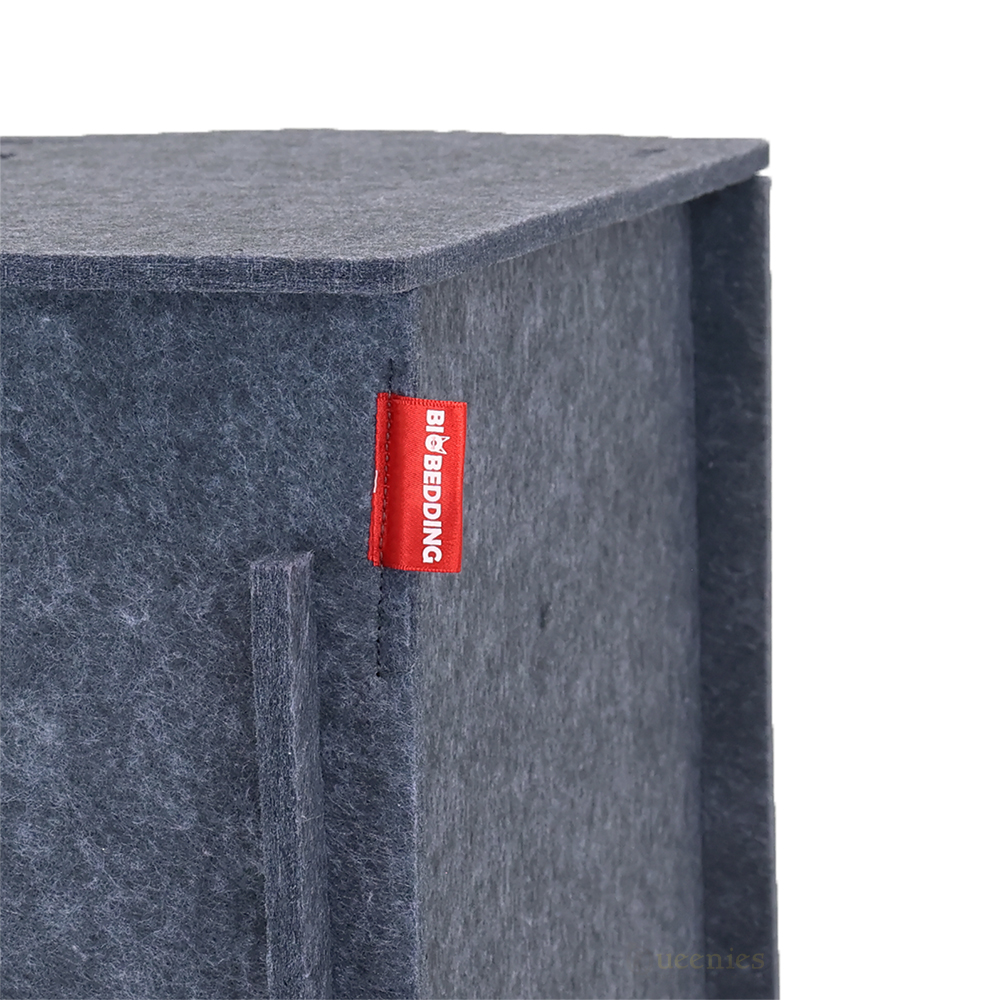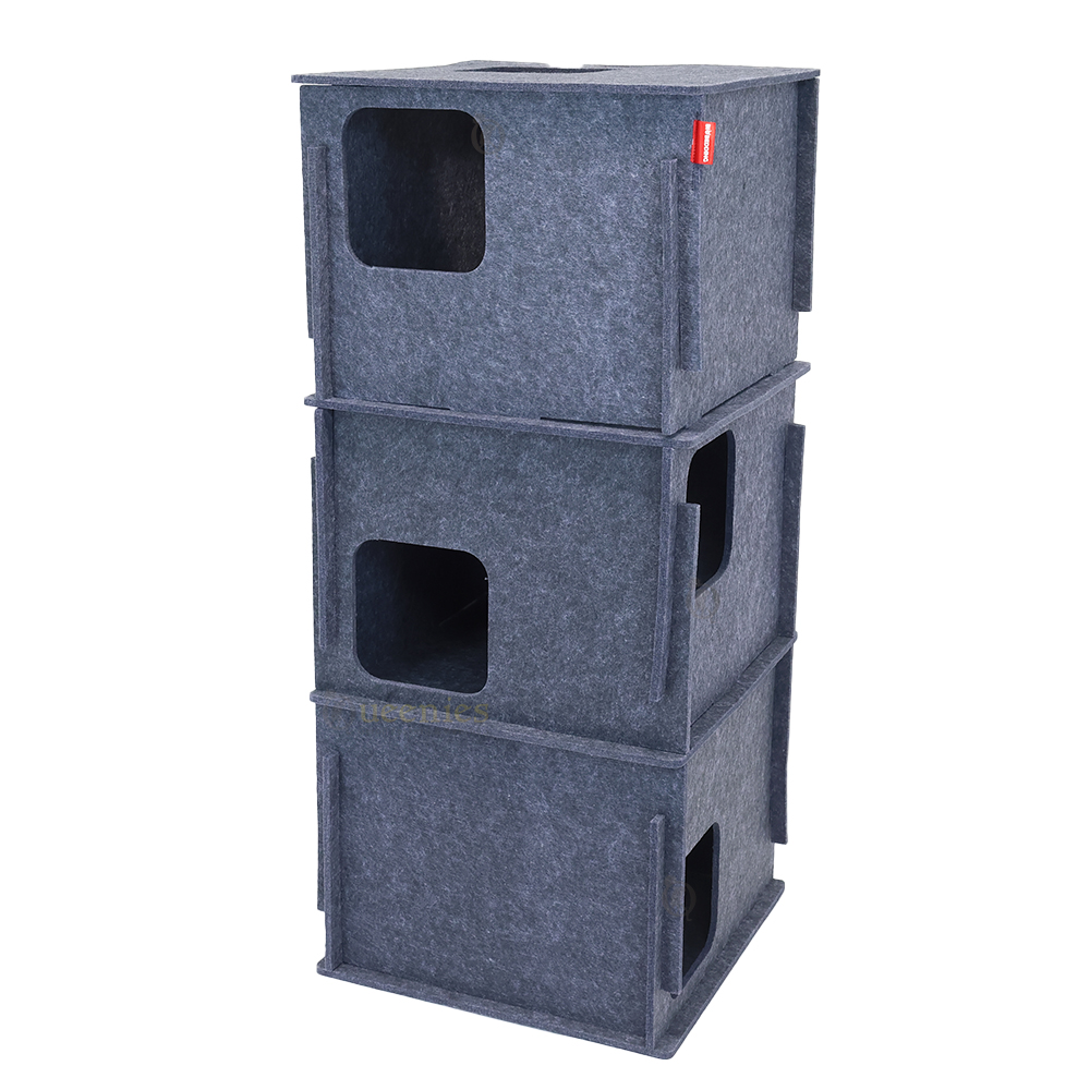 De Kattentoren XL is opgebouwd uit losse vilten panelen die samen een stabiele constructie vormen. Het stevige vilt voelt zacht aan en werkt geluiddempend, terwijl katten er ook heerlijk hun nagels in kunnen zetten om te krabben. Met de ruime ingangen kunnen katten makkelijk in en uitlopen, waardoor de toren veelzijdig inzetbaar is.