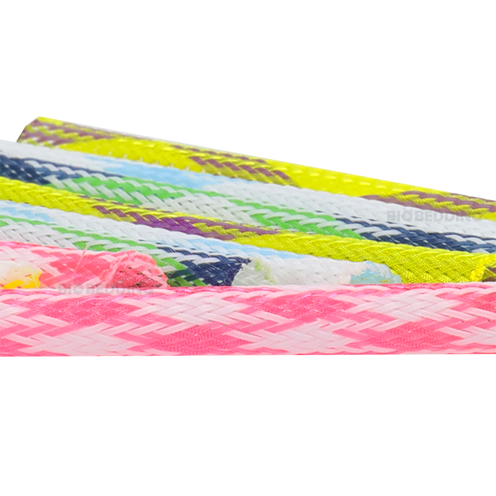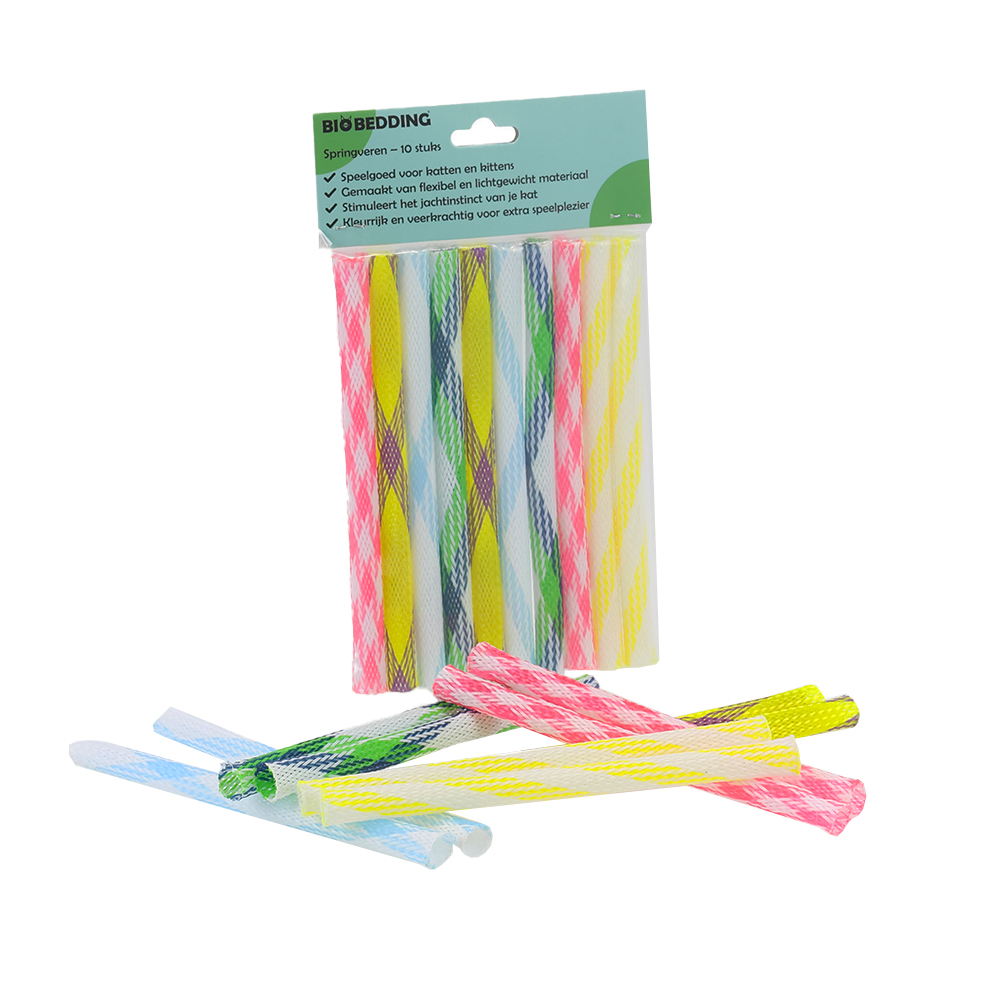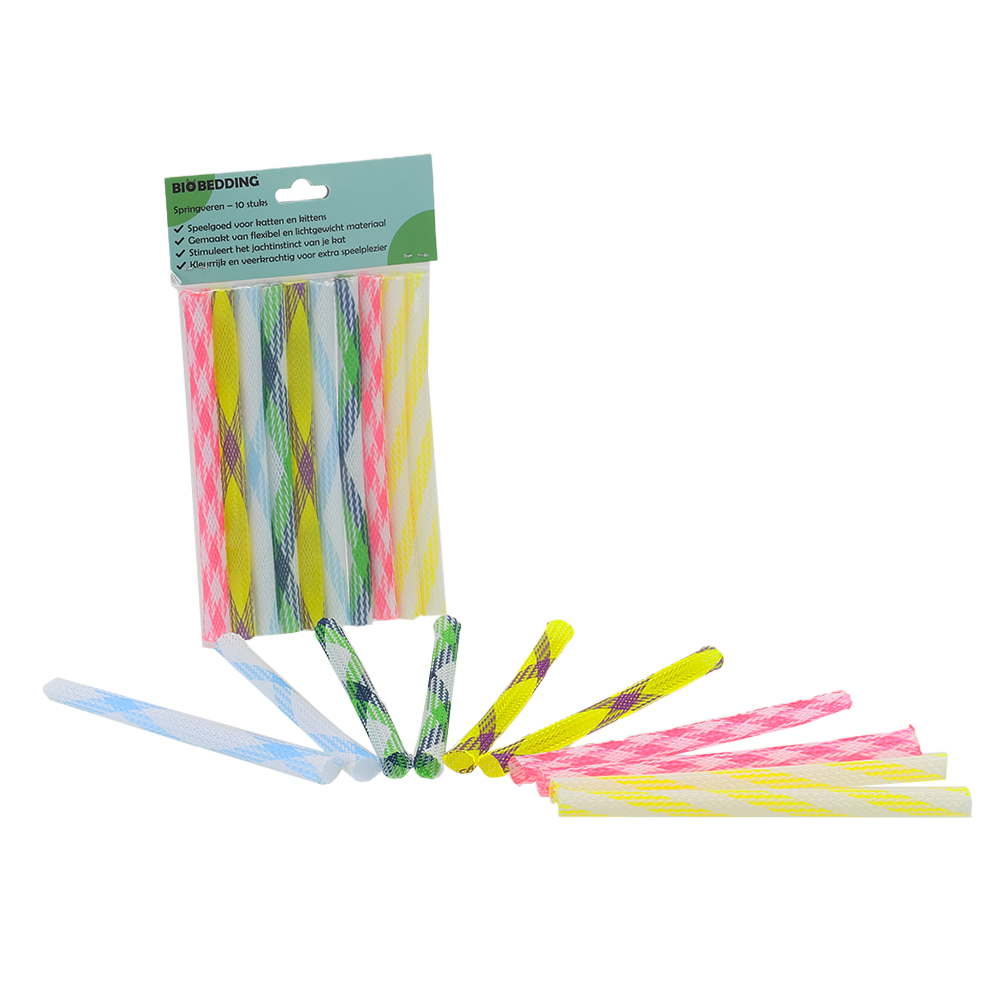 Inhoud: 10 stuksMateriaal: Gevlochten kunststof Eigenschappen: Speels, kleurrijk, flexibel, veerkrachtigGeschikt voor: Katten en KittensToepassing: Dagelijks kattenspeelgoed, jachtspel, binnen en buitengebruik
