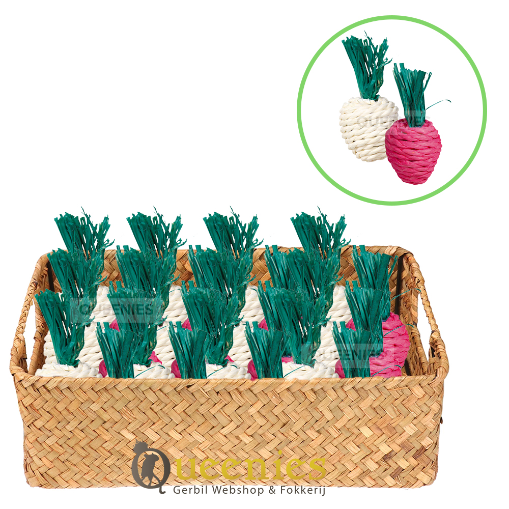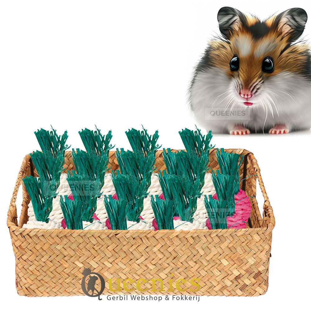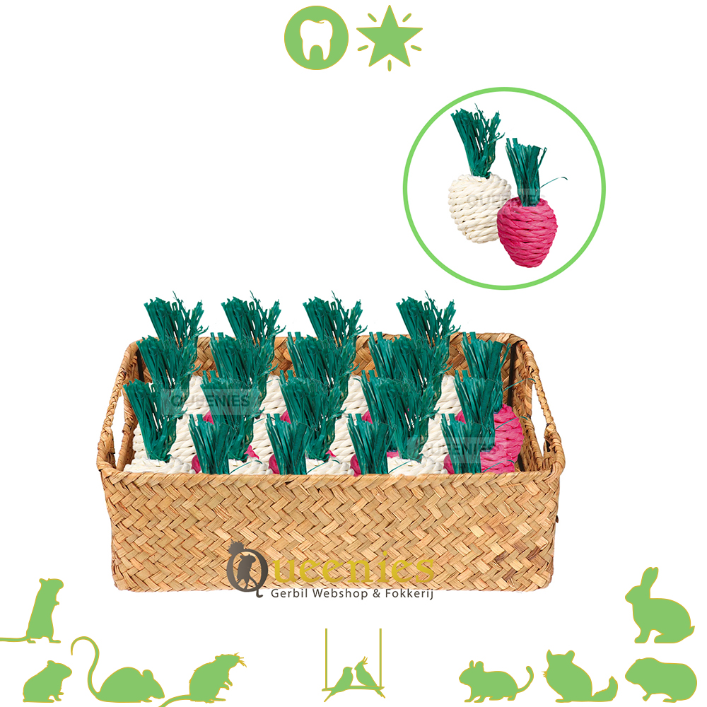 Wat ook erg fijn is aan het Bieten Knaag Speelgoed, is dat het volledig van veilige materialen is gemaakt voor Knaagdieren en Konijnen. Stro is een materiaal wat vaak terugkomt in speelgoed voor Gerbils en Hamsters. Dit komt omdat Stro goed is voor de tandverzorging bij Gerbils en andere Knaagdieren. Voor Gerbils, Hamsters, Muizen of andere dieren is het erg belangrijk om variatie aan te bieden in het speelgoed wat in het Terrarium / Gerbilarium ligt. Niet alleen ziet het Bieten Knaag Speelgoed er leuk uit, maar het biedt ook meerdere mogelijkheden om er mee te spelen. Konijnen en Cavia’s gooien het bijvoorbeeld in de lucht of gaan ermee aan de wandel in hun bekkie. Terwijl kleinere Knaagdieren zoals Hamsters en Gerbils het leuker vinden om aan het speelgoed te knagen. Daarom is het Bieten Knaag Speelgoed een hele goede toevoeging aan de speelgoed verzameling van Knaagdieren en Konijnen. Het is leuk voor klein en groot!