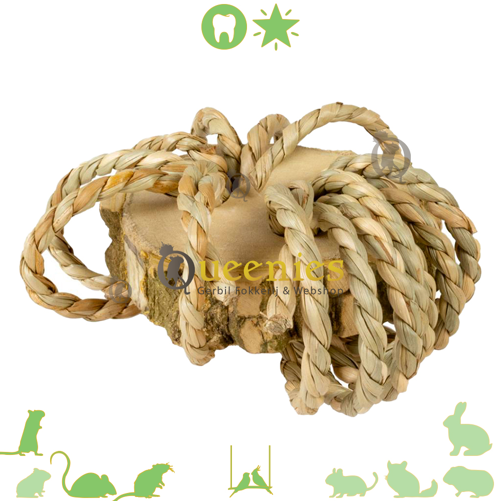 De boomschijf met Spinnenpoten is vervaardigd uit onbehandeld hout en touw van zeegras. Dat zorgt voor een stabiele basis waarop uw Hamster kan Knabbelen, Klimmen en Verkennen. De 'spinnenpoten', zorgvuldig gevlochten uit natuurlijke vezels en ideaal om aan te knagen of mee te spelen. Dit speelgoed is speciaal ontworpen om verveling tegen te gaan en de natuurlijke instincten van uw huisdier te stimuleren zonder dat het kwaad kan voor de gezondheid van uw huisdier.