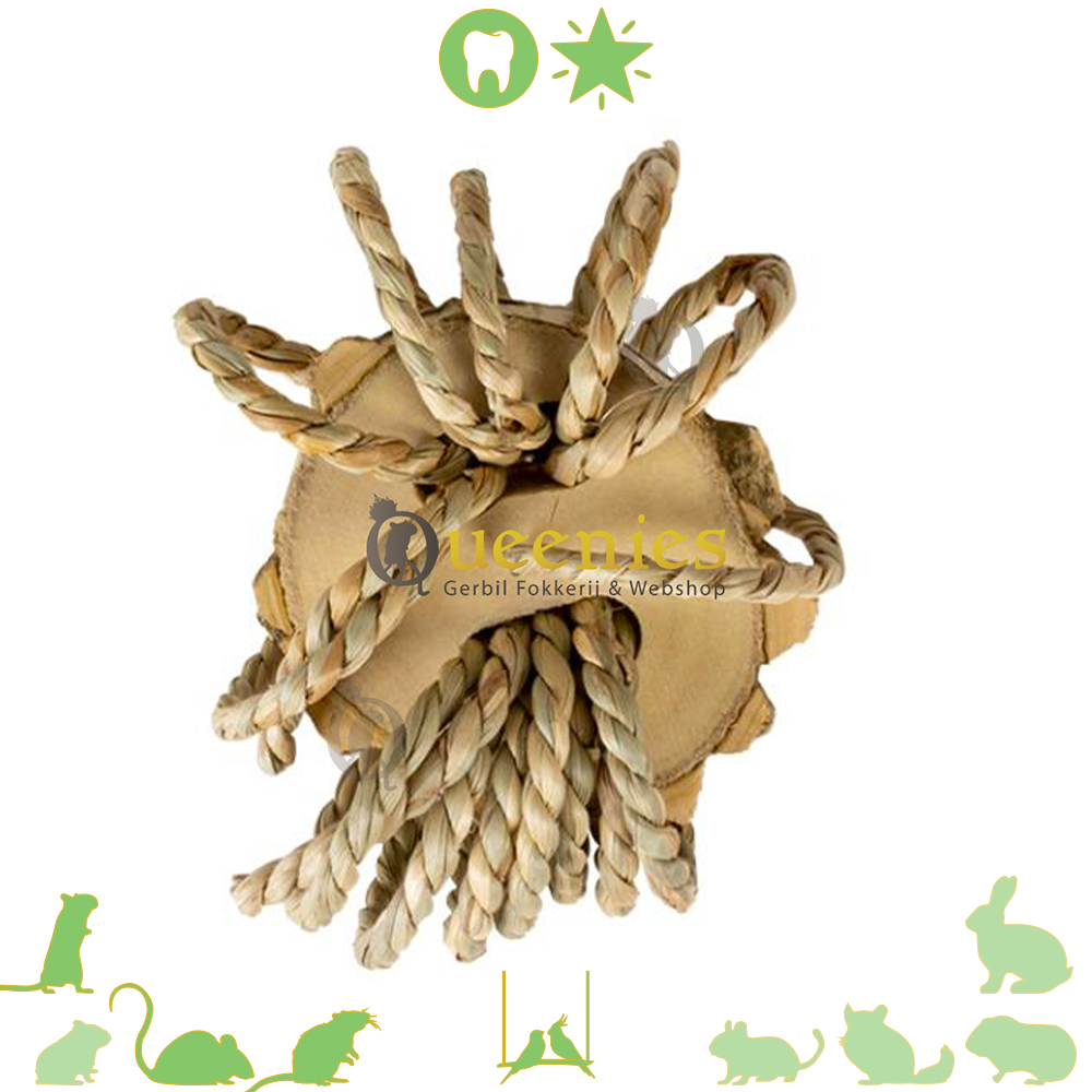 Zeegras is een plantenmateriaal dat bekend staat om zijn stevigheid en duurzaamheid. De Boomstam schijf steekt touw van Zeegras uit welke lijkt op de vorm van een spin. Deze Boomschijf is een verrijking van de leefomgeving van Knaagdieren en Vogels. De Speelrol is multifunctioneel doordat ermee gespeeld kan worden, erop geknaagd kan worden, of met het touw geravot kan worden. Deze speelrol stopt verveling en stimuleert het natuurlijk gedrag van uw huisdier!