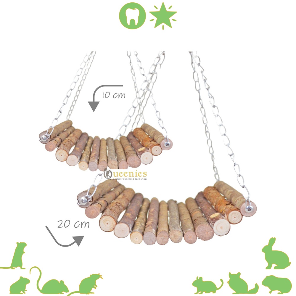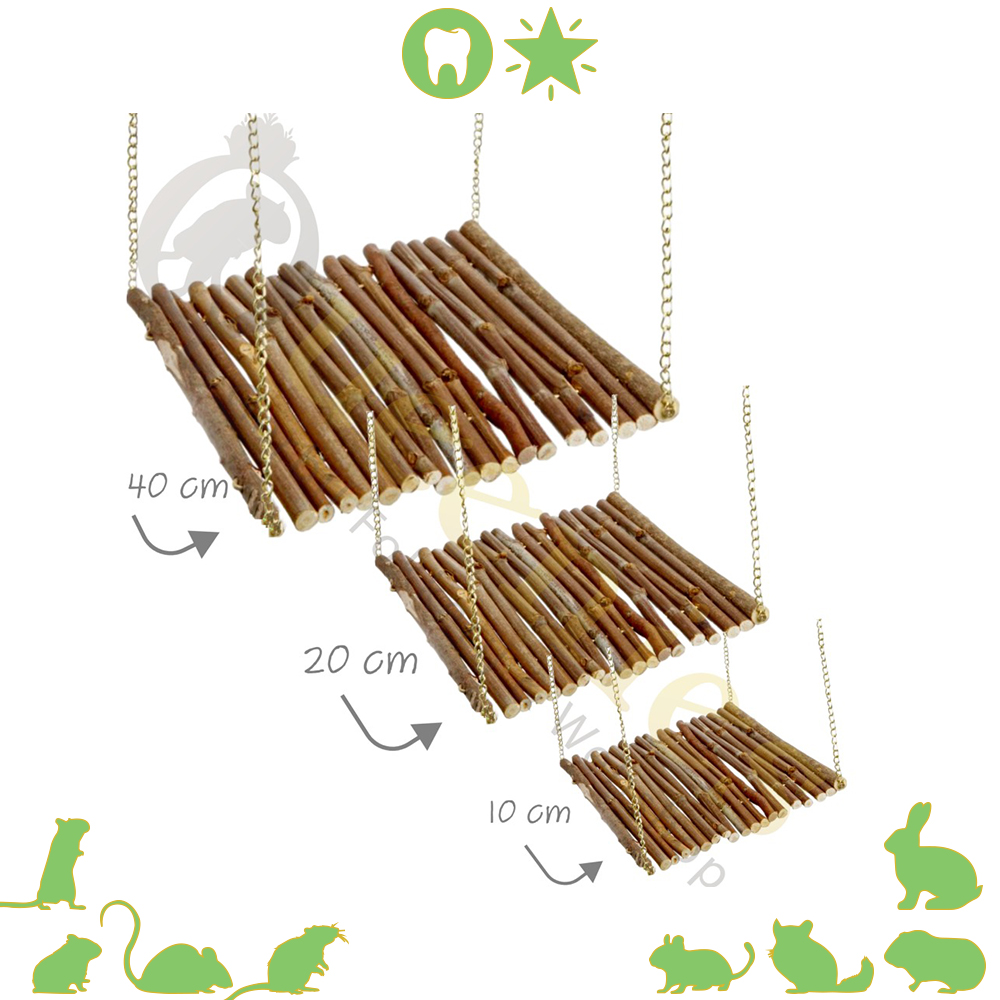 Deze Wilgen Hangbruggen zijn verkrijgbaar in 3 maten. De kleinste variant is 20x10 cm ( L x B ) en geschikt voor de kleinere knaagdieren zoals Gerbils, Muizen en kleine dwerghamsters. De middelgrote variant heeft de afmeting van 20x20 cm ( L x B ) en is ook geschikt voor de kleinere knaagdieren zoals Gerbils, Muizen en Dwerghamsters, maar ook geschikt voor de grotere Goudhamster of de middelgrote Ratten. Een volwassen mannetjes Rat is te groot voor deze hangbrug. De grootste variant Wilgenbrug met Kettingen heeft de afmeting 40x25 cm ( L x B ) en is geschikt voor alle soorten knaagdieren zoals hierboven omschreven met als toevoeging Cavia's en Dwergkonijnen en ook de volwassen mannetjes Ratten.
