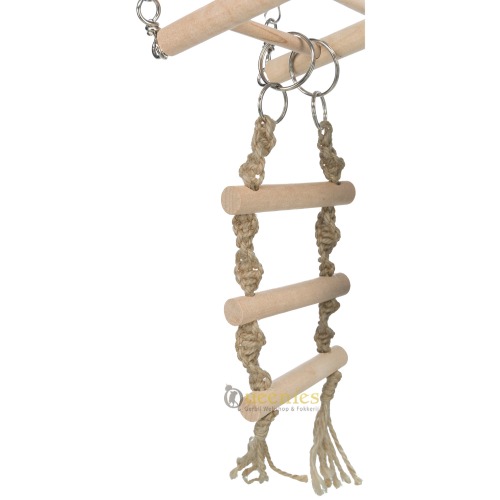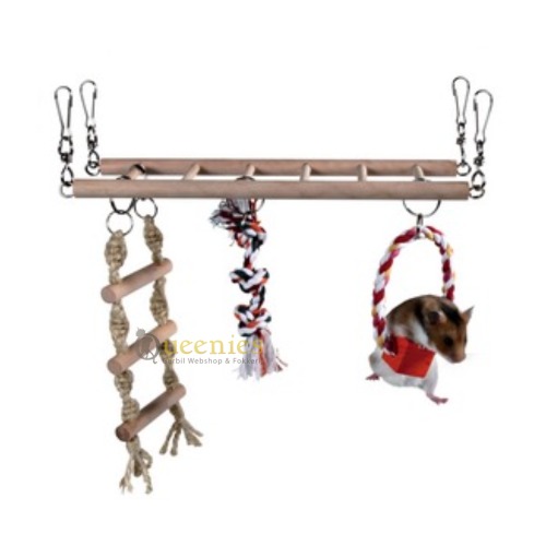 Deze Hangbrug 29 cm is erg leuk voor fanatiek klimmende Knaagdieren zoals Gerbils en Muizen bij uitstek zijn! Deze hangbrug heeft maar liefst 3 verschillende klimmogelijkheden voor de Gerbil. De houten touwladder geeft misschien nog wel de meeste uitdaging bij Gerbils, maar ook op de spijlen aan de bovenkant lopen bevordert het natuurlijke klimgedrag van de Gerbil of Muis. Muizen en Gerbils kunnen ontzettend goed klimmen vanwege hun staart. Dit geeft de Gerbils en Muizen balance. Een Hamster die geen staart heeft is om die reden een veel minder goede klimmer. Daarom is deze Hangbrug ook niet geschikt voor een Hamster. Deze Hangbrug van 29 cm biedt uw Gerbil of muis uren lang speelplezier.
