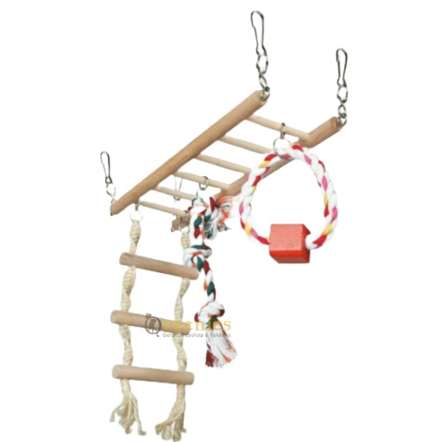 Afmetingen: ( L x B X H ) 29 x 25 x 9 Materialen: Hout, touw en ijeren kettingen Geschitk voor: Gerbils en Muizen