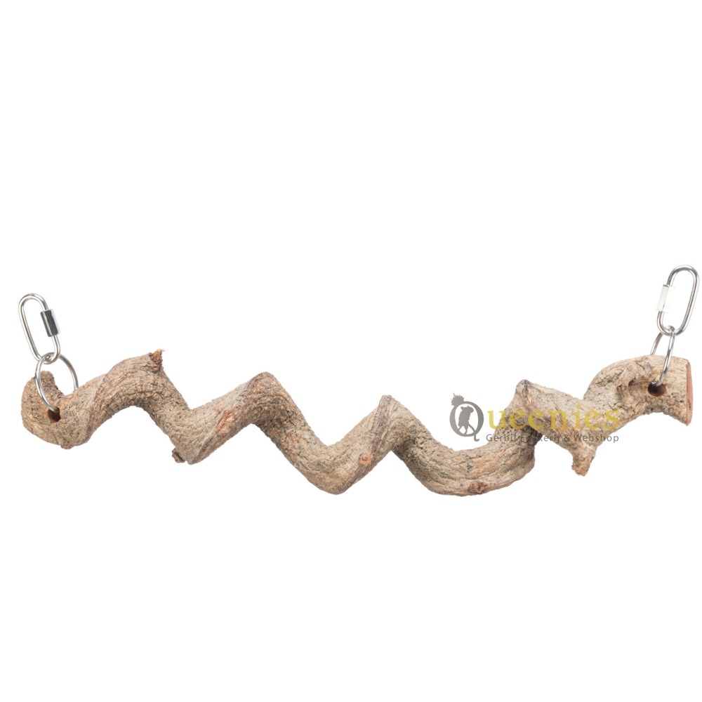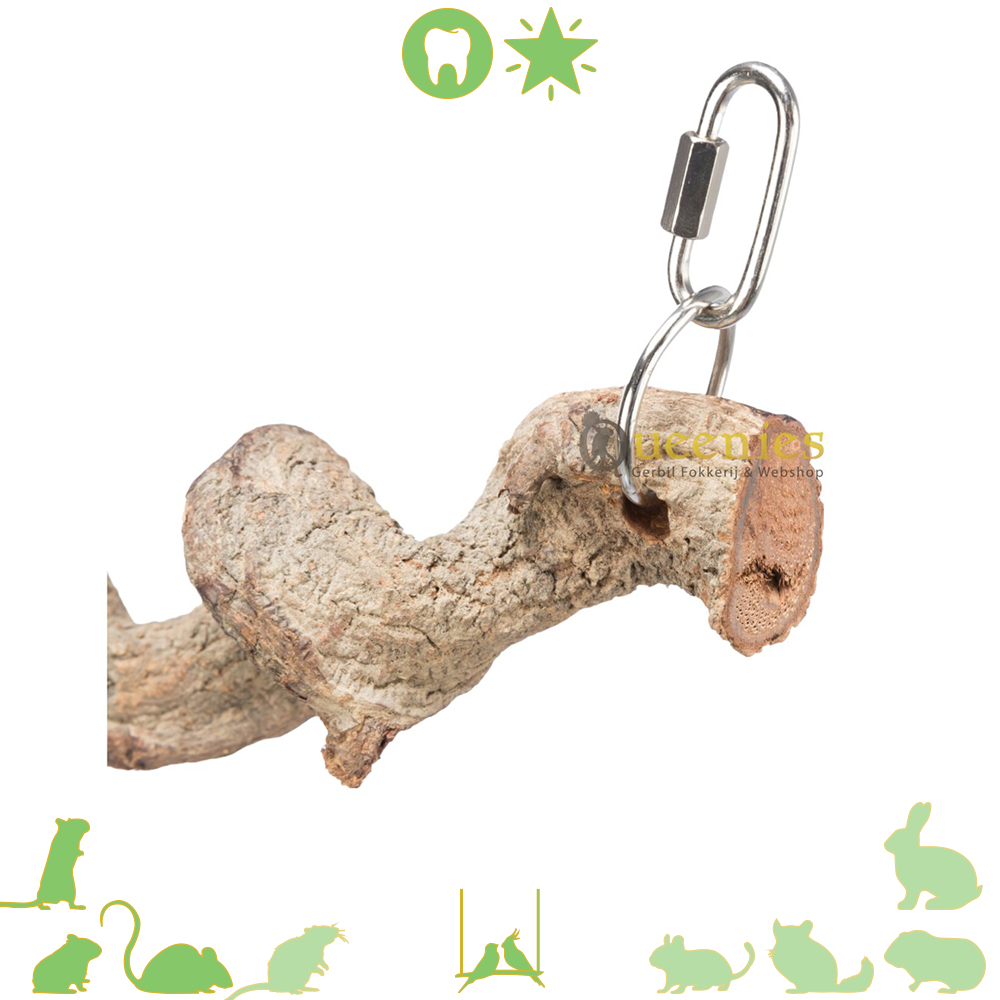 Doordat deze Hangtak 36 cm aan ieder uiteinde een karabijnhaak met schroefsluiting heeft kan het uitstekend opgehangen worden aan de desksel van uw knaagdierkooi, of wanneer u tralies heeft aan het traliehekwerk.Met een schroefsluiting kunt u het veilig dichtdraaien zodat het niet meer uit de deksel of van het traliehekwerk kan vallen.Wanneer u een Queenies gerbilarium heeft kunt u deze niet door het dak heen ringen. Hoe kunt u het dan wel gemakkelijk bevestigen? Maak een lusje in de deksel van ijzerdraad of met de witte vuilniszakken strips die meeworden geleverd bij een verpakking vuilniszakken en bijna iedereen altijd weggooit ;)Daarna kunt u deze hangbrug eenvoudig daarin ophangen.