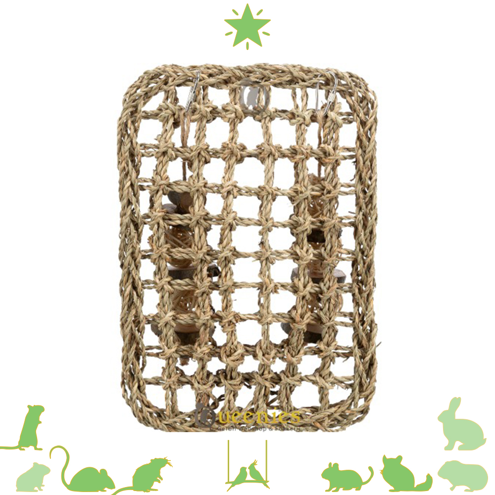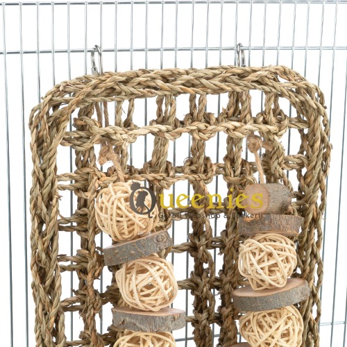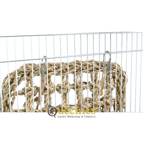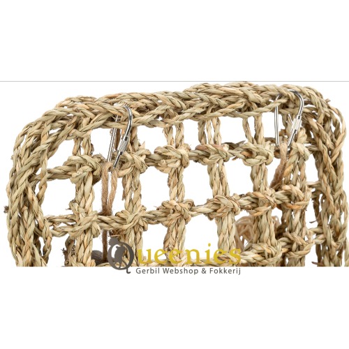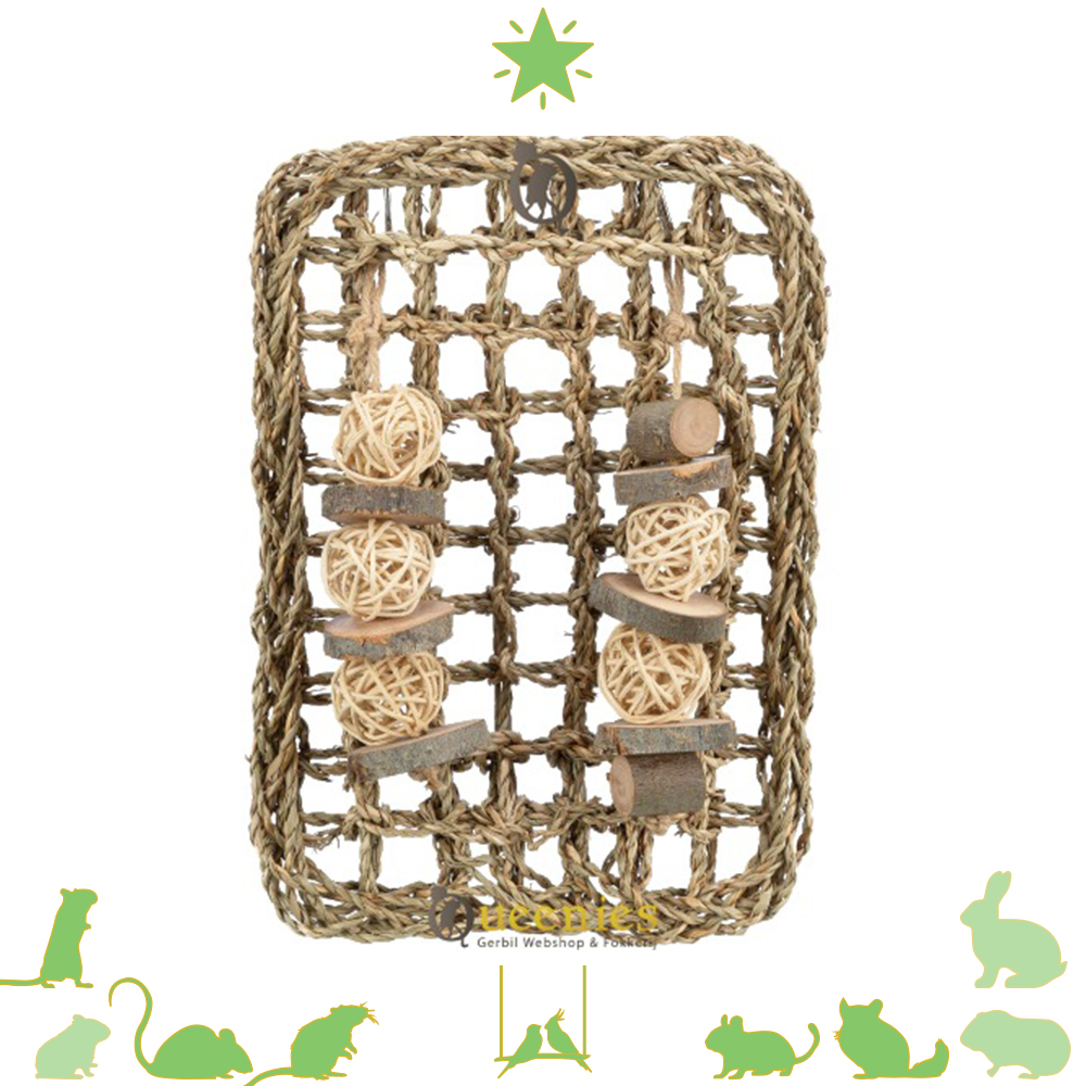 Een nieuwe variant van de populaire Klimmat van Zeegras, nu een Klimmat met speeltjes die eenvoudig opgehangen kan worden door de meegeleverde haken. Deze Klimmat is bij uitstek geschikt voor Knaagdieren zoals Gerbils en Muizen die erg van klimmen houden. De nageltjes blijven goed in de Klimmat van Zeegras haken zodat de dieren hier goed aan kunnen klimmen. De speeltjes halverwege geeft nog meer uitdaging aan uw huisdier. Deze klimmat kan ook goed gebruikt worden bij Konijnen of Cavia's. Zij zullen dan niet in de mat klimmen maar er rechtop tegenaan gaan staan om zo hun nageltjes te slijten. Precies zoals een kat dat ook doet bij een krabpaal. Naast het slijten van de nageltjes biedt uw uw Gerbil of Muis de mogelijkheid om via de mat omhoog te klimmen naar andere delen in het Terrarium / Gerbilarium. Handig in bijvoorbeeld het opzetstuk om de mat door de opening laten hangen zodat de Gerbils omhoog kunnen klimmen via de mat.