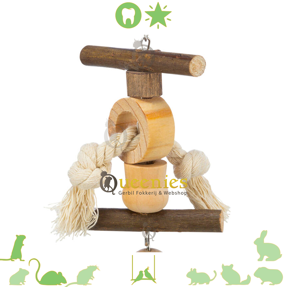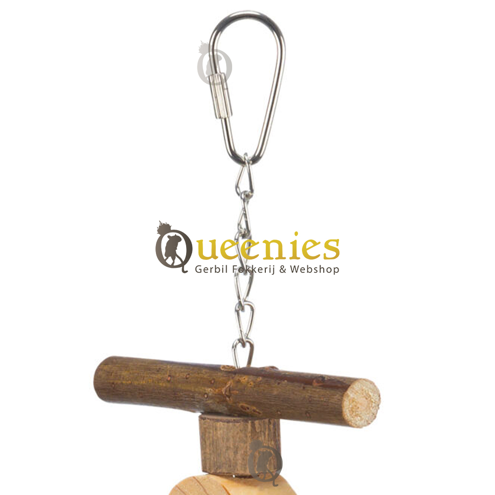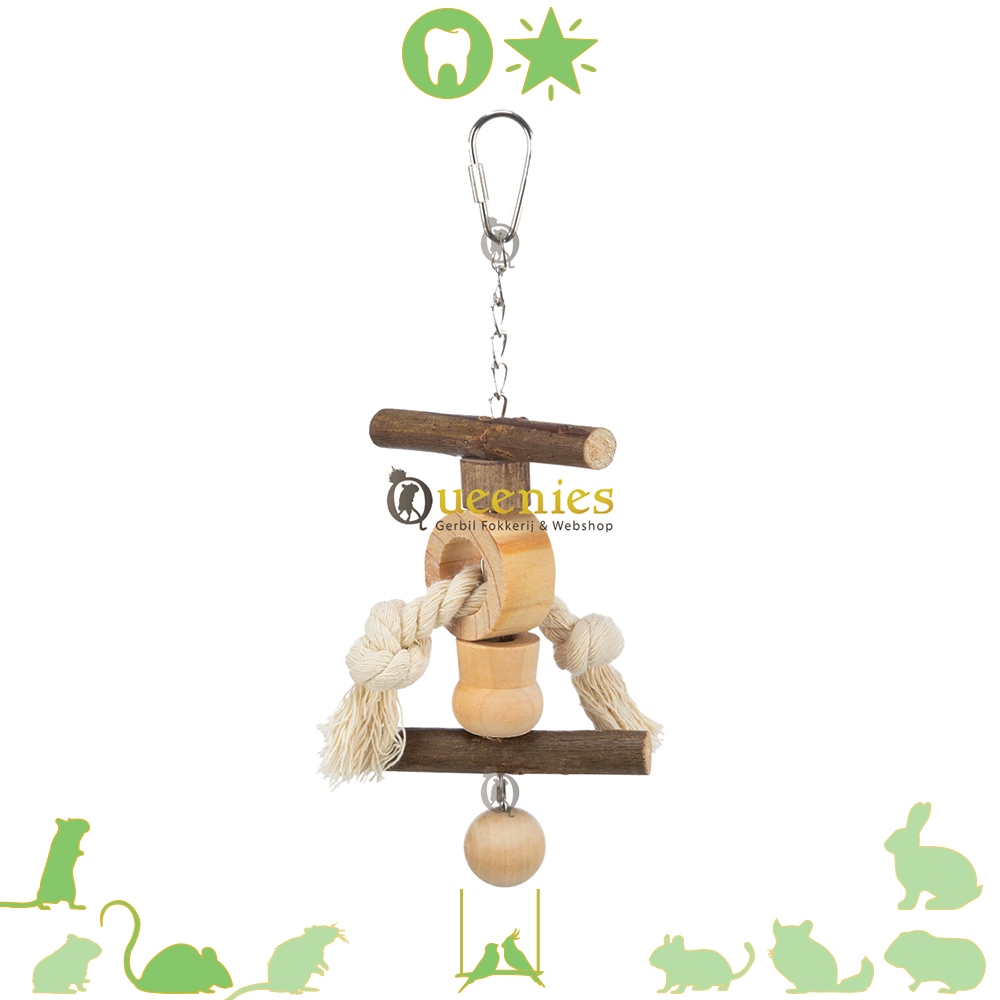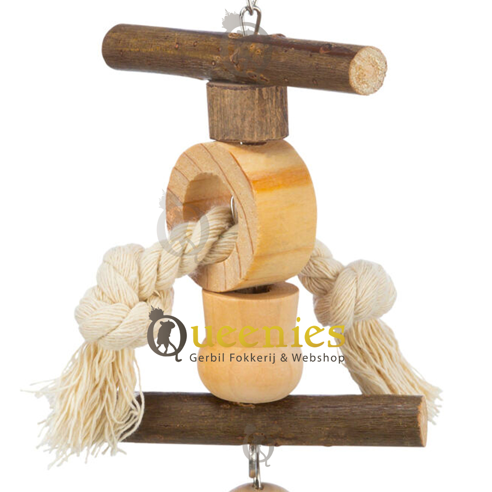 Afmeting: 20 cm lang Materiaal: Schorshout, touw en ijzeren kettingen Geschikt voor: Knaagdieren die goed kunnen klimmen zoals Gerbils en Muisjes. Of Vogels zoals Valkparkieten en Grasparkieten.