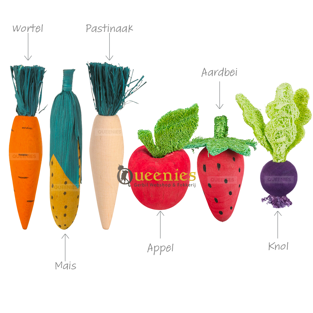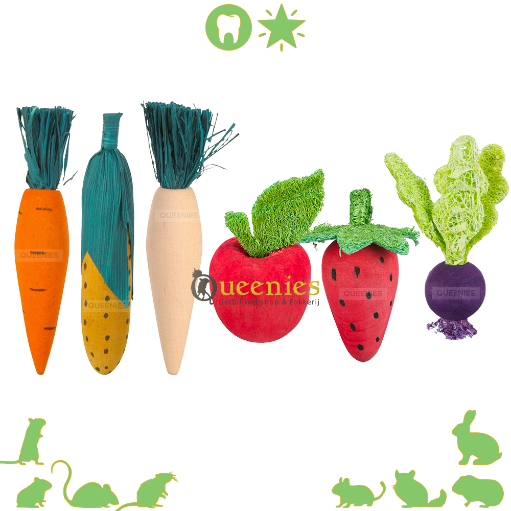 Het Knabbelhout verkopen wij in verschillende variaties, Wortel, Mais en Pastinaak als set. Aardbei en Knol ook als set. Appel verkopen wij los. Alle producten zijn in vorm van Groente of Fruit. Dit geeft een natuurlijke uitstraling aan het Knaagspeelgoed. Als alles bij elkaar ligt lijkt het net op een moestuin, wat er leuk uit kan zien voor Hamsterscaping. Maar het ziet er niet alleen leuk uit, het is ook ideaal voor Knaagdieren en Konijnen om mee te spelen. Gerbils kunnen bijvoorbeeld het Knabbelspeelgoed door het Gerbilarium heen slepen. Terwijl een Konijn het leuker vind om het Knabbelspeelgoed heen en weer te gooien.