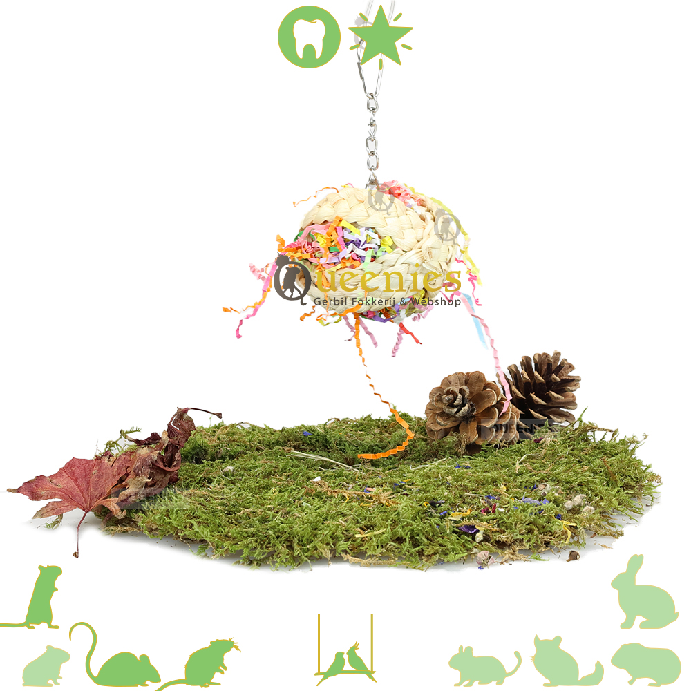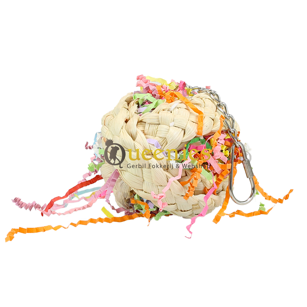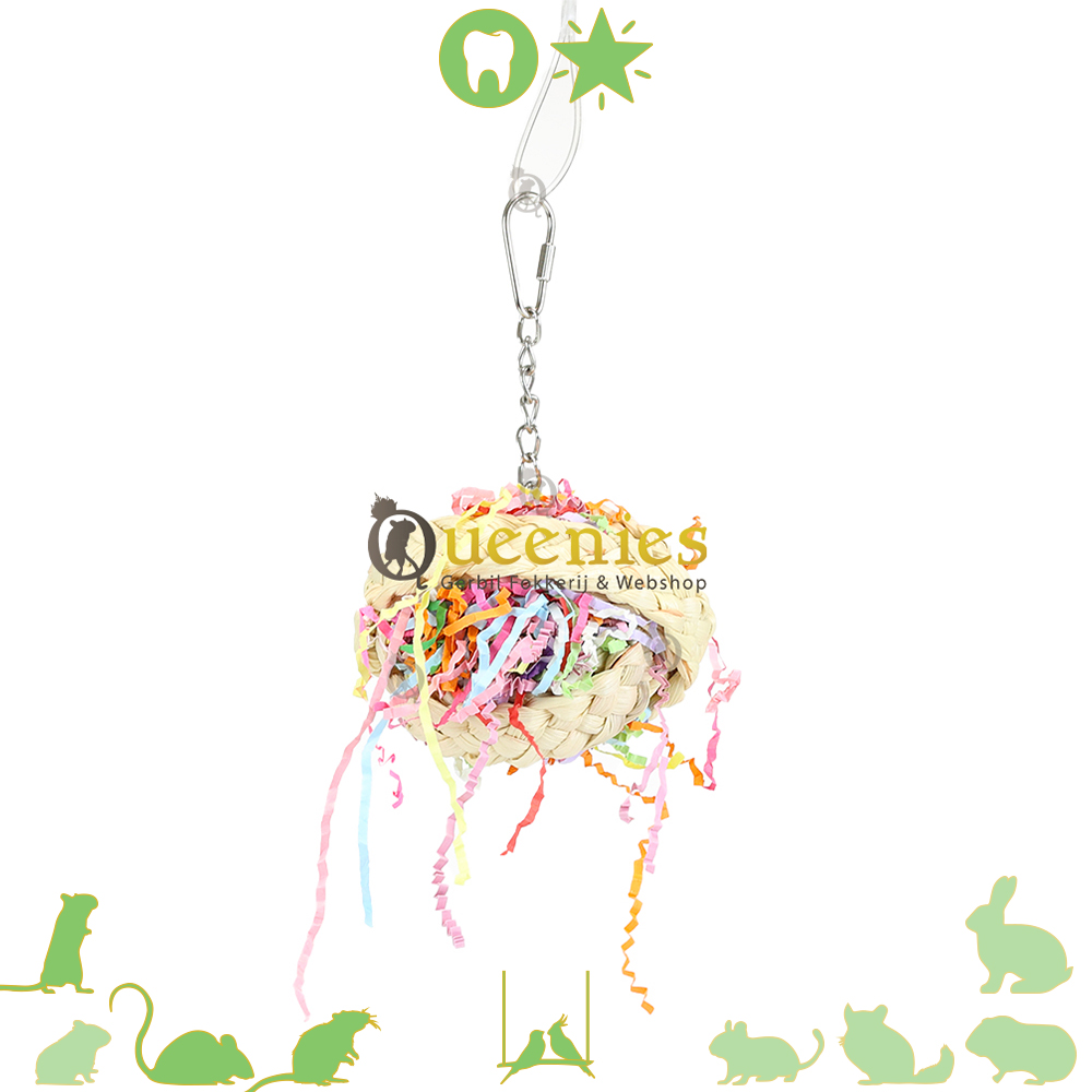 De Rotan Speelbal met Gekleurde Slierten is gemaakt voor Knaagdieren en Vogels. Dit handige ophang speelgoed is erg kleurrijk en trek aandacht van Knaagdieren en Vogels. Vooral nieuwsgierige Knaagdieren zoals Gerbils en Muizen zullen snel interesse tonen in de Rotan Speelbal. Voor Vogel is de Rotan Speelbal ook erg geschikt. Rotan is erg sterk materiaal en zal niet zomaar kapotgaan. Vogels zullen moeite hebben om de Speelbal kapot te maken en Gerbils en Muizen zullen er niet zomaar doorheen knagen omdat het al bungelt knagen niet snel wegknaagt. Doordat er op een speelse manier een speelbal wordt opgehangen wordt de aandacht van Muizen en Gerbils direct getrokken, meer hierover behandelen we in 'de Voordelen van de Rotan Speelbal' hieronder.