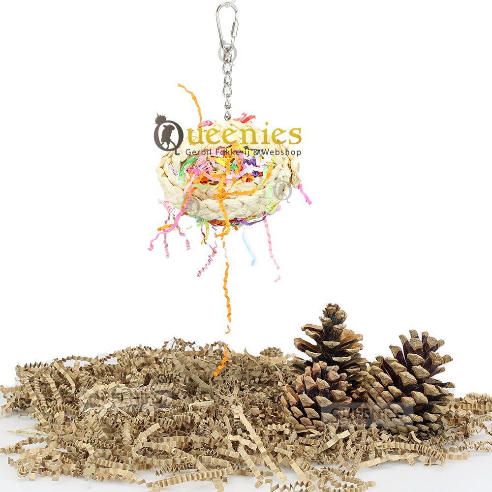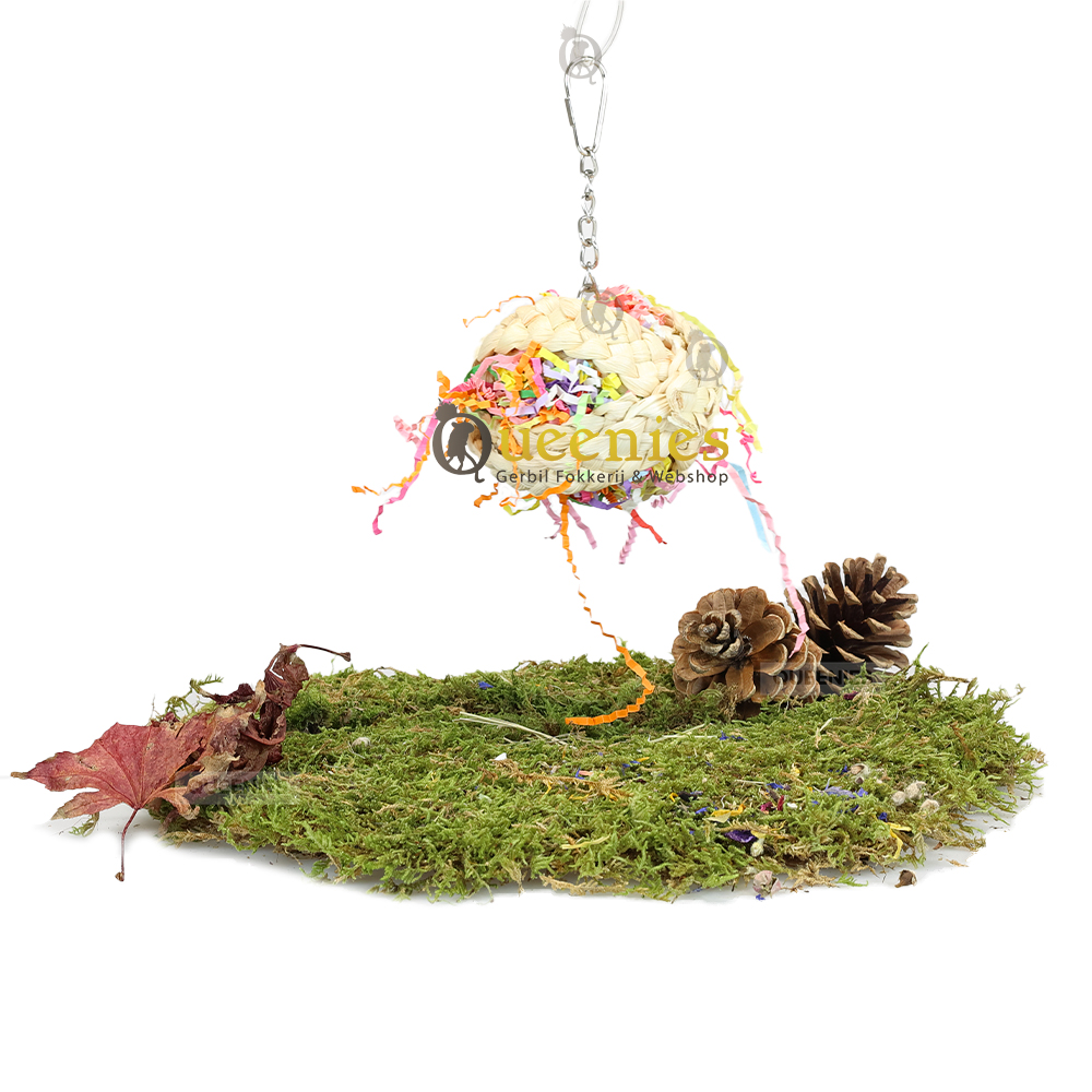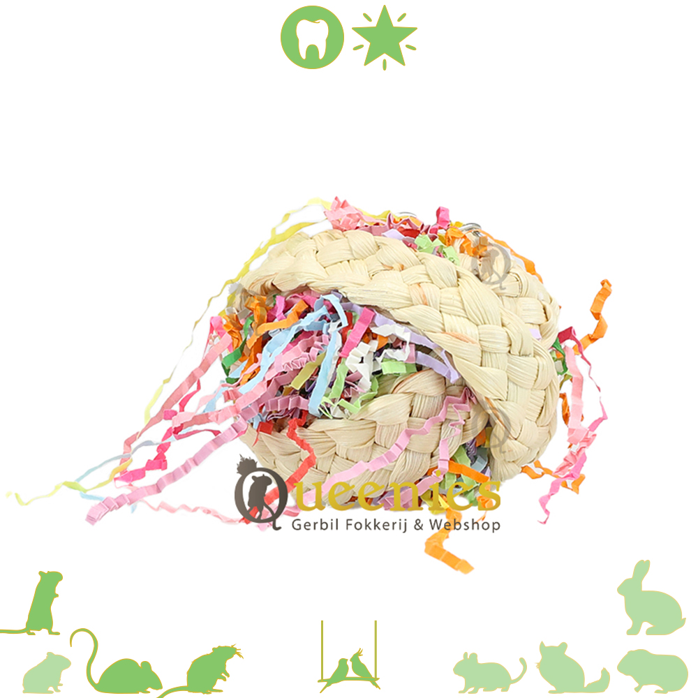 Wat een ander voordeel is aan de Rotan Speelbal, is wanneer Knaagdieren de bal toch kapot weten te krijgen. Kan de binnenkant worden gebruikt als nestmateriaal. De gekleurde slierten zijn gemaakt van papier, wat erg zacht aanvoelt. Gerbils kunnen de slierten dan gebruiken om hun nest mee te maken of aan te vullen. De verschillende kleuren van de slierten fleuren het Gerbilarium ook een beetje op.