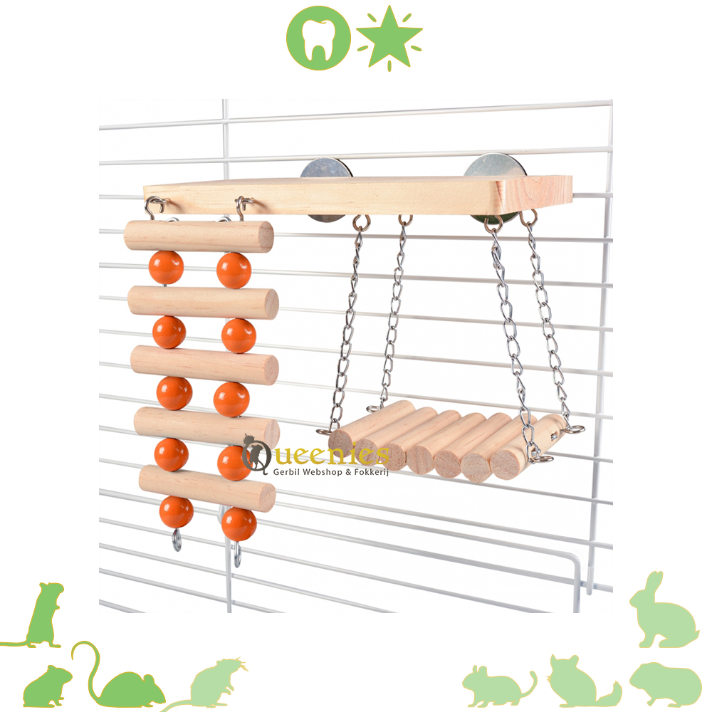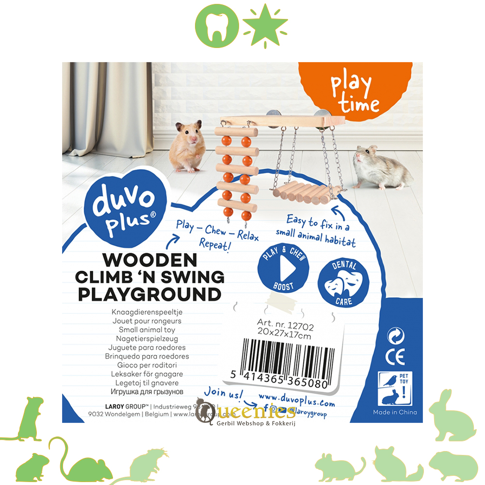 Deze leuke houten klim- & schommelspeeltuin van duvoplus is het ideale accessoire voor in je knaagdierenverblijf. Het gaat verveling tegen, bevordert het natuurlijke knaaginstinct en houdt hun tandjes gezond. De tanden van knaagdieren groeien immers voortdurend. Door het vele knagen houden ze de groei van hun tanden onder controle. Vervaardigd uit kwaliteitshout en afgewerkt met schors maakt dit een gezond en niet-te-missen speeltje voor in het verblijf. Het speeltje is gemakkelijk te bevestigen in elk verblijf met de musketons. Afmetingen 20x27x17 Beschadigd artikel: Er mist een haakje van de voorste klimwand.