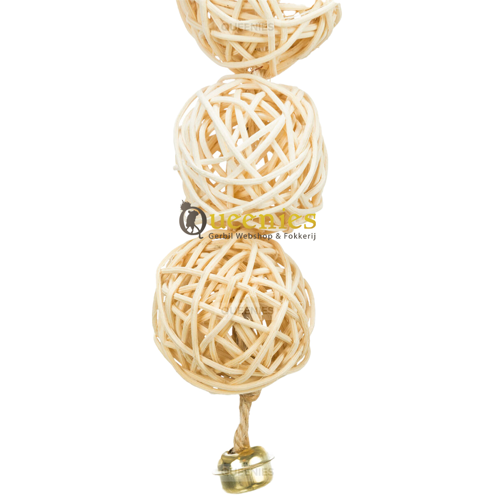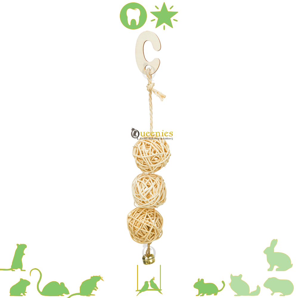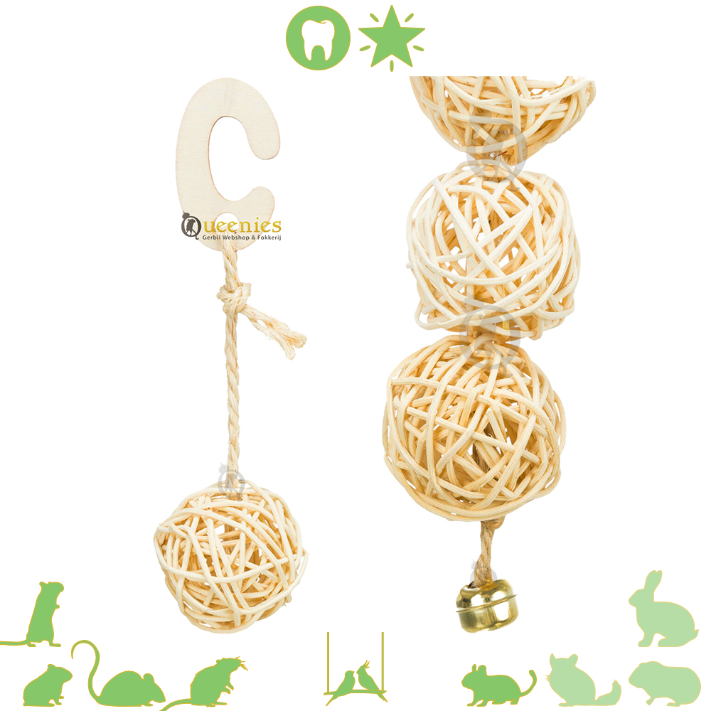De Slinger met Rotan ballen heeft onderaan een bel en kan bevestigd worden met een houten Haak. Deze Slinger met Rotan ballen is geschikt voor Gerbils en Muizen. 2 diersoorten die van klimmen en gek doen houden! Deze slinger met Rotan ballen is officieel gemaakt voor Vogels. Maar dit is ook een uitstekend speel product voor Knaagdieren die goed kunnen klimmen. Veel Knaagdieren zijn erg nieuwsgierig van aard. Gerbils gaan bijvoorbeeld graag op ontdekking uit. De Slinger met Rotan ballen is hiervoor erg goed geschikt. Gerbils kunnen eraan klimmen en natuurlijk ook mee spelen. Als dit product hoog wordt opgehangen in een Terrarium/ Gerbilarium is het meer geschikt voor goede klimmers zoals Gerbils, Muizen en Ratten. Hamster kunnen niet goed klimmen en voor hen is het dan aanbevolen om het product lager te hangen zodat de hamster er wel aan kan Knabbelen en met de bel kan spelen.