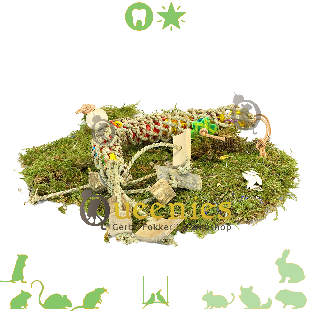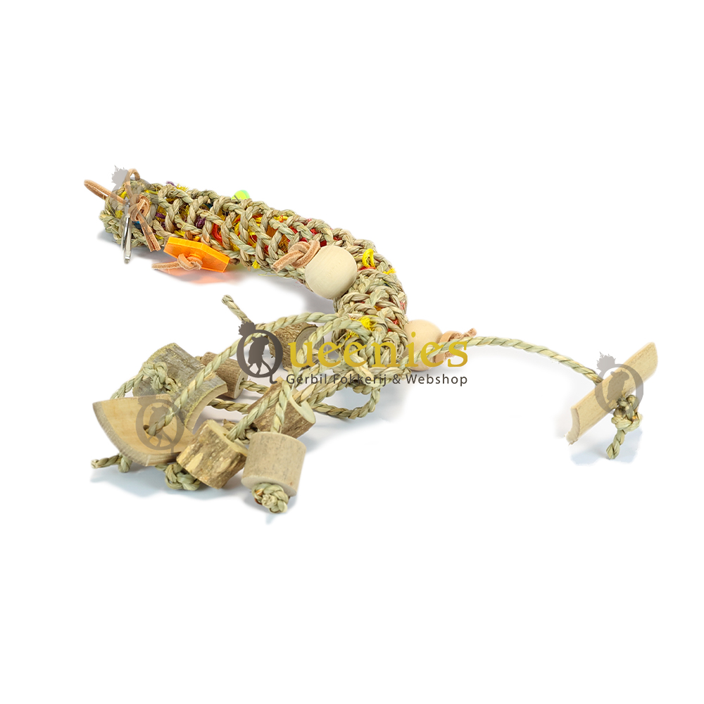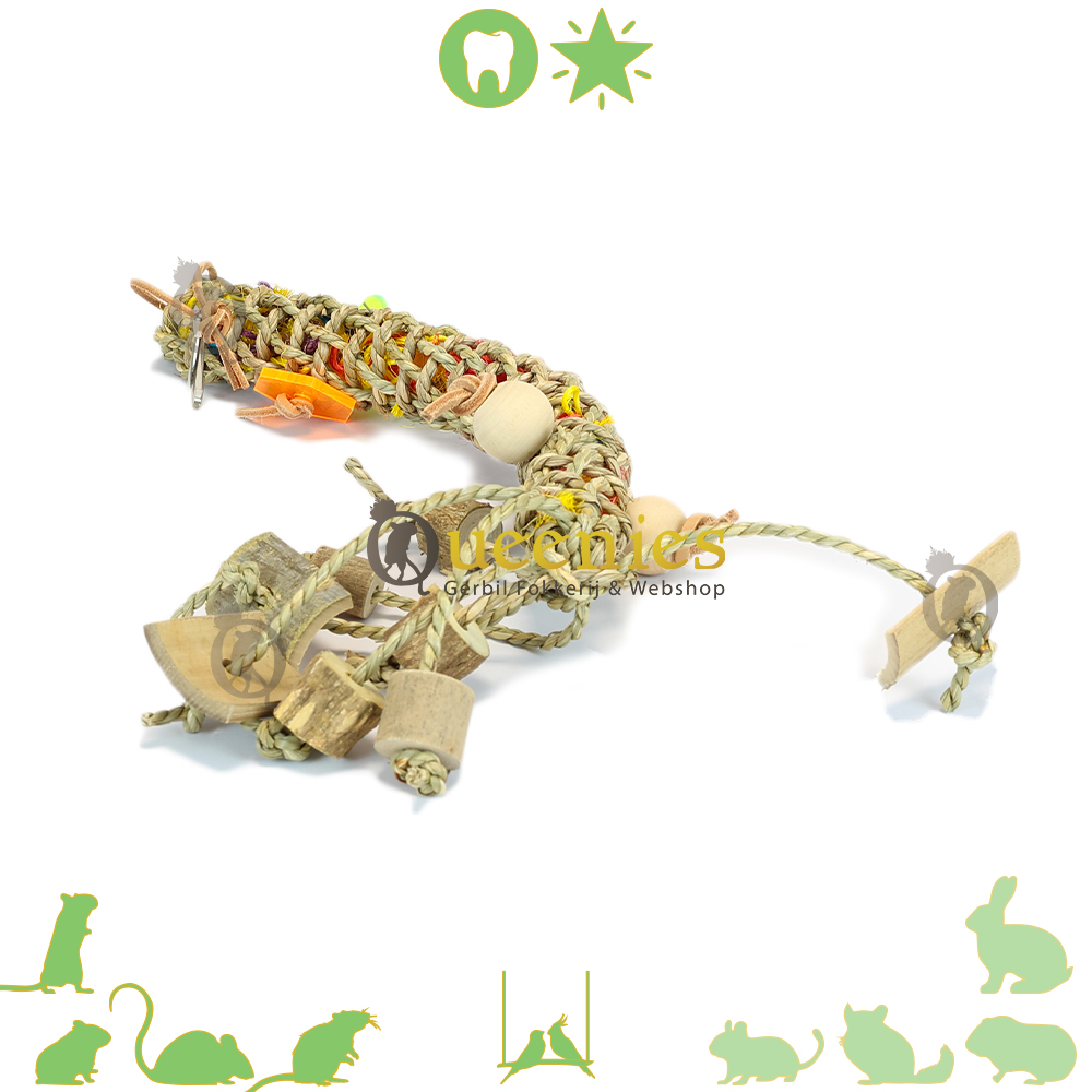 Het Slingertouw van Zeegras is 60 cm lang en gemaakt als Speelgoed voor Knaagdieren en Vogels. Niet alleen is het Slingertouw makkelijk op te hangen in een Terrarium of Vogelkooi, het biedt ook verschillende voordelen om het Slingertouw aan te schaffen voor Gerbils, Muizen of Vogels zoals Parkieten en Papegaaien. Doordat het touw is gemaakt van Zeegras is het niet alleen een natuurlijk materiaal maar ook duurzaam materiaal zonder plastic of kunstmatige andere materialen. Hierdoor is het niet schadelijk voor Knaagdieren en Vogels omdat er geen gevaarlijke stoffen in zitten. Voor Vogels is het Slingertouw makkelijker te gebruiken dan Knaagdieren. Vogels kunnen natuurlijk vliegen en het touw als houvast gebruiken. Knaagdieren moeten goed kunnen klimmen om met het Slingertouw te kunnen spelen. Wat voor Gerbils, Muizen en Ratten geen probleem is.