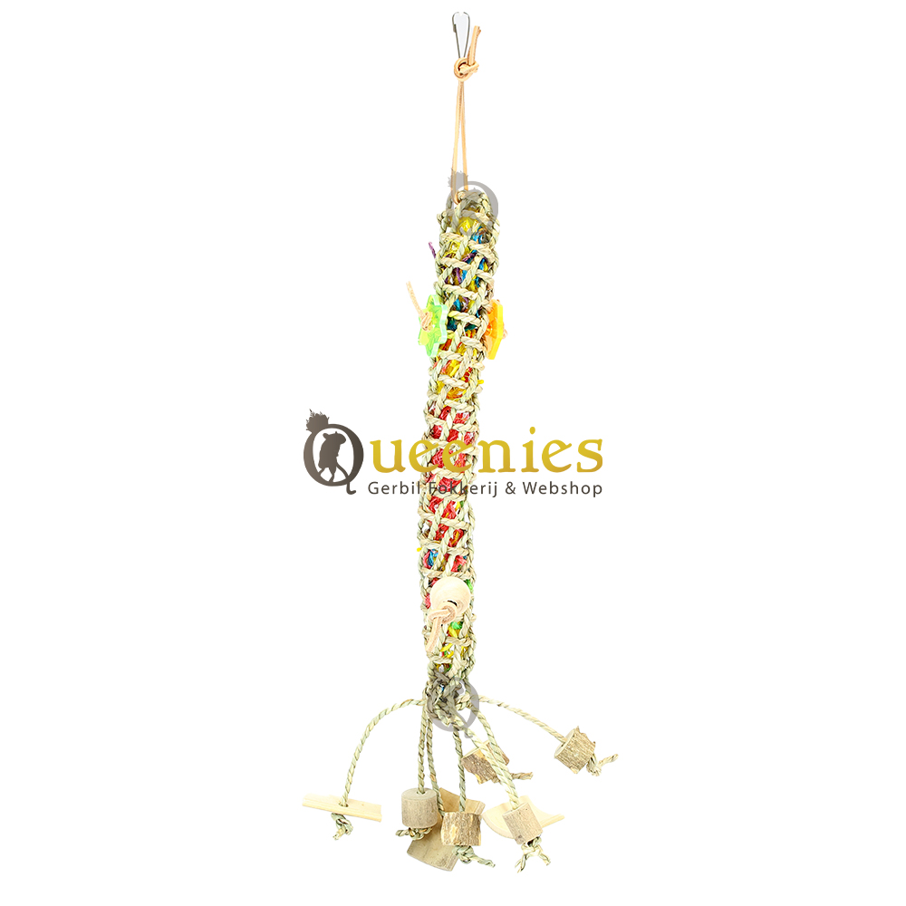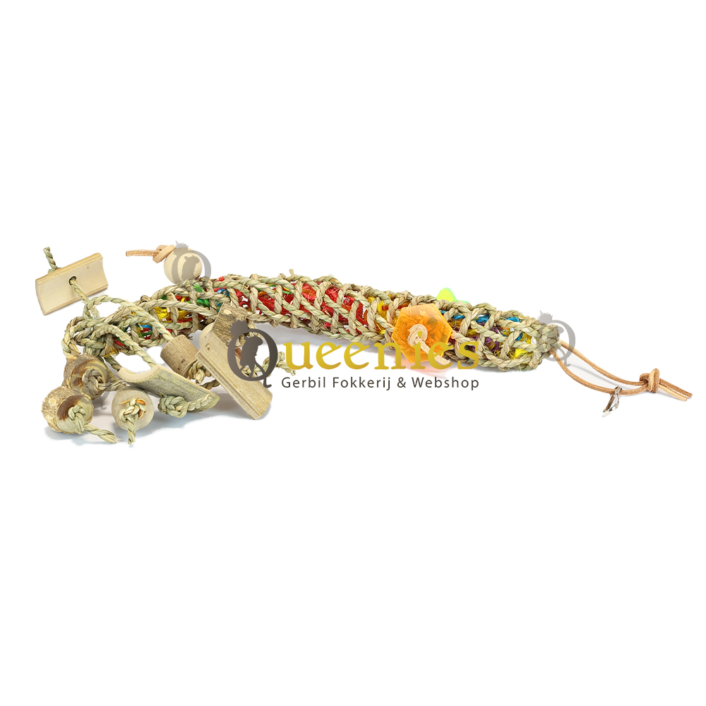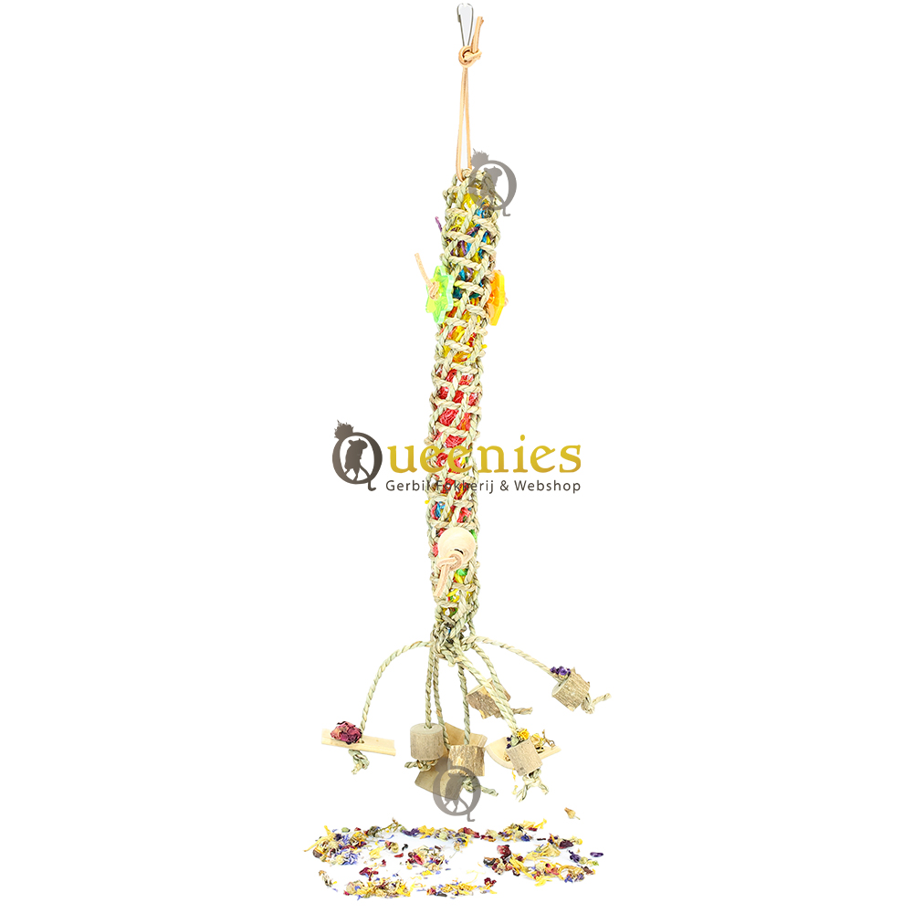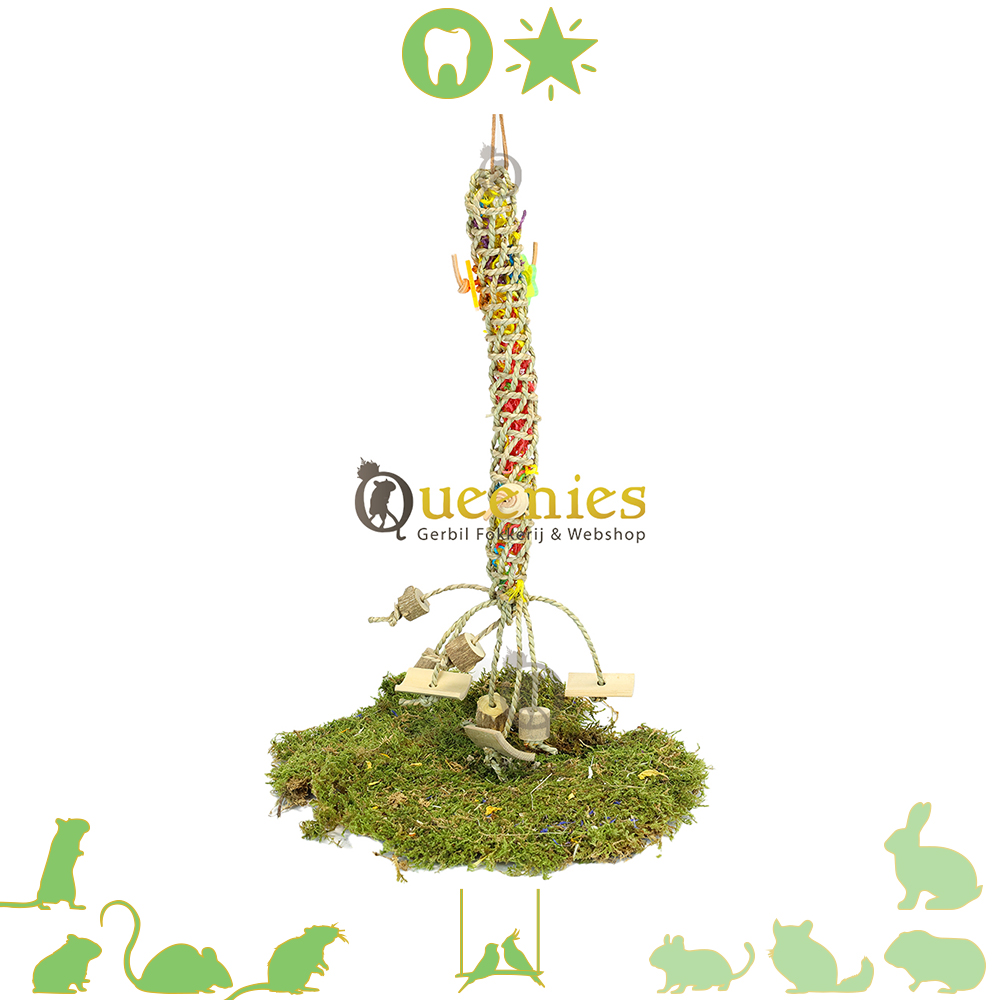 Het Slingertouw van Zeegras is 60 cm lang en gemaakt als Speelgoed voor Knaagdieren en Vogels. Niet alleen is het Slingertouw makkelijk op te hangen in een Terrarium of Vogelkooi, het biedt ook verschillende voordelen om het Slingertouw aan te schaffen voor Gerbils, Muizen of Vogels zoals Parkieten en Papegaaien. Doordat het touw is gemaakt van Zeegras is het niet alleen een natuurlijk materiaal maar ook duurzaam materiaal zonder plastic of kunstmatige andere materialen. Hierdoor is het niet schadelijk voor Knaagdieren en Vogels omdat er geen gevaarlijke stoffen in zitten. Voor Vogels is het Slingertouw makkelijker te gebruiken dan Knaagdieren. Vogels kunnen natuurlijk vliegen en het touw als houvast gebruiken. Knaagdieren moeten goed kunnen klimmen om met het Slingertouw te kunnen spelen. Wat voor Gerbils, Muizen en Ratten geen probleem is.