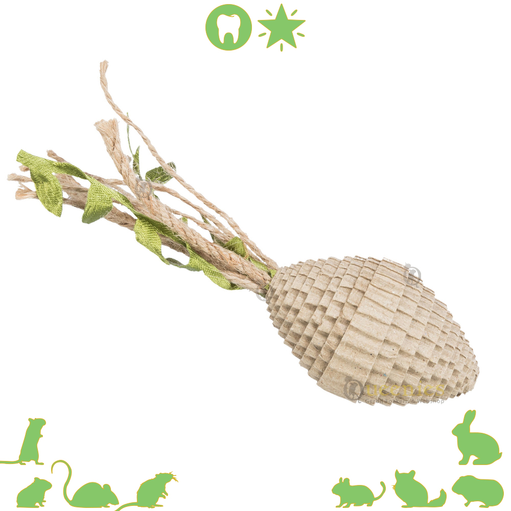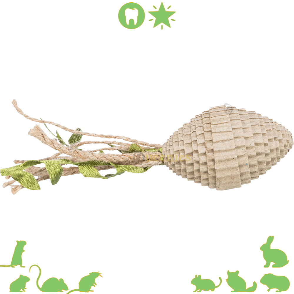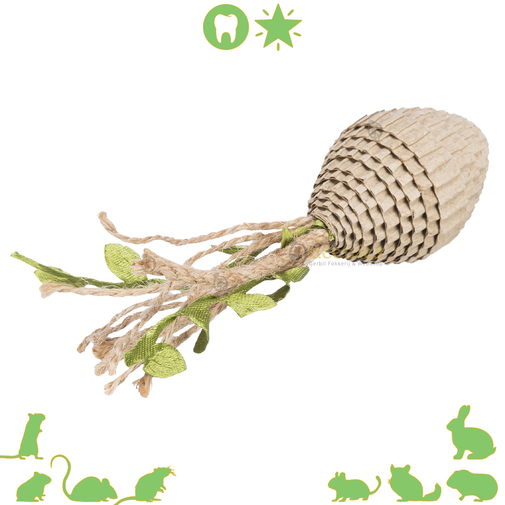 Gemaakt van duurzaam karton en touw voldoet dit Dennenappel speelgoed aan de knaag behoefde van elk Knaagdier. Het is ontworpen om lang mee te gaan, zelfs bij intensief gebruik. De stucteer van het Dennenappel speelgoed helpt niet mee aan alleen de knaag behoefde maar het helpt ook mee aan het slijten van de tanden. Door constant te knagen aan producten slijten Knaagdieren op een natuurlijke manier hun tanden.