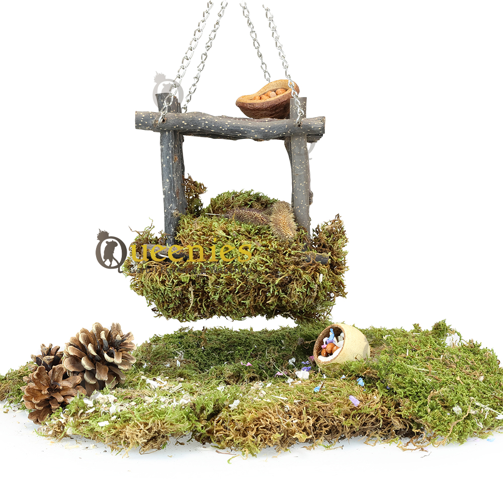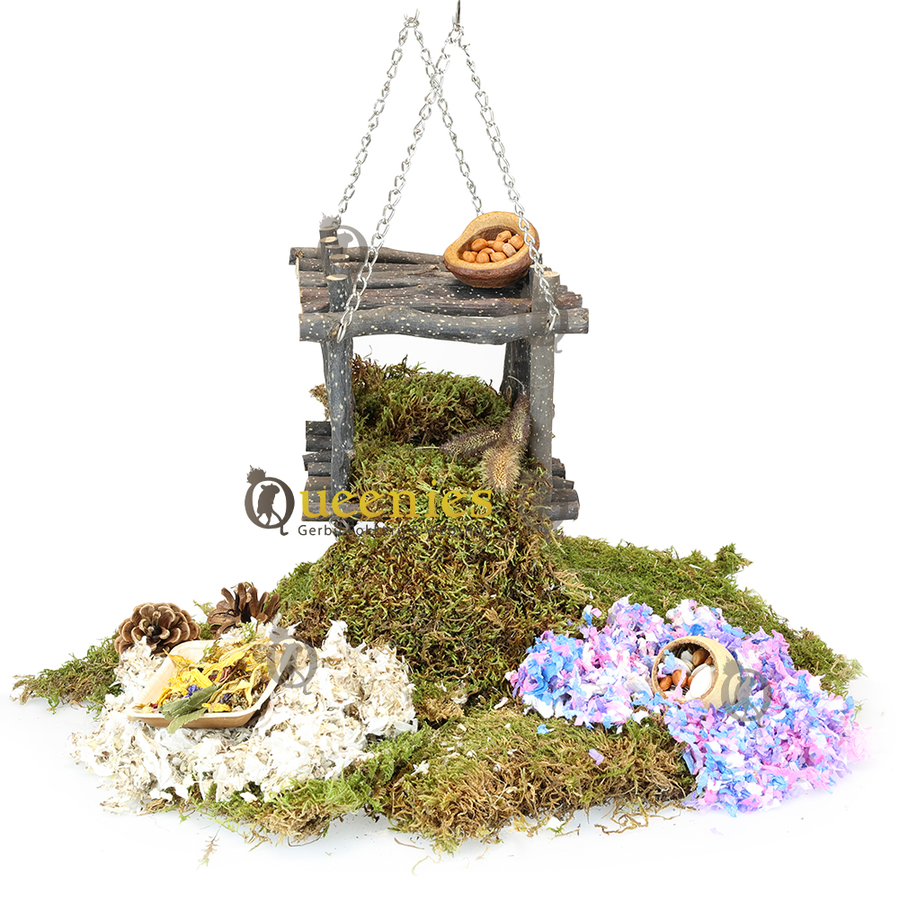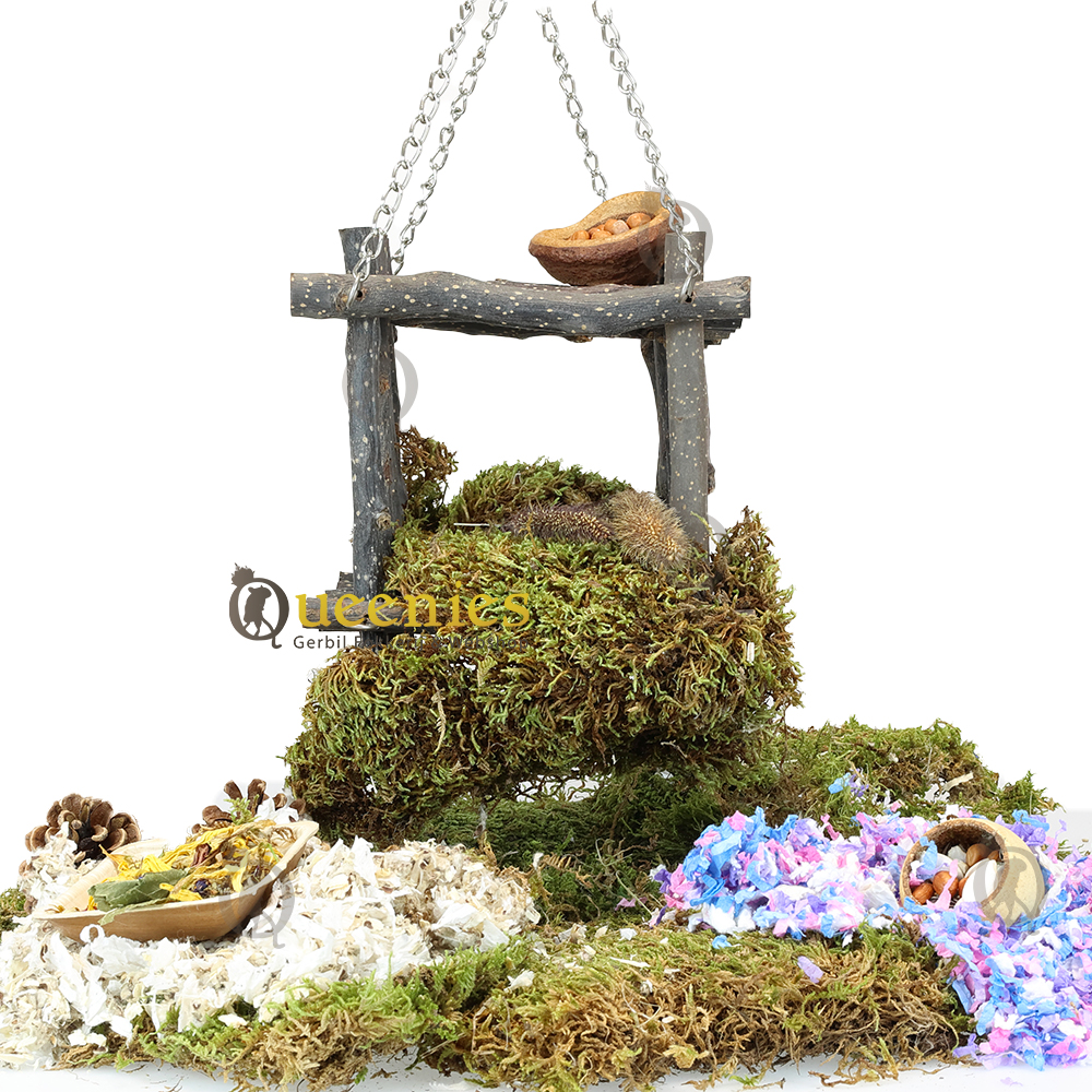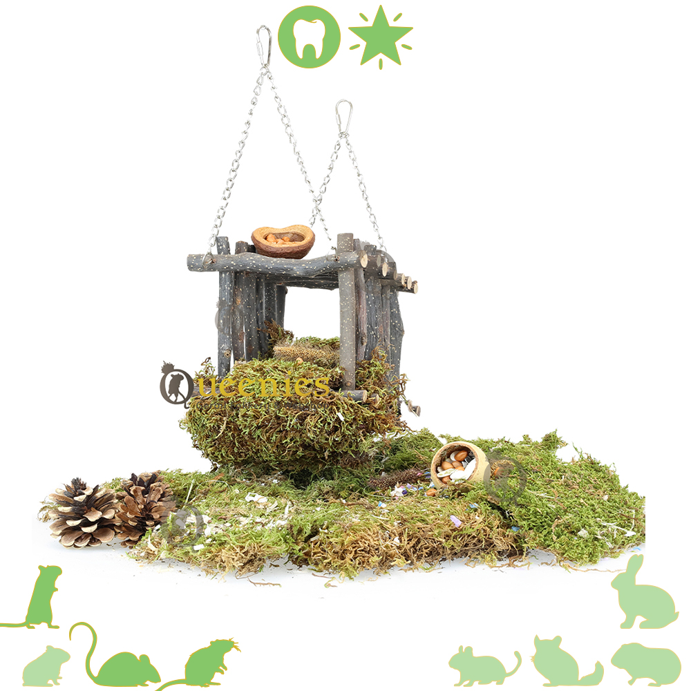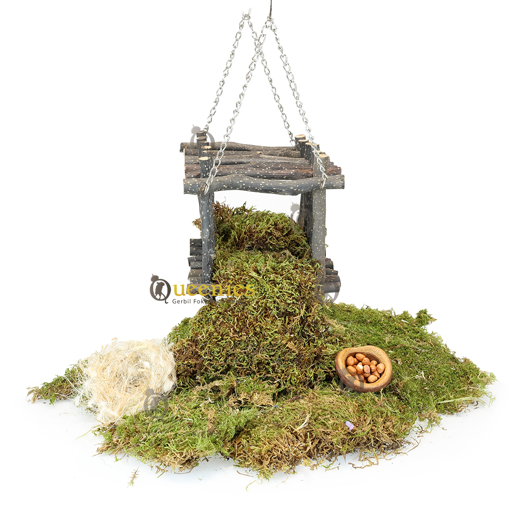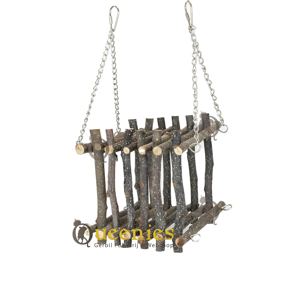 Kies een leuke plek uit in het Terrarium om de brug op te hangen. Aan het Terrarium zelf of aan stuk touw dat u kunt vast maken aan andere onderdelen in het Terrarium. De Wiebelbrug is ook om Gerbils of Muizen in beweging te houden. Gerbils zijn erg nieuwsgierige dieren en zullen snel op onderzoek uitgaan. Als de Gerbils toch te weinig interesse tonen in de Wiebelbrug kunt u altijd iets lekker in de brug legen. De Gerbils zullen dan een stuk sneller gebruik maken van de brug.