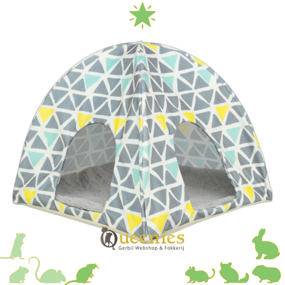 Deze Tent is een schuilplaats en speelruimte in 1. Geïnspireerd op het leven zoals de traditionele tenten. Hebben we allemaal niet wel eens een tent opgezet? Al was het niet op de camping dan wel in de achtertuin of in het park? Leuk om deze tent nu ook aan te bieden aan onze Knagertjes. Ook biedt deze tent een gezellige en veilige plek waar Fretten en Cavia's kunnen rusten, spelen en zich kunnen verstoppen of ravotten. De tent is gemaakt van knaagdierveilige materialen zoals fleece en pluche met schuimvulling in de bodem. Deze materialen zorgen voor comfort en warmte voor de knaagdieren.