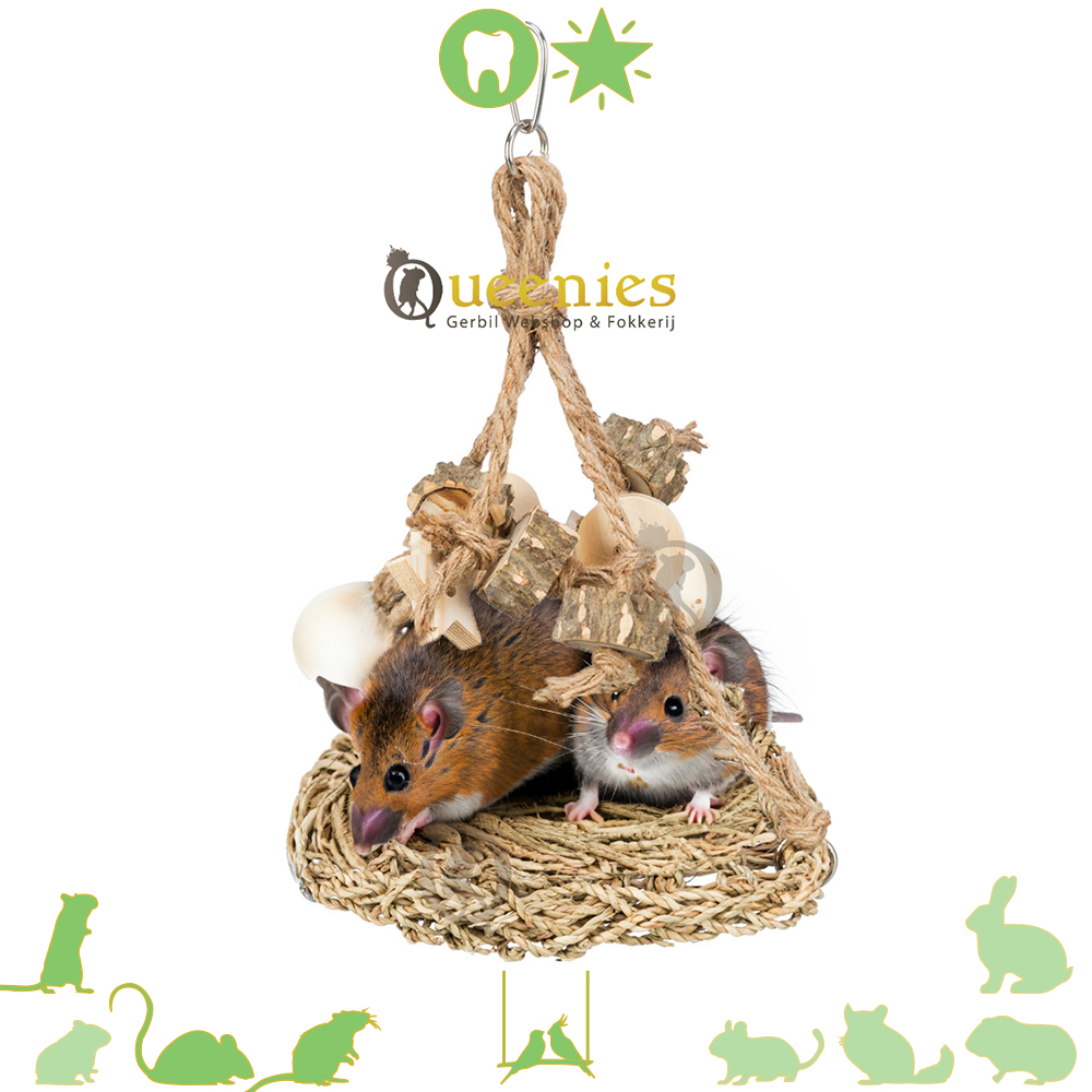 De Zeegras Schommel is gemaakt van meerdere soorten materialen. Zeegras, Vlastouw en Houtblokjes. Deze combinatie van materialen geeft een fijne textuur aan het product. Vooral Knaagdieren zijn dol op textuur. Voor dieren zoals Gerbils is het fijn om ergens aan de kunnen Knagen. Gerbils zijn ook erg nieuwsgierige dieren. Met de Zeegras Schommel kunnen Gerbils niet alleen spelen, maar door het heen en weer schommelen blijven de Gerbils ook actief. Een Schommel beweegt natuurlijk niet vanzelf, tenzij er een zetje aan wordt gegeven of de gerbils er als clowns in acteren. Voor Vogels is dat wat makkelijker, zodra zij aankomen vliegen en landen op de Schommel zal er door de vaart de Zeegras Schommel vanzelf heen en weer gaan.