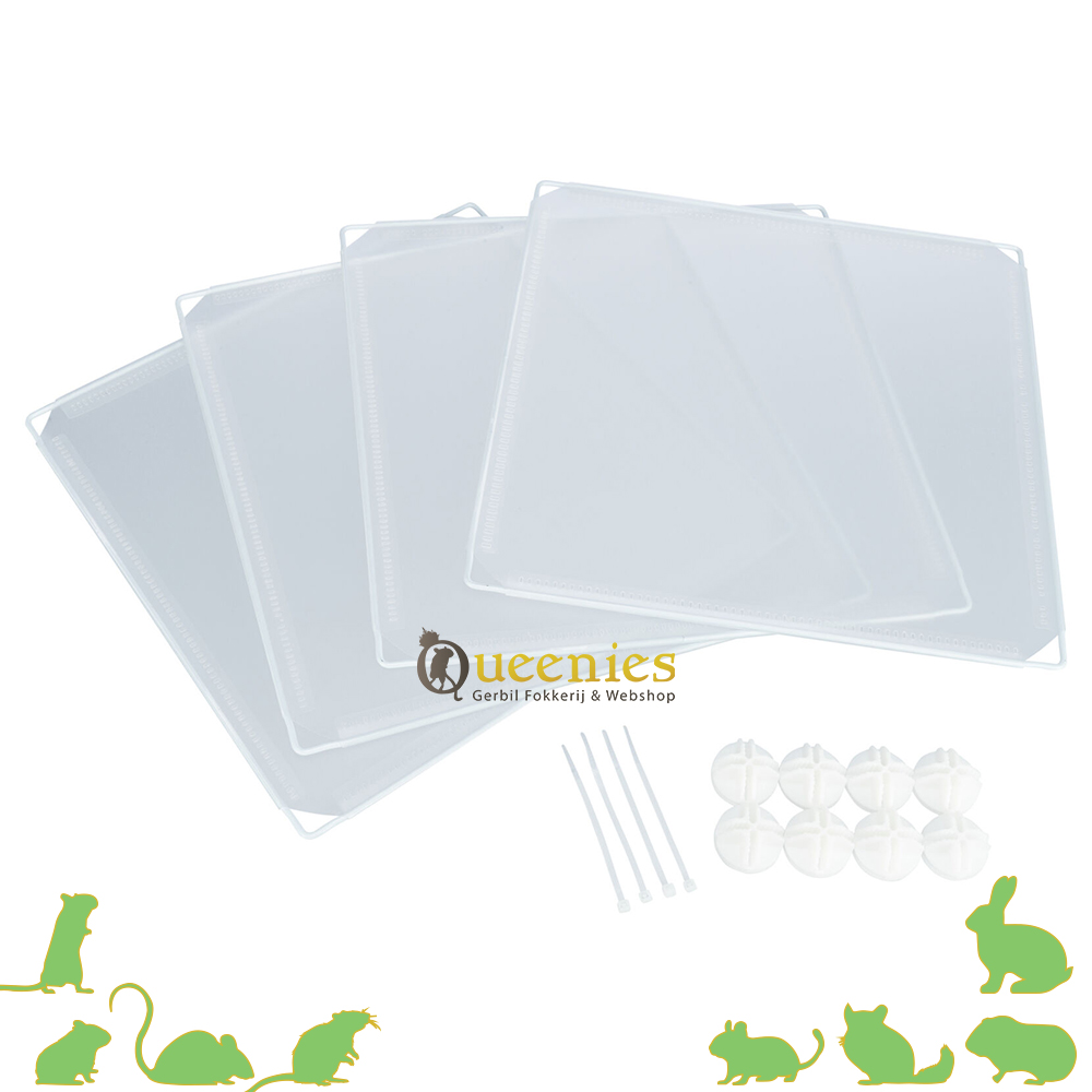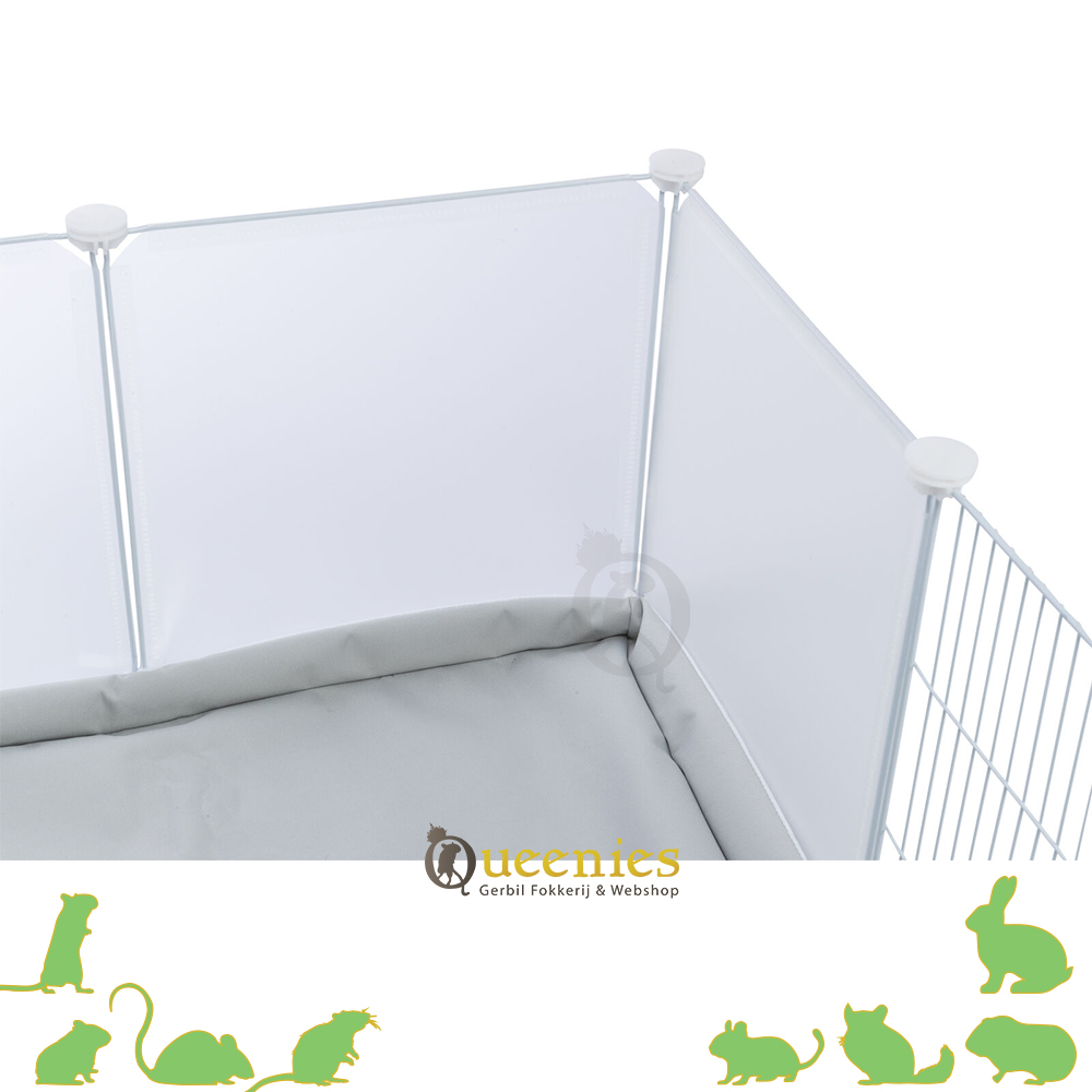 De tralie Indoor ren is gemakkelijk en eenvoudig uit te breiden. Met dit setje dichte metalen panelen kunt u de Indoor ren verlengen en de toch al zo grote tralie indoorren naar een nog grotere indoor paradijs bouwen. Een tip om deze dichte panelen aan de muur kant te plaatsen. Mocht u hooi in het knaagdierren gebruiken blijft dit in de ren en niet tussen de muur en de ren. Voorkomt viezigheid. Deze dichte panelen geeft een zeer mooi effect aan de indoor ren.