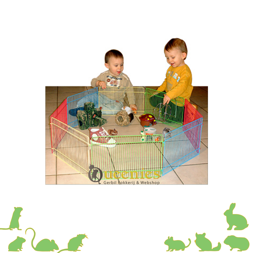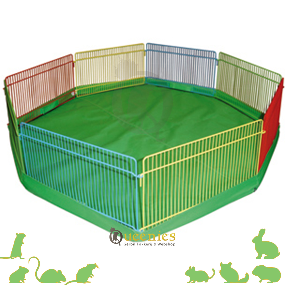 Knaagdierren van Karlie Wonderland. Een 8 hoekige ren met spijlen van 35x23 LxH De diameter is 84.5 cm Wordt geleverd zonder bodemhoes, deze worden helaas ook niet meer geproduceerd en kan dus ook niet meer los erbij besteld worden