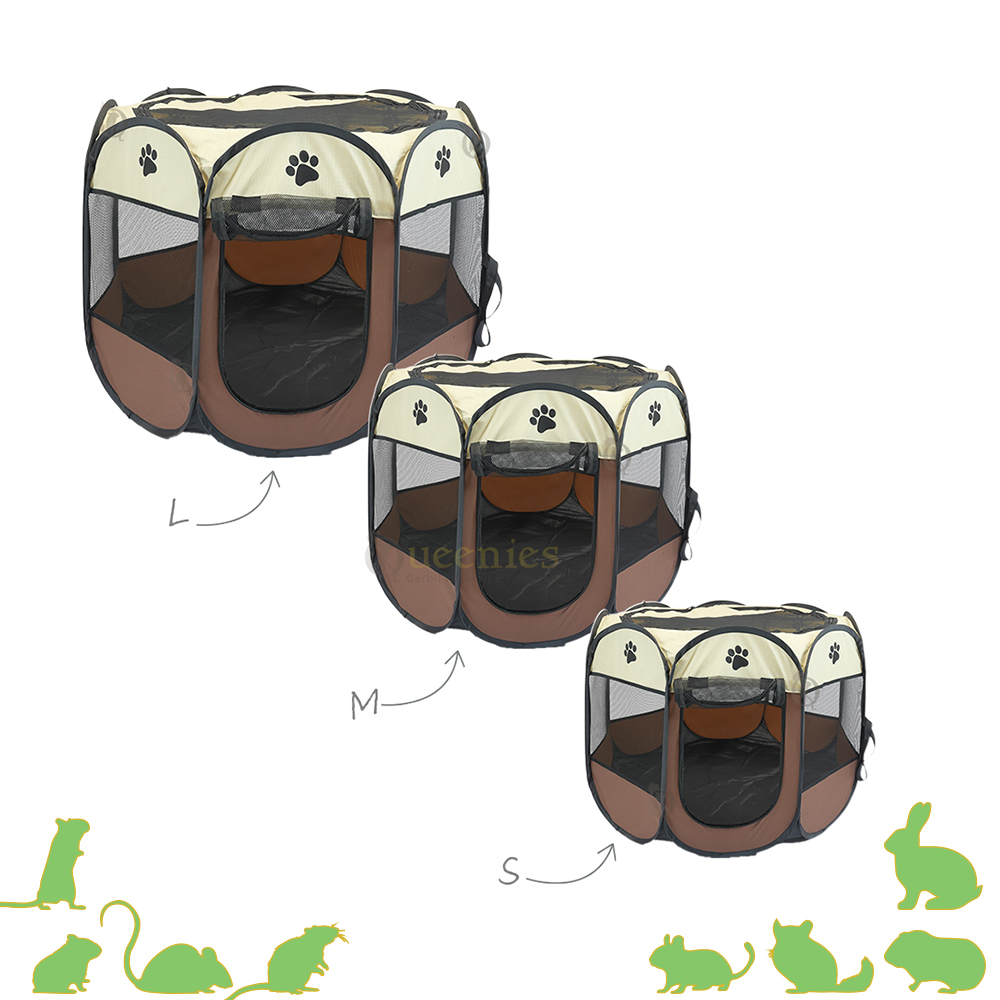 Deze praktische ren is ideaal voor kleine huisdieren zoals cavia’s, konijnen, ratten of hamsters. Ook voor kittens of pups is de ren perfect geschikt als tijdelijke afzetting. Het materiaal is lichtgewicht maar stevig, met transparant gaas aan de zijkanten zodat je goed zicht houdt op je dier. De bovenkant is deels afsluitbaar met een ritsbare netkap, wat extra veiligheid biedt bij actieve of nieuwsgierige dieren.