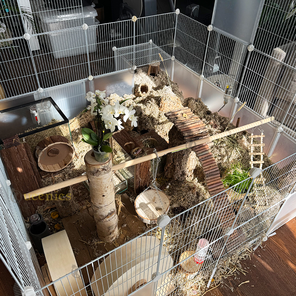 Toen kwam de Indoor Ren van hout, waren wij heel enthousiast over ( nog steeds ) maar het vierkante kippengaas is ook wel lekker in klimmen voor gerbils en hamsters.