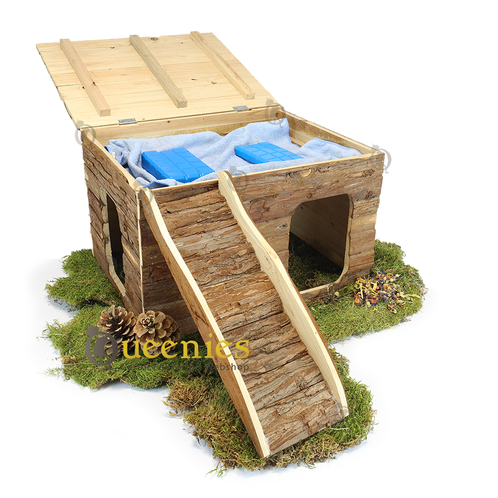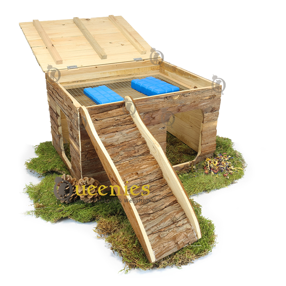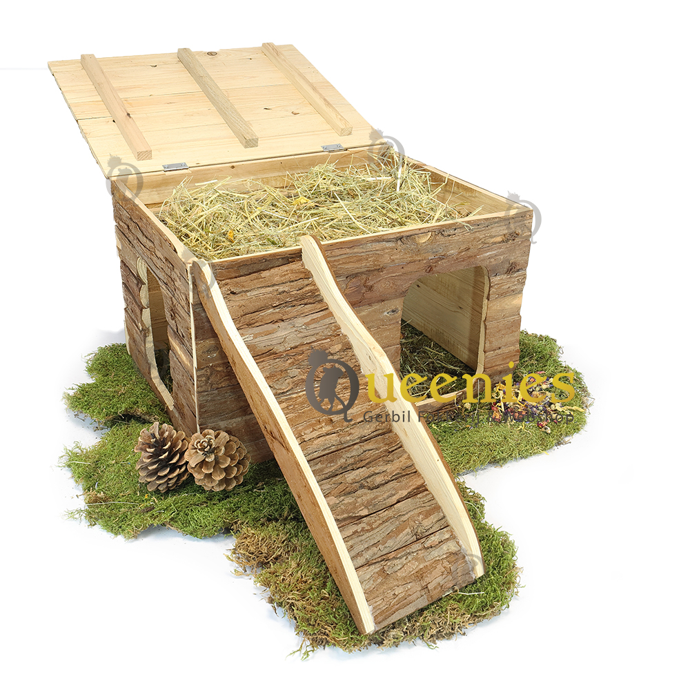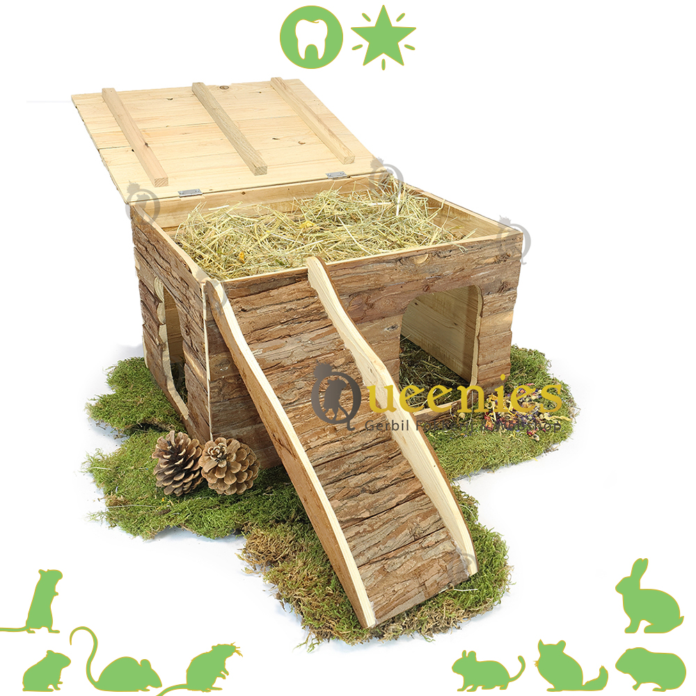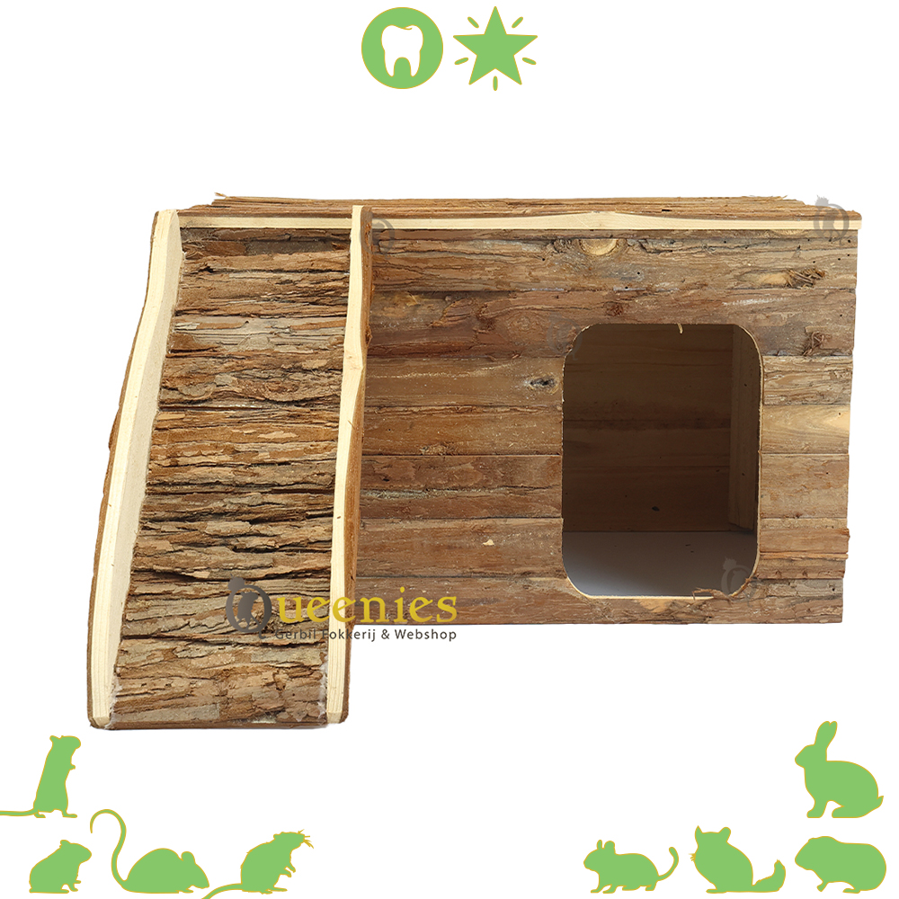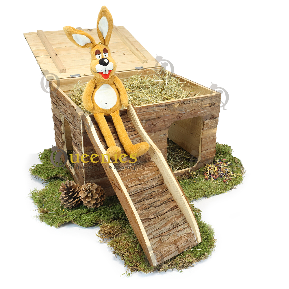 Ook geeft het platte dak alle mogelijkheden tot een goede uitkijkpost. Het dak is opklapbaar zodat u eenvoudig en snel hooi of koelelementen kunt plaatsen of verversen. Ook is dit huisje gemaakt van natuurlijk schorshout welke veilig is voor Knaagdieren om aan te knagen en Kabbelen.