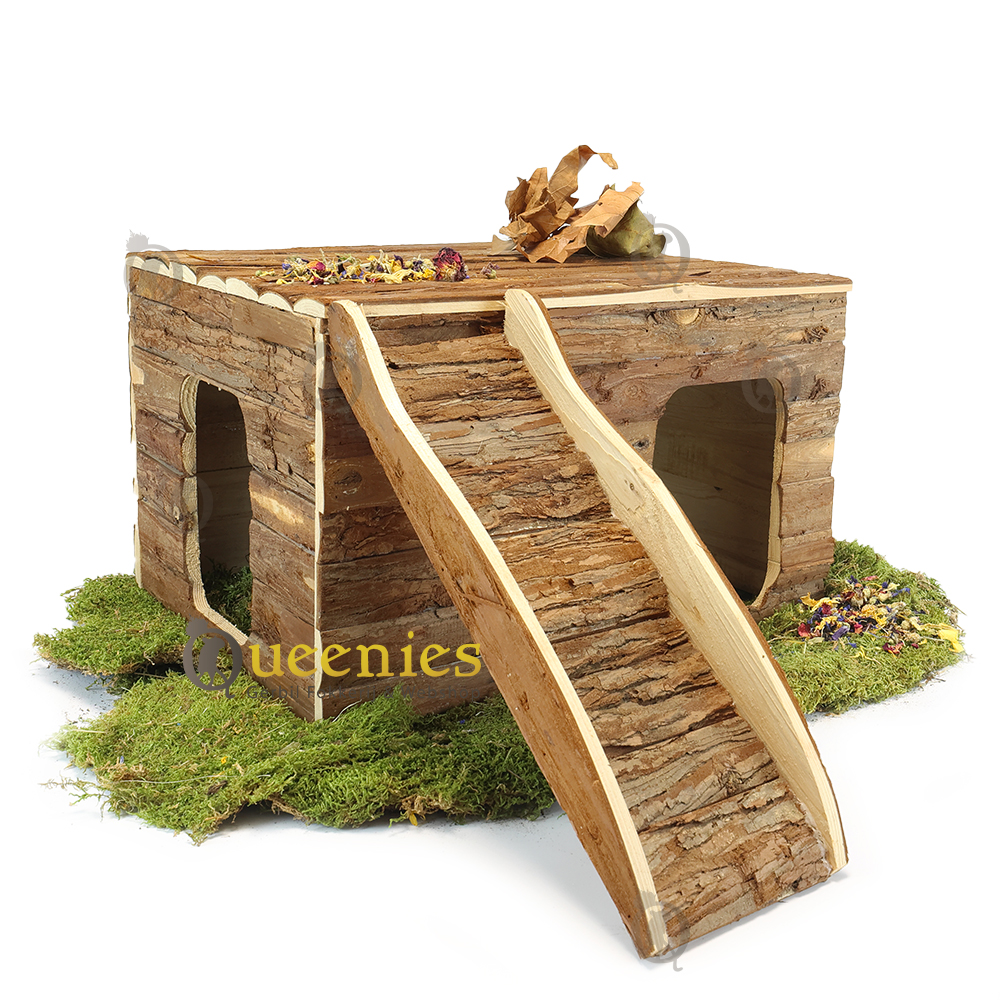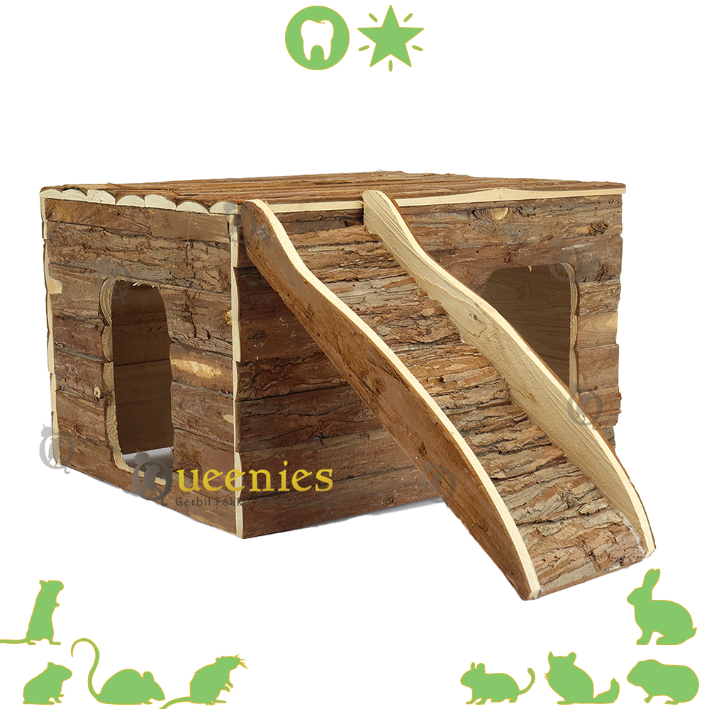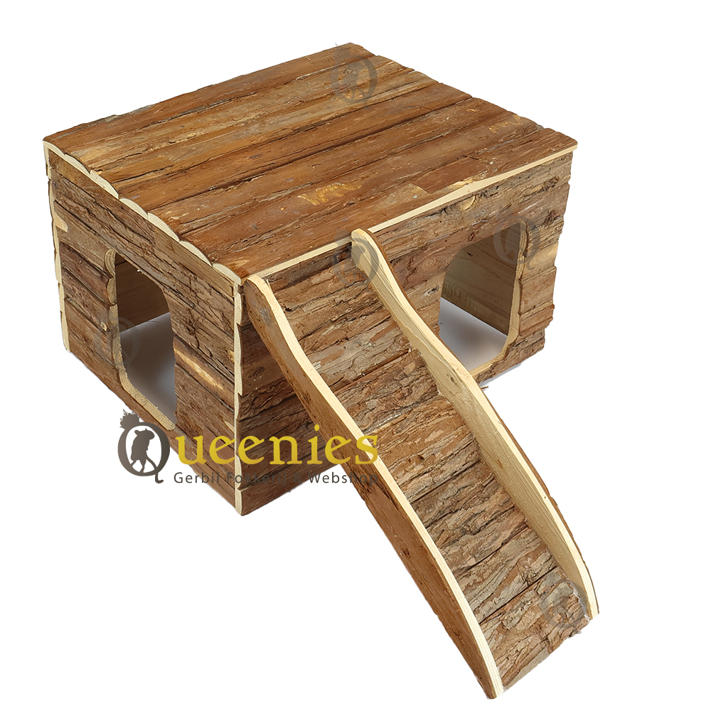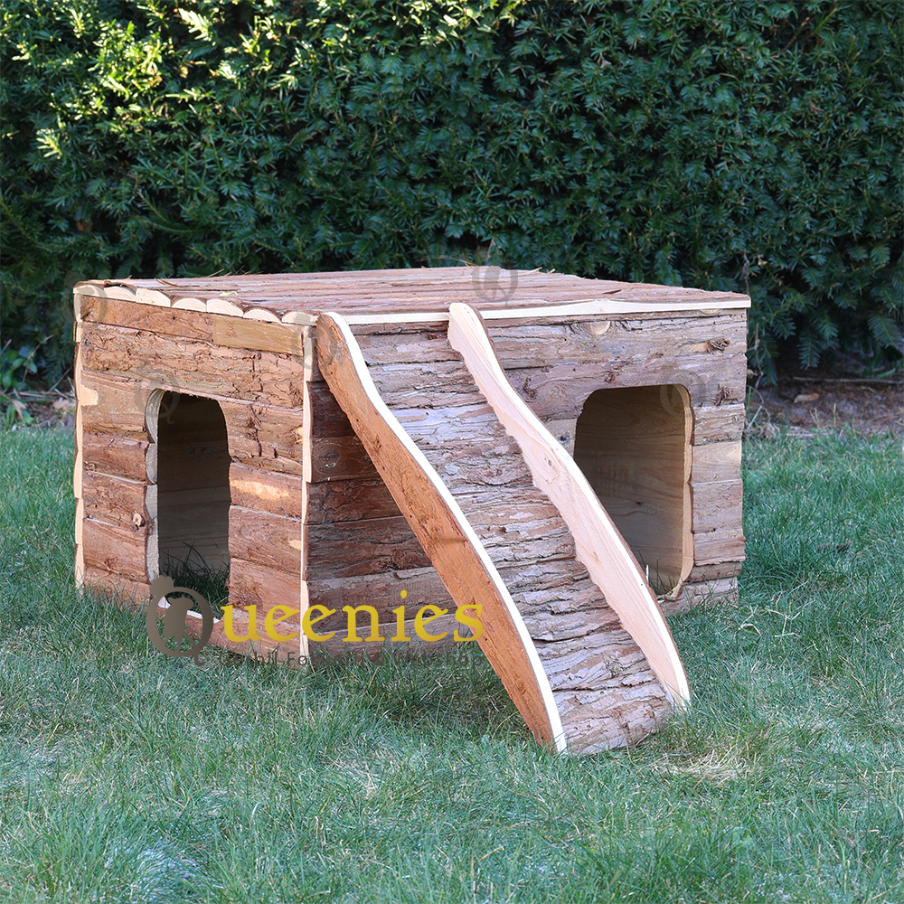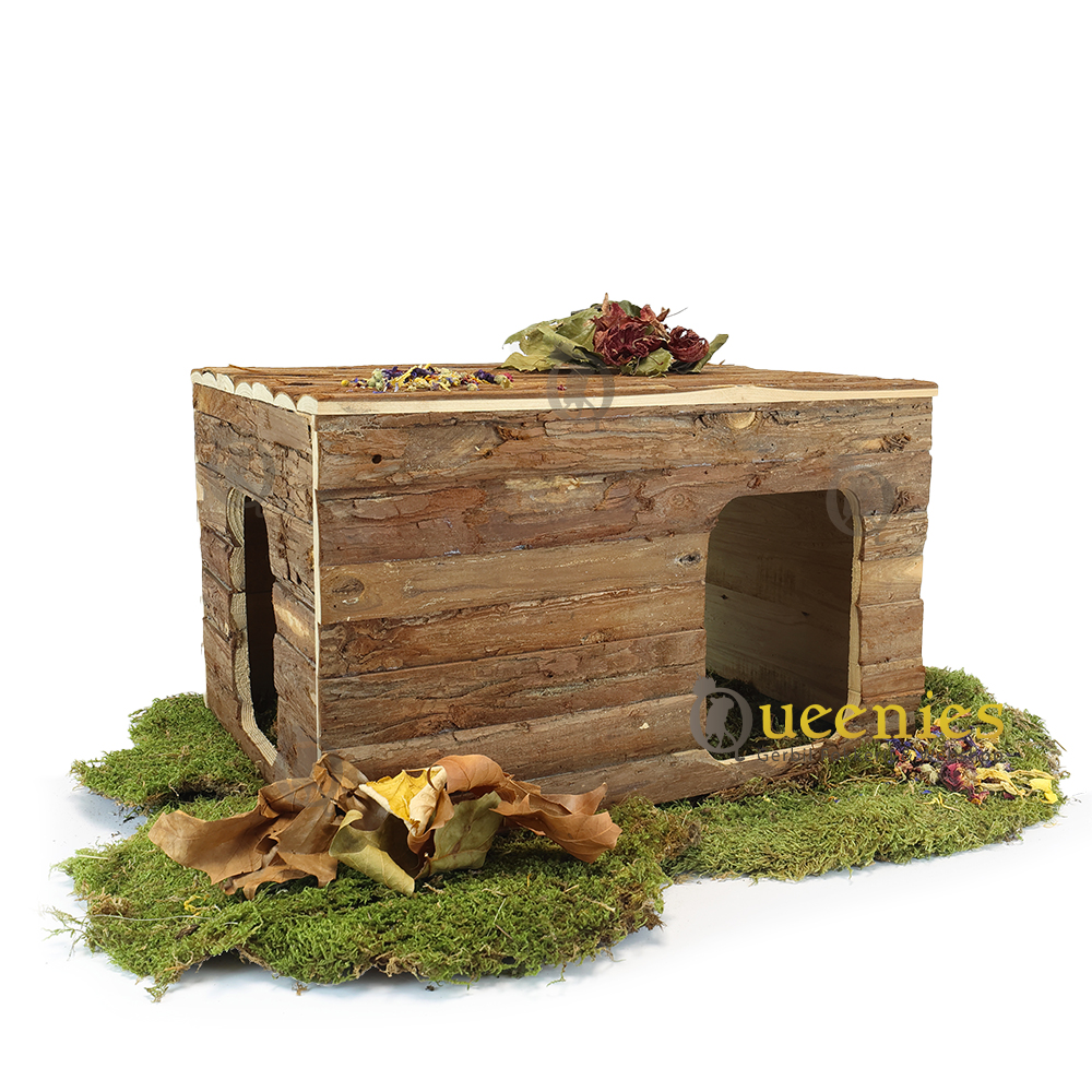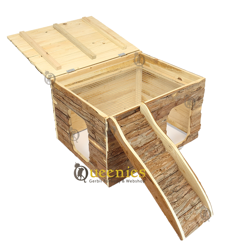 Ook geeft het platte dak alle mogelijkheden tot een goede uitkijkpost. Het dak is opklapbaar zodat u eenvoudig en snel hooi of koelelementen kunt plaatsen of verversen. Ook is dit huisje gemaakt van natuurlijk schorshout welke veilig is voor Knaagdieren om aan te knagen en Kabbelen.