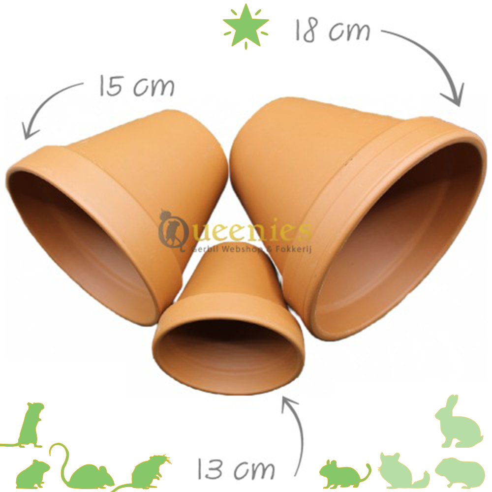 Voor zowel Gerbils als voor Hamsters en Muizen kunnen deze potten mooi dienst doen als Knaagdierhuisje. Met als bijkomend voordeel dat een Terracotta pot of huisje zomers voor een heerlijk verkoelende leefomgeving zorgt als u de terracotta pot in de koelkast heeft gelegd, en s'winters geeft het de nodige isolatie wanneer u de pot binnenin met mos bekleed. Dat is het voordeel van Terracotta producten, in de zomer geeft het verkoeling, in de winter zorgt het voor het nodige warmte comfort bij uw dier.