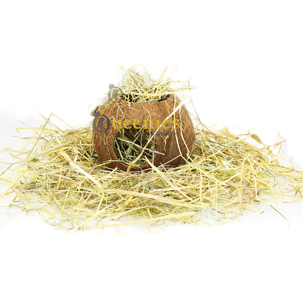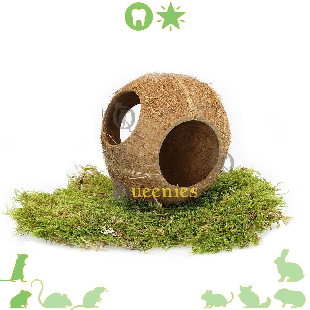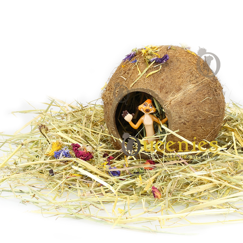 Maar ook kan de Kokosnoot gebruikt worden als Hooiruif waar u eventueel Knaagdieren snacks in verstopt zodat het natuurlijke foerageer gedrag wordt gestimuleerd!