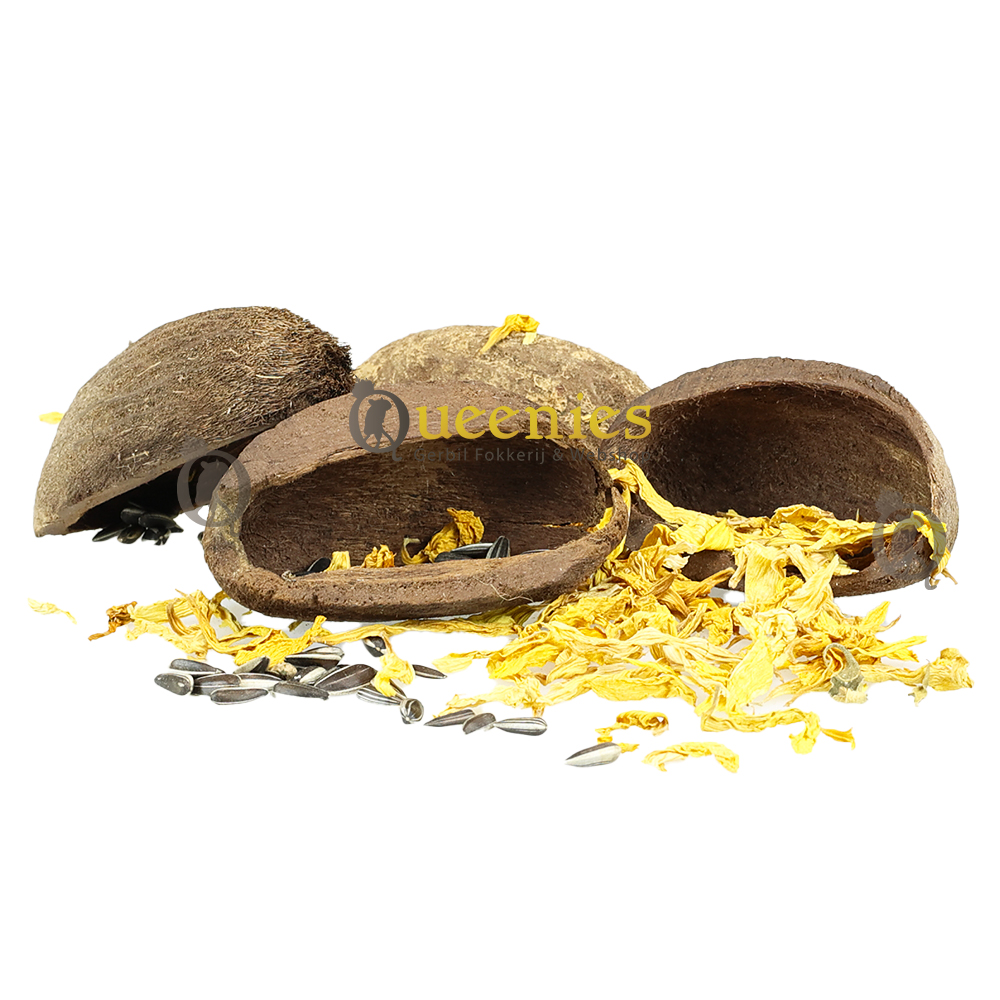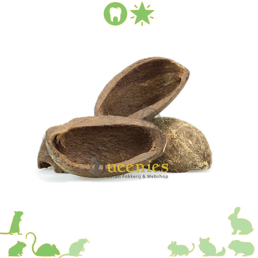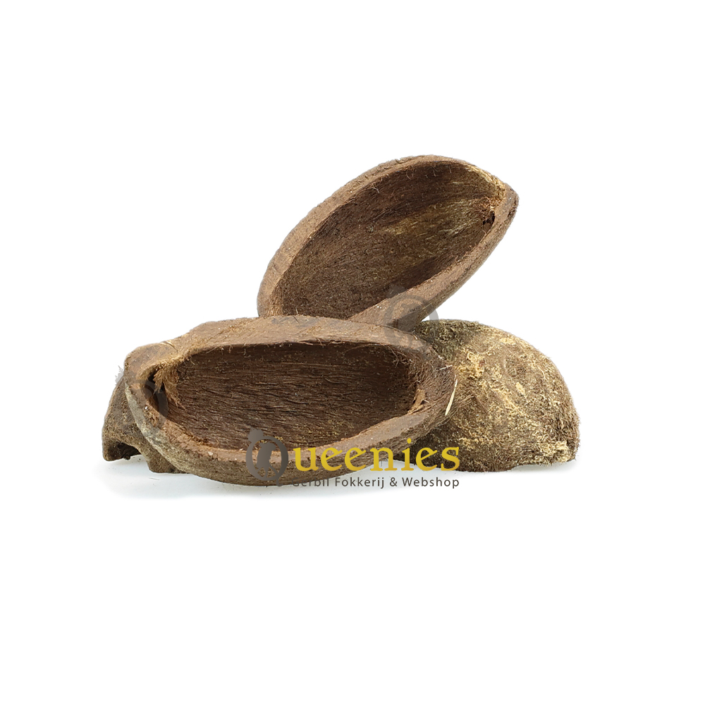Deze halve Kokosnoot kan op meerdere manieren gebruikt worden. Door het kleine formaat past het in ieder Terrarium / Gerbilarium en kunt u er zelfs meerdere van nemen om ze her en der te verstoppen in de bodembedekking, knaagdierhuisjes of bruggentjes. In eerste instantie vinden wij dit product voornamelijk erg mooi en geschikt voor het aanbieden van voeding of voedingssupplementen voor knaagdieren. Door in deze kleine halve kokosnoot gedroogde bloemen en of grassen in te verstoppen oogt het ontzettend natuurlijk en waarheidsgetrouw. De eerlijkheid van een kokosnoot komt helemaal terug in het dit product doordat de kokosnoot vrijwel onbehandeld is. Enkel het sap en het vlees in de kokosnoot is verwijderd ( anders kan het gaan schimmelen ) maar soms ziet u nog gedroogd kokosvlokken terug. Hier zijn kleine knaagdieren ook dol op overigens. De Gerbil kan er met zijn lijfje zeker in, een dwerghamster en een kleine Muis dus ook, dat biedt ook de mogelijkheid dat er een schuilplek wordt gecreeerd in deze halve kokosnoot. Eenmaal in de kokosnoot zullen Gerbils veel daarin gaan graven. Sommige mensen verwarren dit met stereotype hoekgraaf gedraag, echter is dat niet het geval. De Gerbil is op die manier bezig met zijn nagelverzorging. Door het graven in de kokosnoot worden de nageltjes van de Gerbil op een natuurlijke manier 'geknipt'.