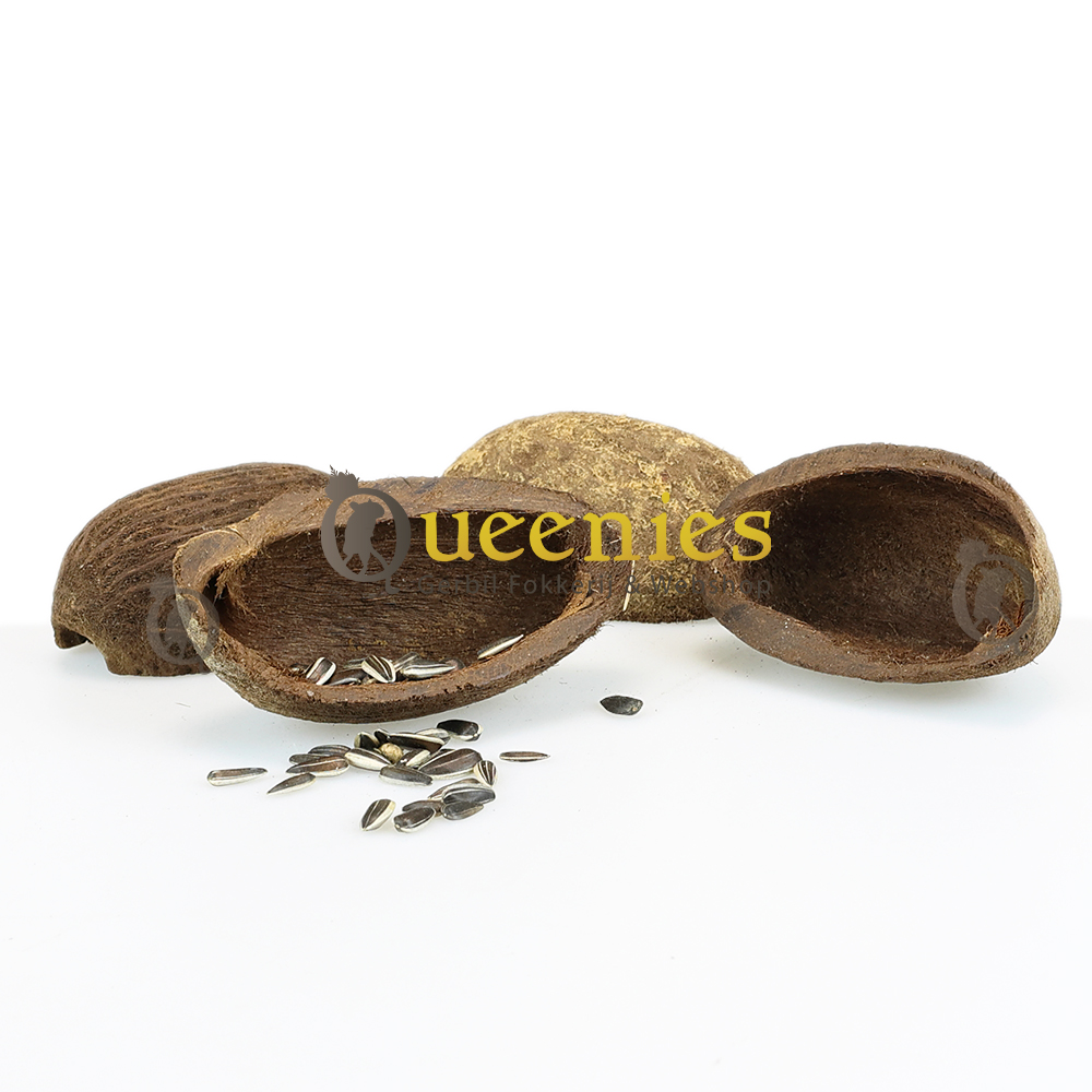 Deze halve Kokosnoot is van klein formaat ( net als zijn prijs ) en biedt verschillende mogelijkheden. Vanwege de lage prijs is het een mooi product om kennis te maken met het fenomeen 'Kokosnoot' voor uw Knaagdier. Gerbils worden altijd erg blij als zij een Kokosnoot tot hun beschikking hebben. De harde barst zorgt ervoor dat zij deze niet stuk geknaagd krijgen, het vezel wat om de kokosnoot heen zit kunnen zij mooi kaalplukken en er nestmateriaal van maken. Deze kleine halve Kokosnoot heeft wel een mooi komvormig uiterlijk waardoor u het kunt gebruiken als voerbakje of snackbak die in een Hamsterscape half in de bodembedekking wordt ingegraven.