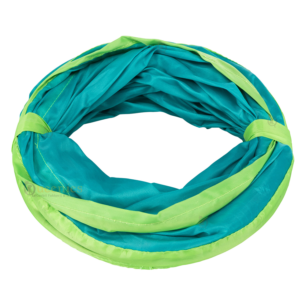 Wanneer de tunnel even niet wordt gebruikt, is deze compact samen te vouwen. Dat maakt hem praktisch voor binnengebruik of voor wisselende opstellingen in een ren of speelruimte.