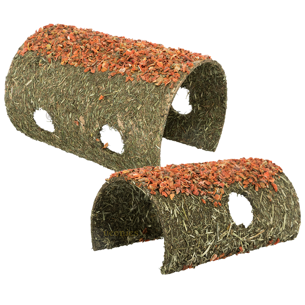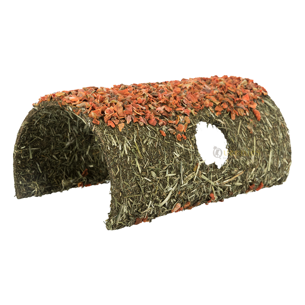 De schuilplaats is gemaakt van natuurlijke vezels en natuurlijk zetmeel en is verrijkt met wortelstukjes. Hierdoor is het niet alleen een rustplek, maar ook een smakelijke aanvulling binnen het verblijf.