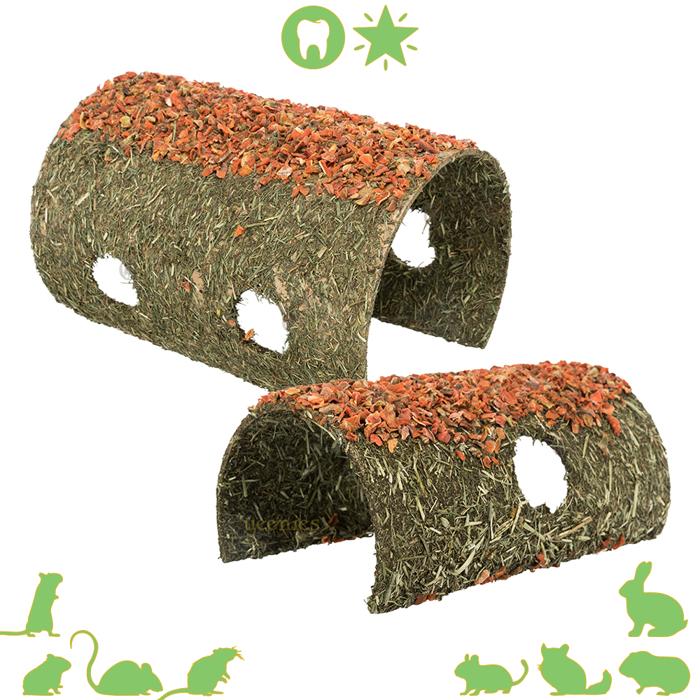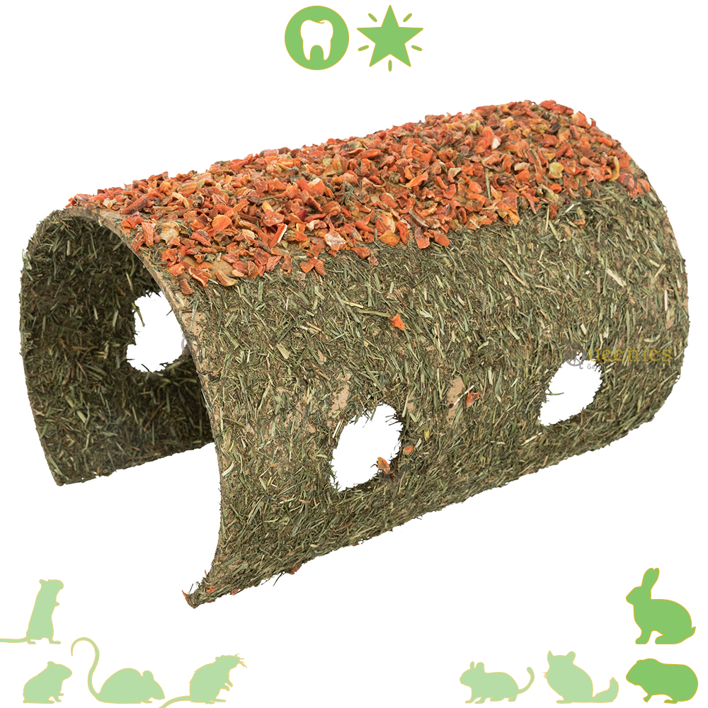 Doordat de schuilplaats is gemaakt van natuurlijke vezels en zetmeel, kan je konijn er veilig aan knagen. De toegevoegde wortel zorgt voor extra aantrekkingskracht en stimuleert nieuwsgierig gedrag.