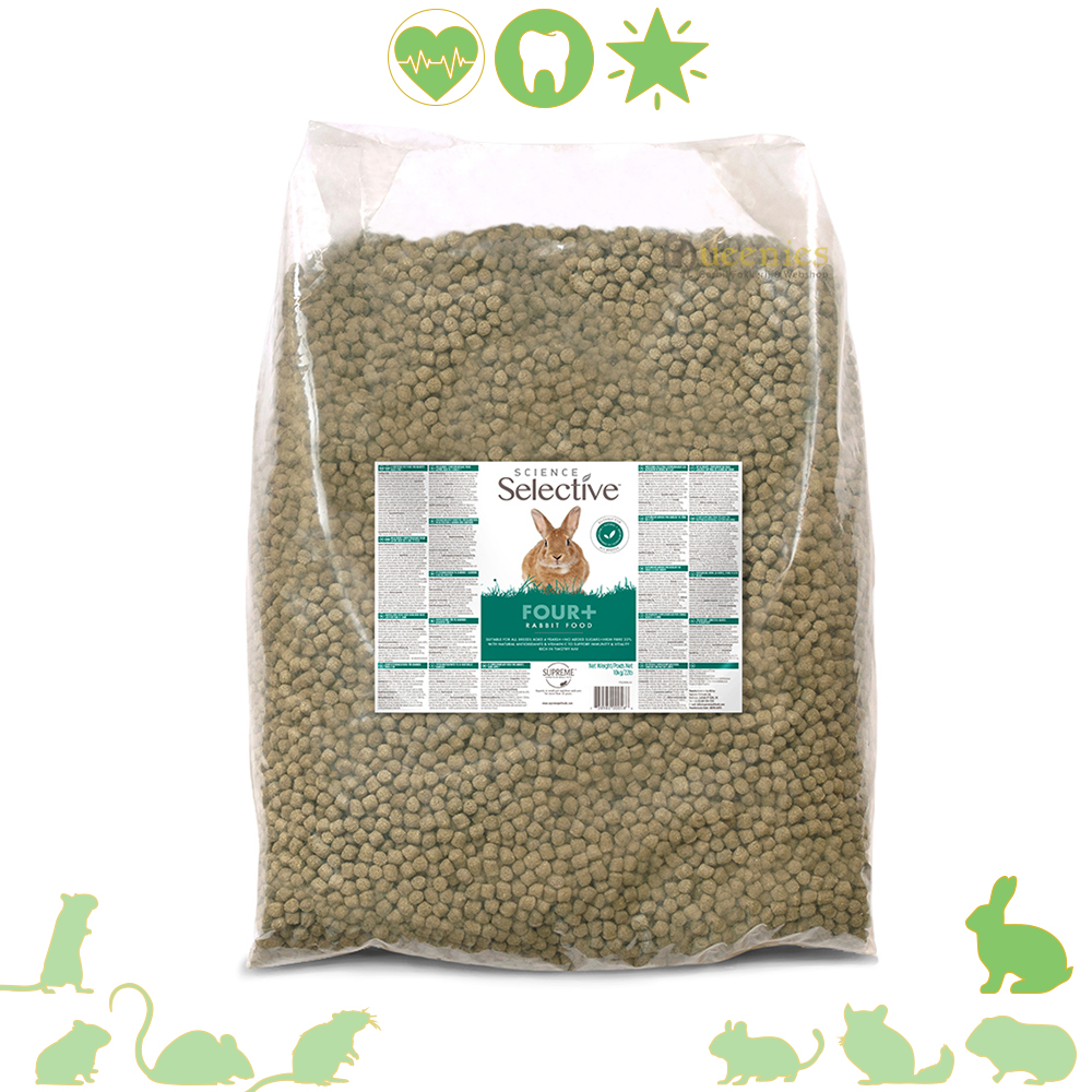 Selective Rabbit 4+ bevat een lager suiker en eiwitgehalte. Hierdoor helpt deze voeding overgewicht te voorkomen bij konijnen die minder actief worden naarmate ze ouder worden.