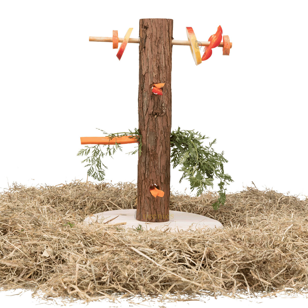 De Konijnen Snack Boom is een natuurlijke manier om groenten, takjes en snacks aan konijnen aan te bieden. Door voedsel in de openingen en op de stokjes te plaatsen moeten konijnen actief hun eten zoeken.