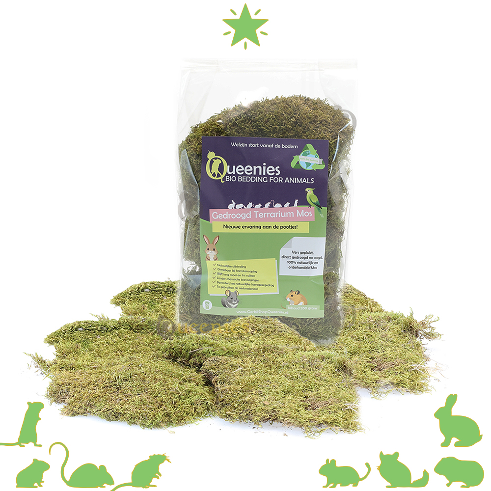 Verder kan het gedroogd terriarium mos 200 gram gebruikt worden als nestmateriaal. In de praktijk zien we dat de knaagdieren stukjes van het mos plukken en meenemen naar het nestje. Tot slot is het ook heel leuk om het gedroogde terrarium mos op de daken van de huisjes te plaatsen. Op deze manier zorgt u voor een hele natuurlijke uitstraling van het terriarium!