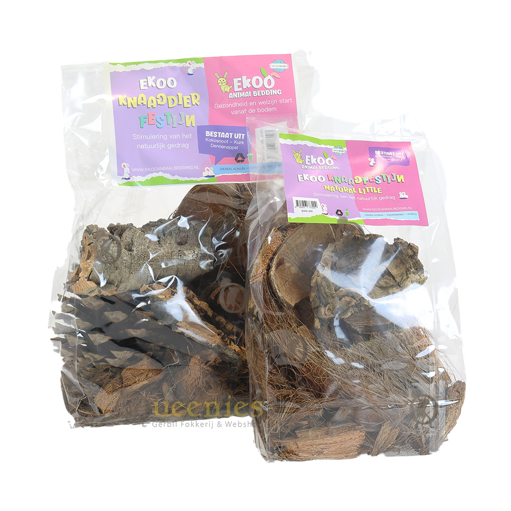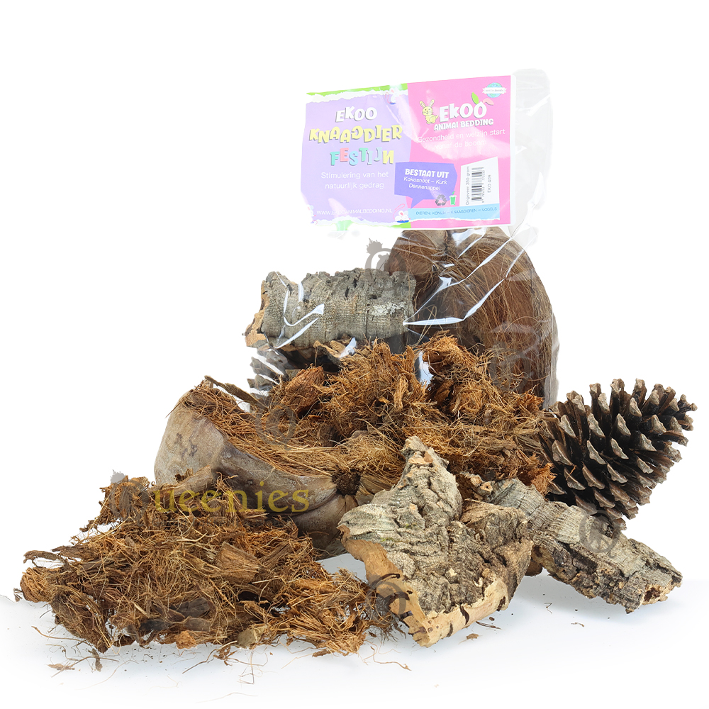 Het Knaagfestijn van Ekoo Animal Bedding stimuleert het natuurlijk gedrag van Knaagdieren. Het product is gemaakt van grove materialen zoals Kokosnoot, Kurk en een zeer grote Dennenappel. Knaagdieren kunnen hier aan knagen en op een natuurlijk manier hun tanden slijten. Niet alleen zorgt het ervoor dat de snel groeiende tanden van Knaagdieren worden bijgehouden het stimuleert ook het natuurlijk knaaggedrag. Ook kan het product erg goed worden gebruikt in Hamsterscaping. De mooie natuurlijk kleuren passen zo in een Terrarium thuis.