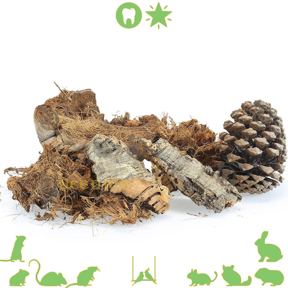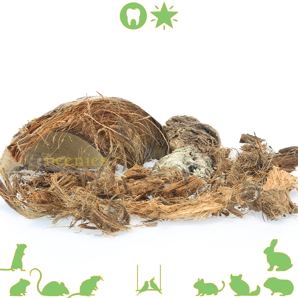 Inhoud: 125 gram | 250 gram Gemaakt van: Kokosnoot, Kurk en Dennenappel Geschikt voor: Alle Knaagdieren, Konijnen en Vogels