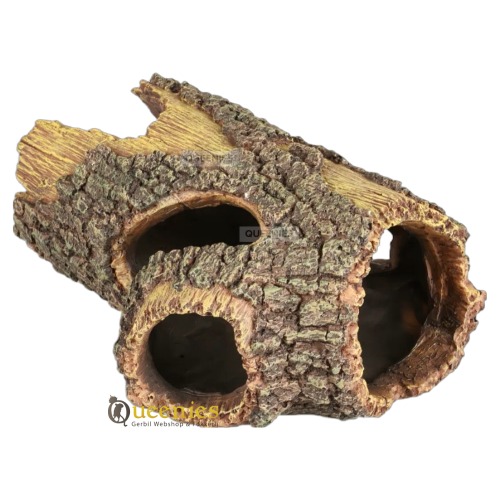 We bieden 2 mooie afmetingen aan van deze Kurkstam van Kunsthars. Beide zijn verschillend, zo hebben we een Kurktunnel van kunsthars met de afmeting van 30x8x8 cm. De diameter Ø is dan dus 8 cm, een mooie riante tunnel waar ook nog Syrische Goudhamsters doorheen kunnen lopen. De andere variant is een kortere Kurkstam, maar wel breder en met meerdere openingen. Deze kurkstam heeft de afmeting van 23x15x10 cm. De diameter Ø is dan 10 cm. De laatste genoemde variant is een prachtig product voor Gerbils. Omdat deze boomstam meerdere openingen heeft en een grote holle kamer, zullen Gerbils zich erg vertrouwd voelen als ze schuilen in deze kurktunnel.