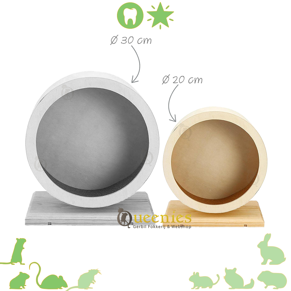 Een houten renrad voor gerbils of andere kleine knaagdieren heeft vaak niet de perfecte slag en is vaak ook niet helemaal stil. Door de kogellagers is dit Houten Renrad in 99 van de 100 gevallen erg stil. Maar u zult altijd geluid blijven horen wanneer uw Gerbil hierin rondrent. Soms is ook een kleine tik of slag zicht en hoorbaar. Het kan voorkomen dat hij niet 100% perfect ronddraait. Dat er een 'boggel' in het loopwiel zit. Dit symboliseert ook de natuur die ook niet altijd perfecte rechte paden heeft. Wel moet het loopwiel altijd rond kunnen draaien op een soepele manier. Wij controleren alle loopwielen die verstuurd worden of dit het geval is. Sommige dieren snappen het loopwiel niet goed. Zij schommelen dan een beetje in het loopwiel. Dit wil niet zeggen dat het loopwiel niet soepel rondgaat. U zal nooit een renrad ontvangen die niet voldoet aan deze eisen. Dit houten Renrad is erg natuurlijk gebouwd zoals aangegeven, daardoor is hij ook niet gelakt of is het hout niet perfect afgeschuurd. Er kunnen verdwaalde splinters in het hout zitten. Doordat het product niet is gelakt, is het 100% veilig voor uw knaagdier, maar kan er ook urine of nare luchtjes in trekken. Vaak gebeurt dit pas na een lange tijd en is het renrad ook wel een keer aan vervaning toe. Het loopvlak van deze Houten Renrad bestaat uit losse houtjes die aan elkaar zijn gemonteerd door een gleuf en een beetje diervriendelijke houtlijm. Het kan voorkomen dat er kleine spleetjes tussen de houtjes zitten. U hoeft niet bang te zijn dat uw knaagdier zich hier aan openhaalt of aan bezeert.