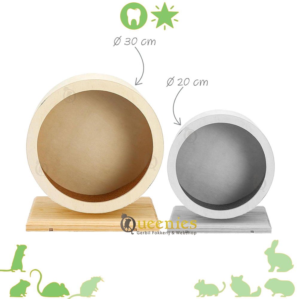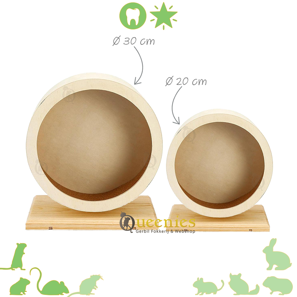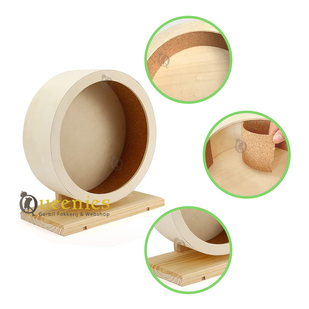 Een houten renrad voor gerbils of andere kleine knaagdieren heeft vaak niet de perfecte slag en is vaak ook niet helemaal stil. Door de kogellagers is dit Houten Renrad in 99 van de 100 gevallen erg stil. Maar u zult altijd geluid blijven horen wanneer uw Gerbil hierin rondrent. Soms is ook een kleine tik of slag zicht en hoorbaar. Het kan voorkomen dat hij niet 100% perfect ronddraait. Dat er een 'boggel' in het loopwiel zit. Dit symboliseert ook de natuur die ook niet altijd perfecte rechte paden heeft. Wel moet het loopwiel altijd rond kunnen draaien op een soepele manier. Wij controleren alle loopwielen die verstuurd worden of dit het geval is. Sommige dieren snappen het loopwiel niet goed. Zij schommelen dan een beetje in het loopwiel. Dit wil niet zeggen dat het loopwiel niet soepel rondgaat. U zal nooit een renrad ontvangen die niet voldoet aan deze eisen. Dit houten Renrad is erg natuurlijk gebouwd zoals aangegeven, daardoor is hij ook niet gelakt of is het hout niet perfect afgeschuurd. Er kunnen verdwaalde splinters in het hout zitten. Doordat het product niet is gelakt, is het 100% veilig voor uw knaagdier, maar kan er ook urine of nare luchtjes in trekken. Vaak gebeurt dit pas na een lange tijd en is het renrad ook wel een keer aan vervaning toe. Het loopvlak van deze Houten Renrad bestaat uit losse houtjes die aan elkaar zijn gemonteerd door een gleuf en een beetje diervriendelijke houtlijm. Het kan voorkomen dat er kleine spleetjes tussen de houtjes zitten. U hoeft niet bang te zijn dat uw knaagdier zich hier aan openhaalt of aan bezeert.