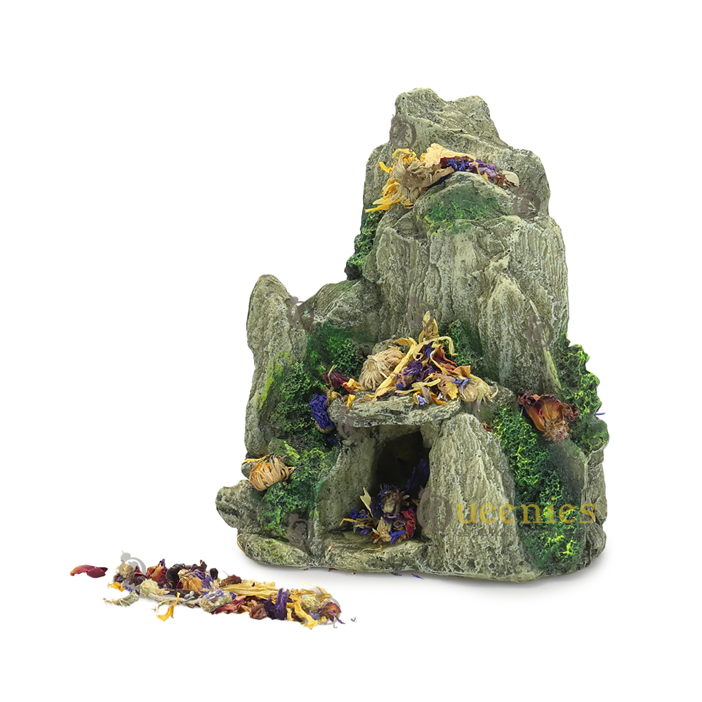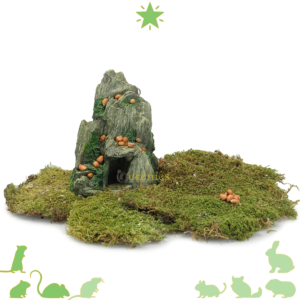 Voeg wat gedroogd Terrarium mos toe aan de basis van de Aqua Rots en plaats er kleine (veilig voor Knaagdieren!) planten omheen. Dit zorgt voor een natuurlijke look en geeft een bosachtige sfeer aan het verblijf. Door wat eetbare of veilige plantjes toe te voegen, creëer je bovendien een natuurlijke snackplek voor je Hamster.
