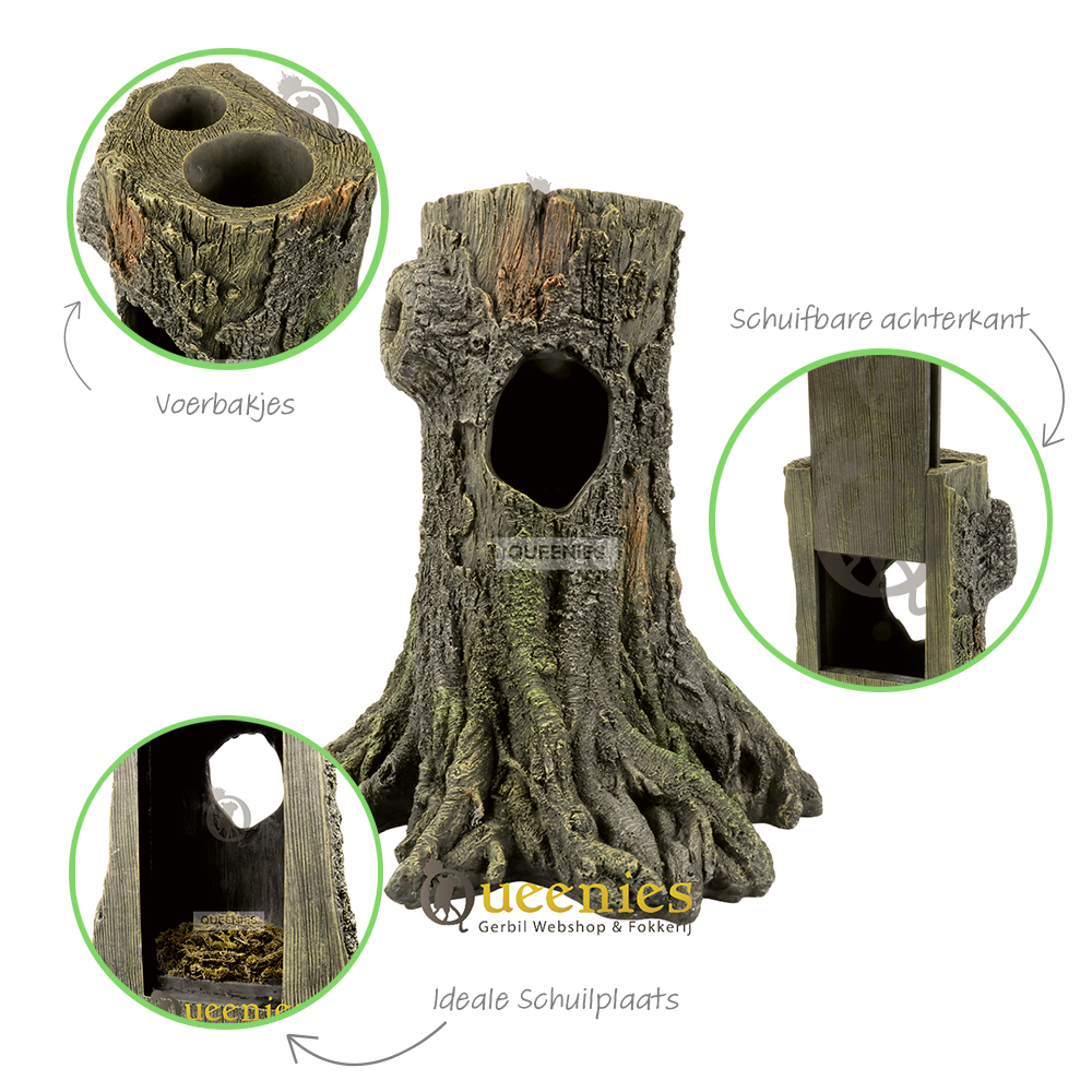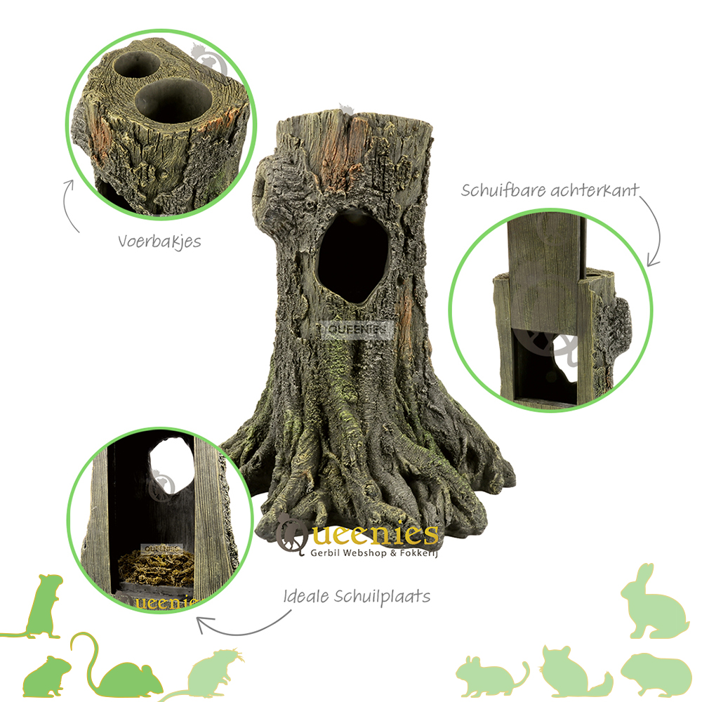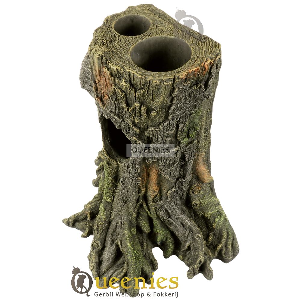 Deze Boomstam Huis voor Hamsterscaping 25 cm heeft meerdere voordelen. Allereerst is het een mooie decoratief element in een Knaagdieren Terrarium. Maar ook is deze Boomstam Huis gaaf omdat het eruit ziet als echt hout, dit geeft een natuurlijke uitstraling de Dwerghamsterkooi. Ook heeft het verschillende schuil mogelijkheden voor Muisjes of een Dwerghamster. Kleine Knaagdieren trekken zich graag terug wanneer ze rust nodig hebben, deze Boomstam is daarvoor ideaal geschikt. Ook zijn er mogelijkheden om voedsel te verstoppen in de Boomstam Huis. Een belangrijk onderdeel in de dagelijkse bezigheden van een Dwerghamster. Voedsel zoeken, verzamelen en verstoppen. Het wel bekende 'Hamsteren' Zoals hierboven al een keer genoemd is kunnen de Muizen het verblijf op andere hoogte verkennen. Een Muis houdt er erg van om te klimmen en Klauteren, dit Boomstam Huisje geeft hiervoor meerdere mogelijkheden. Het kan zowel van buitenaf op geklommen worden, als binnenin kan erin geklommen worden.