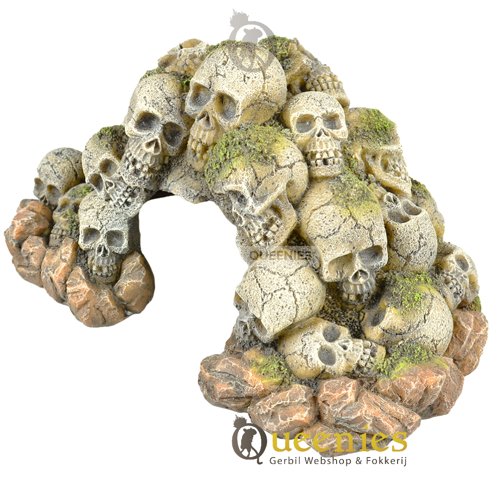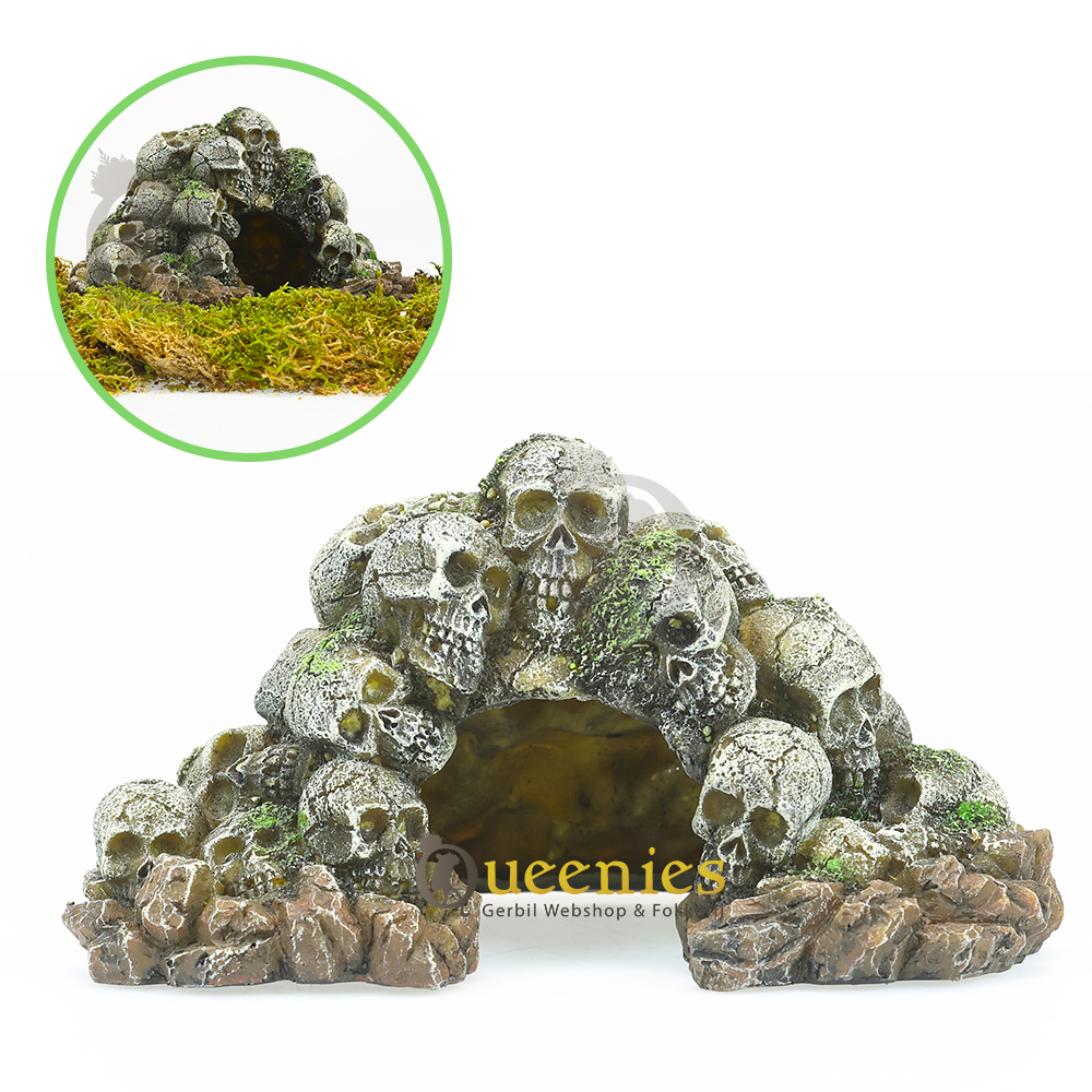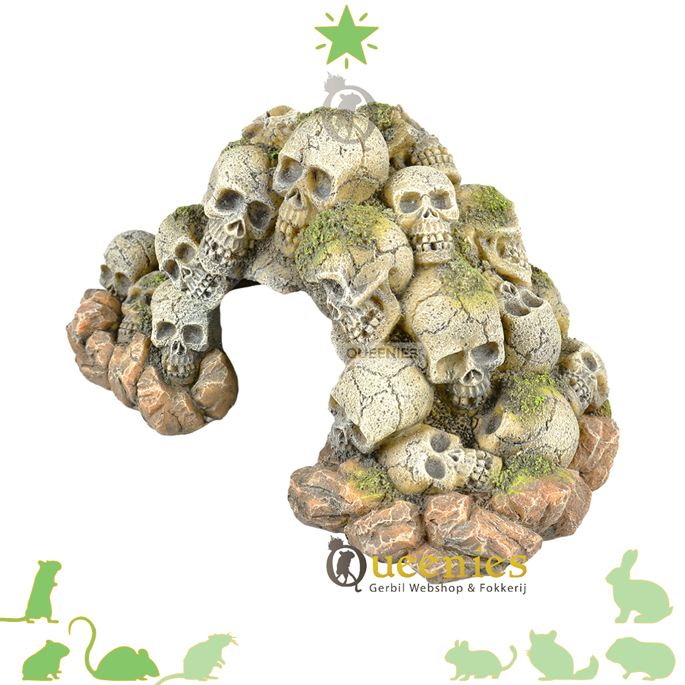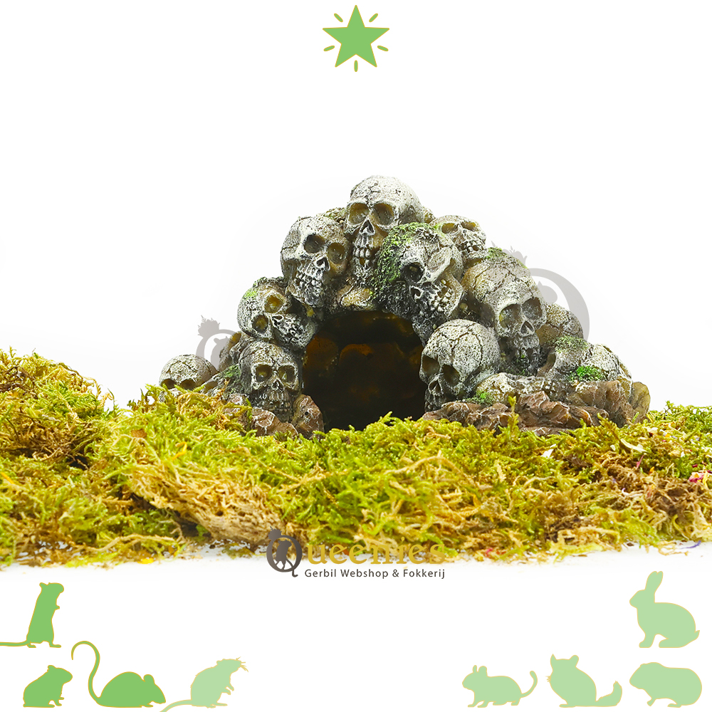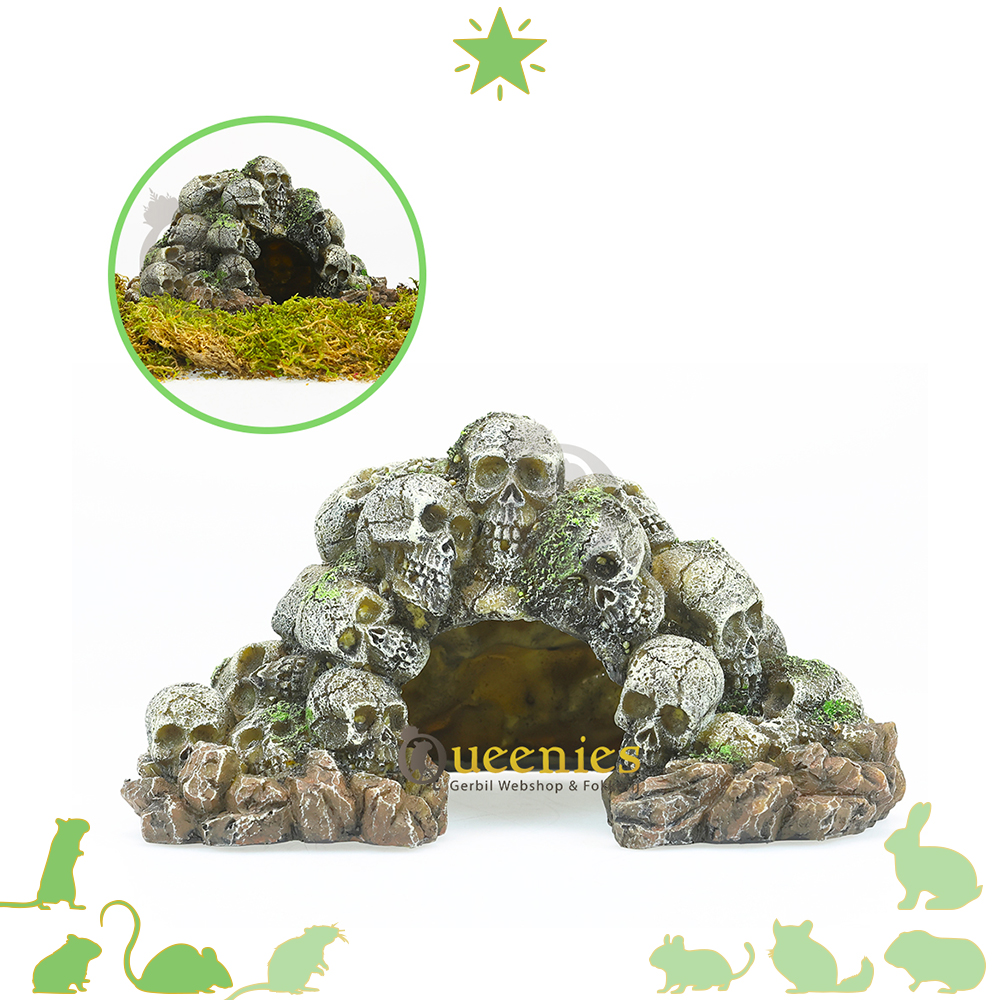 Deze Doodshoofd Grot is een super leuke, uniek decoratief element. Dat een mystiek toevoegt aan het verblijf van een Hamster. Zoals hierboven al genoemd is, vinden Hamsters het fijn om een schuilplaats te hebben. Deze Doodshoofd Grot voldoet hieraan op een net iets andere manier dan normale groten.Omdat de Doodshoofd Grot een open onderkant heeft is het zoals hierboven al genoemd ideaal voor Hamsterscaping/Gerbilscaping. Door de open onderkant kan er bijvoorbeeld hooi onder geplaatst worden. Knaagdieren zoals Gerbil vind het erg fijn om te kunnen graven. De Gerbils kunnen dan de Doodshoofd Grot gebruiken als schuilplaats. Hamsters zijn meer verzamel dieren. Hamsters vinden het fijn om verzamelen. Hamsters kunnen bijvoorbeeld hooi bij elkaar verzamelen en de Doodshoofd Grot gebruiken als opslag plaats. Hierdoor heeft de Doodshoofd grot meerdere functies. Het kan als schuilplaats en opslag plek gebruikt worden. Ook is het een leuk gesprek onderwerp voor als er gasten langskomen. Je ziet niet vaak een doodshoofd grot in een Knaagdieren verblijf.