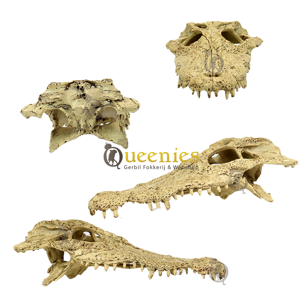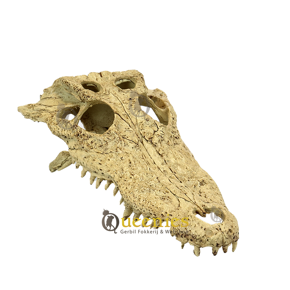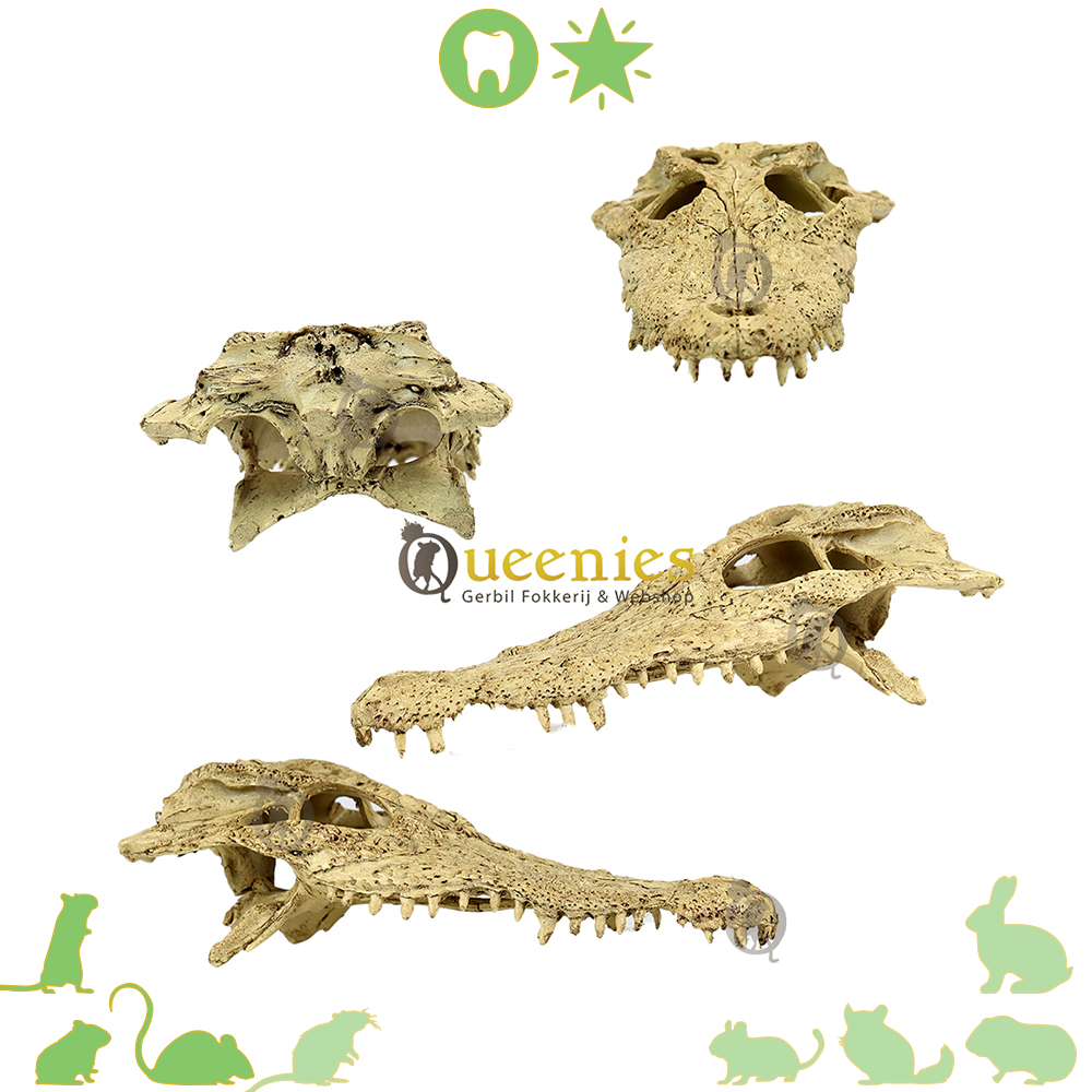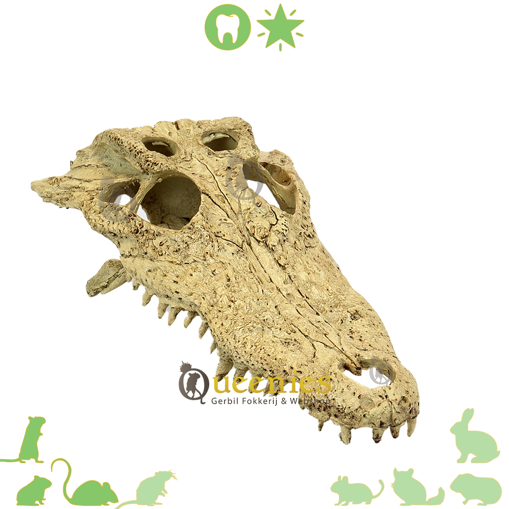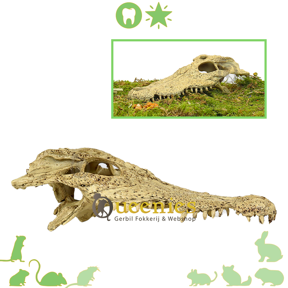 De Exo Terra Primate skull artikelen zoals deze Krokodillen schedel of de T-Rex schedel worden gemaakt van absoluut 100% veilige materialen voor Knaagdieren zoals Gerbils en Hamsters. Het zijn mooie schuilplaatsen met een heel realistisch uiterlijk die een spannend accent toevoegen aan elk type Terrarium / Gerbilarium. Deze schuilplaatsen zijn makkelijk bereikbaar dankzij de vele ingangen die deze Krokodillen schedel heeft. De Gerbils, maar ook Dwerghamsters kunnen door de gaten tunnelsystemen aanleggen. Ook kunnen zij erop klimmen en klauteren en de nageltjes slijten op een natuurlijke manier. Het product is te hard om kapot te knagen door Gerbils, daarnaast vinden Gerbils het ook geen fijn matteriaal om op te knagen waardoor het altijd mooi intact blijft. Geweldige artikelen die niet kapot gemaakt kunnen worden door gerbils vindt u in deze categorie 'Natuurlijke Inrichting' en veilig zijn voor gerbils!