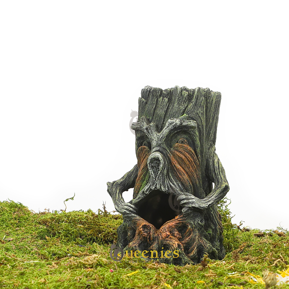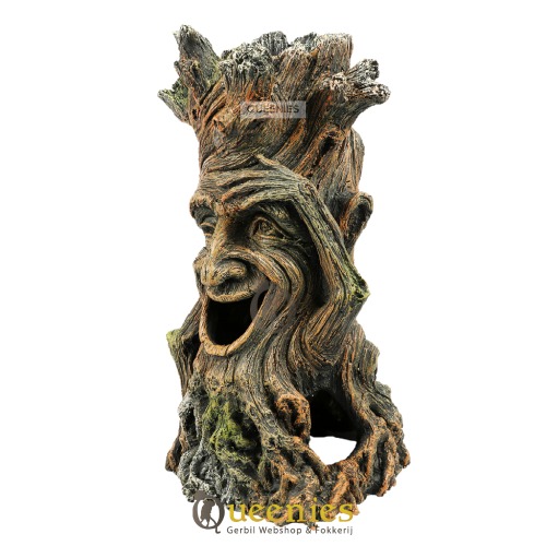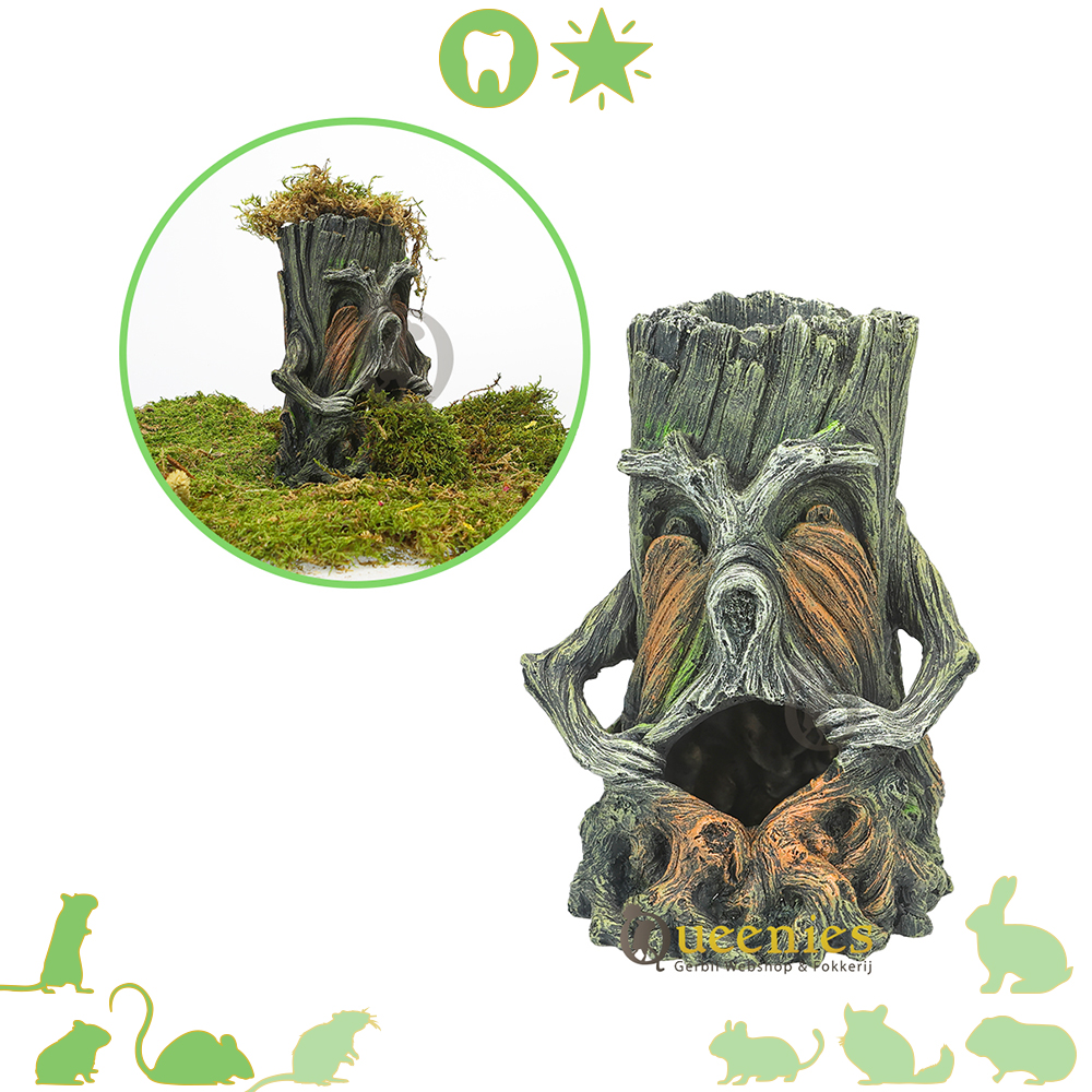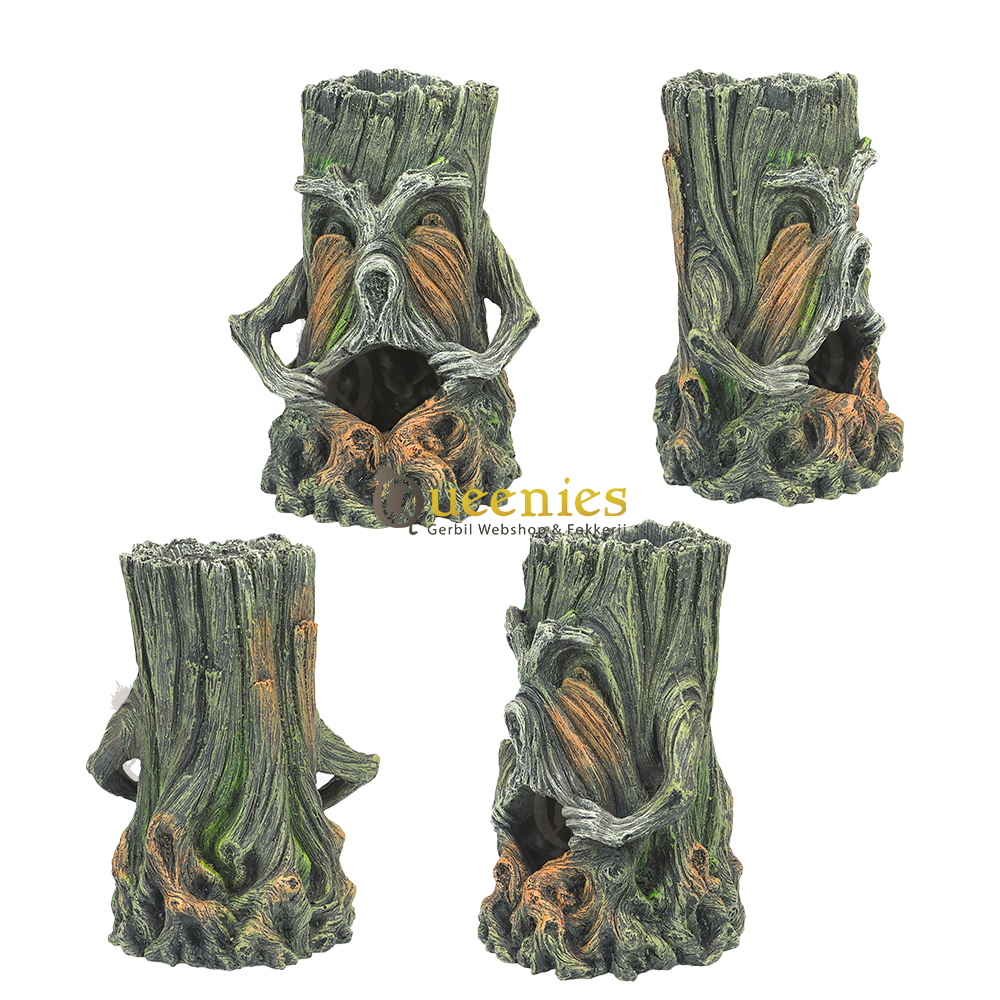 Prachtige holle Boomstam met gezicht van kunsthars. Een mooi stukje Knaagdieren Terrarium accessoires wanneer u graag aan Hamsterscaping doet of wilt gaan doen. Het voordeel van dit mooi stukje kunsthars is dat het altijd mooi zal blijven. het niet aangeknaagd kan worden door Knaagdieren of Gerbils. Ook is de afmeting van deze holle boomstam precies goed wanneer u Gerbils of een Dwerghamster heeft. Via de mond kunnen deze kleine dieren mooi holle boomstam betreden en daar hun nestje bouwen of een snackplaats ervan maken. De boomstam is zowel via de onderkant, de voorkant alsmede de bovenkant te benaderen doordat dit allemaal openingen zijn die de holle boomstam heeft.