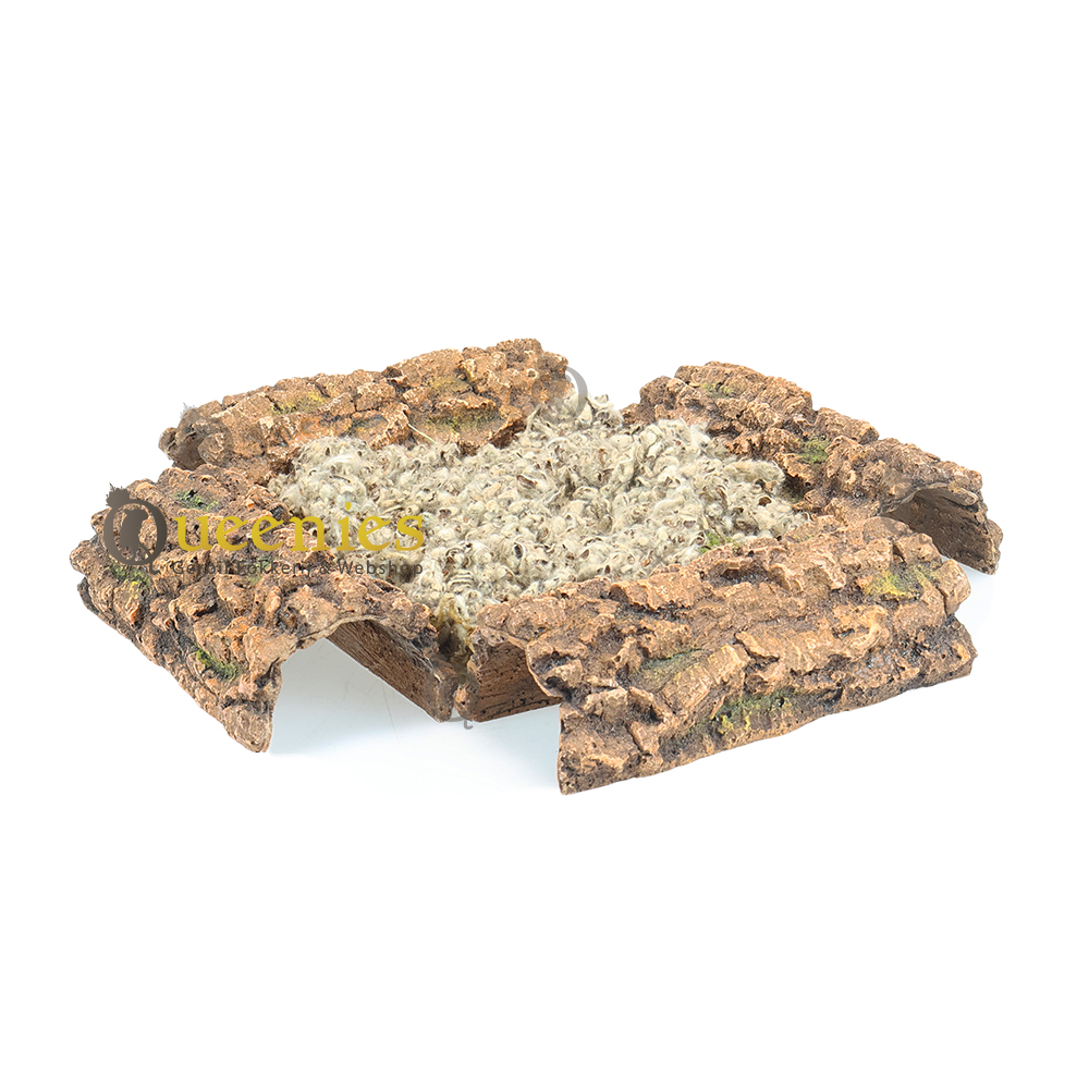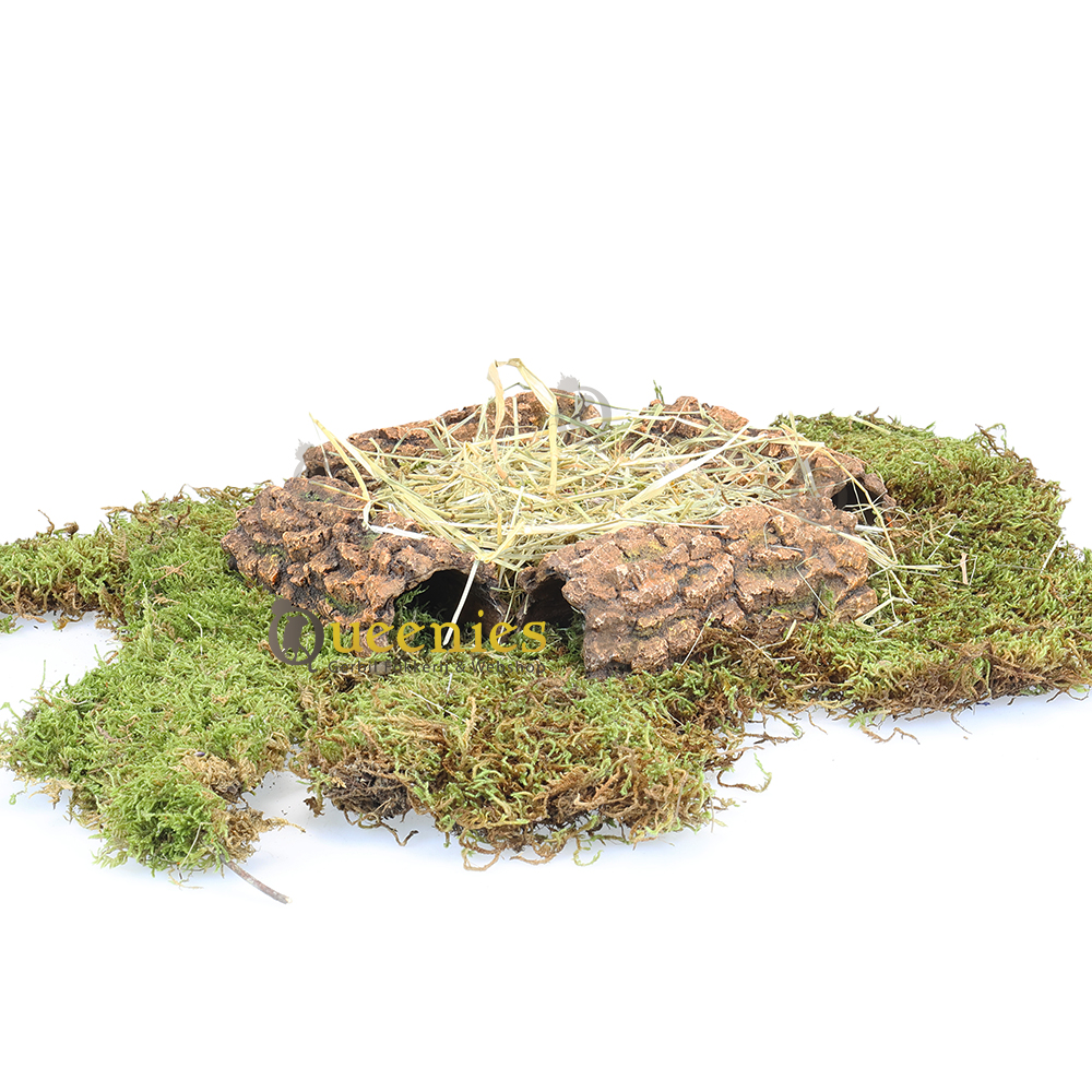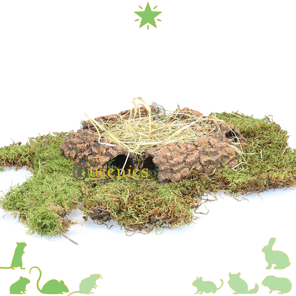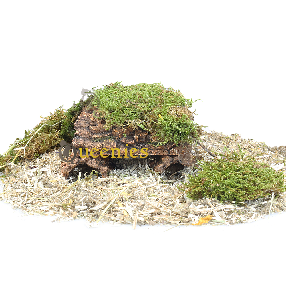 Een met mos bedekte schuilplaats waarbij kleine boomstammen of kurkstukken worden gebruikt om een meer complexe structuur te creëren is het ultieme verblijf voor een Hamster. Zo kan hij of zij zich goed verstoppen, schuilplekjes creeren en of voorraadkamers maken. Het mos biedt extra textuur en kan helpen om de luchtvochtigheid in de leefomgeving te behouden. Dit houdt in dat terrarium nooit te vochtig kan worden omdat dit erg goed wordt geabsorbeerd door het Mos. Eventuele plasjes verdwijnen uit het ‘niets’.